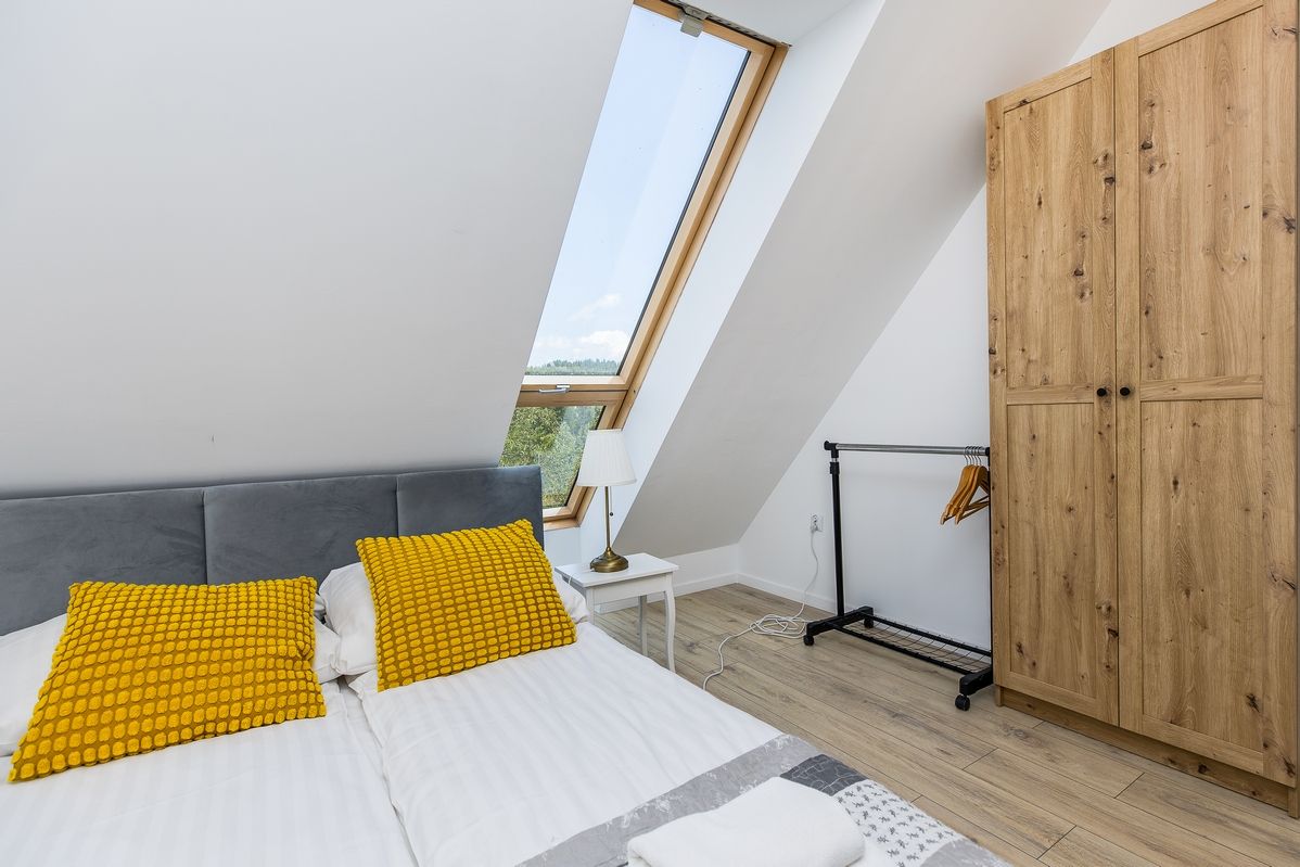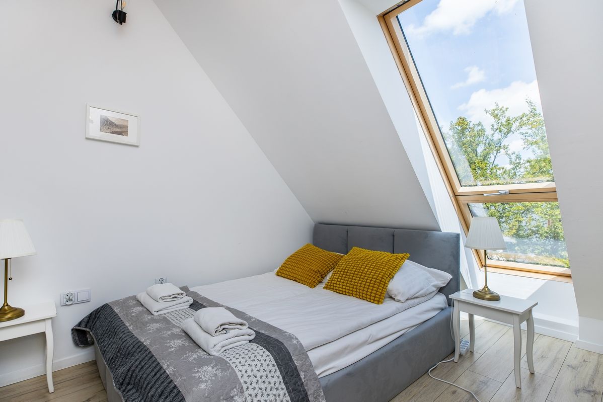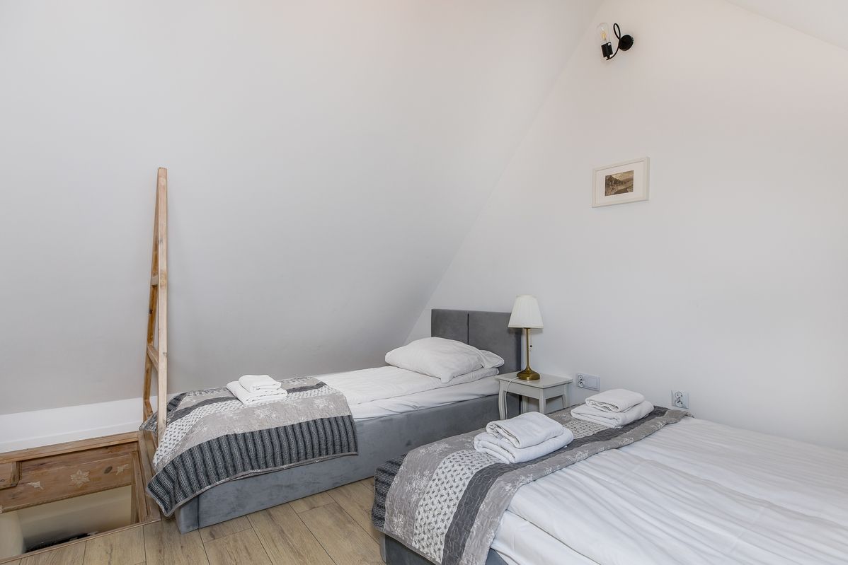 Sypialnia na antresoli: łóżko 2 osobowe, 2 pojedyncze łóżka, pościel.