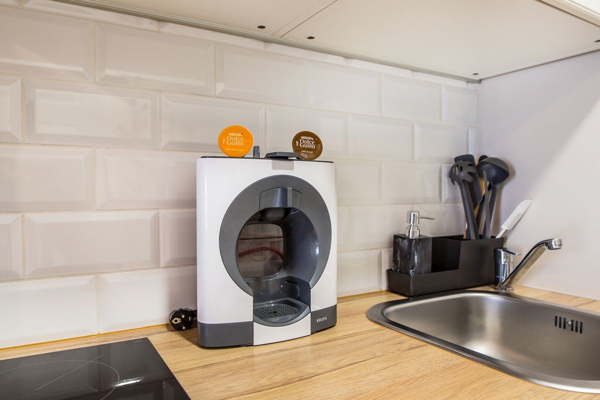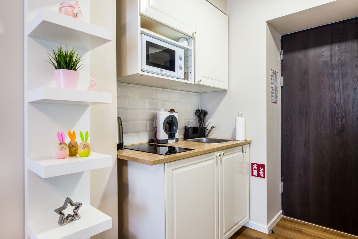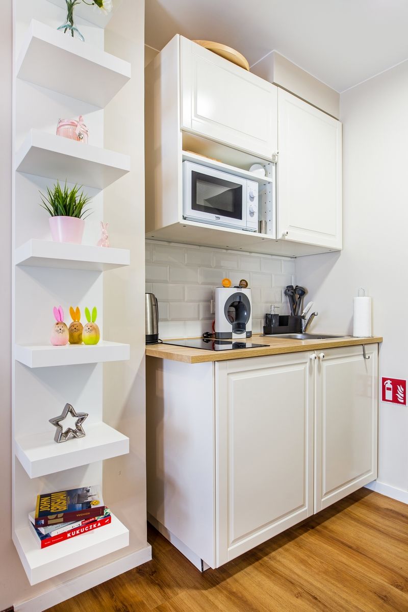 Kuchnia: aneks kuchenny - kuchenka, lodówka,mikrofala, toster, ekspres do kawy, czajnik, naczynia kuchenne.