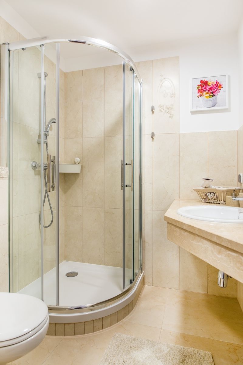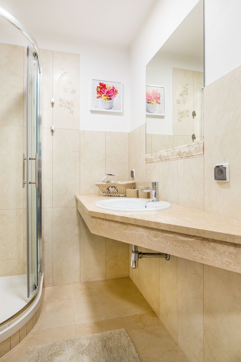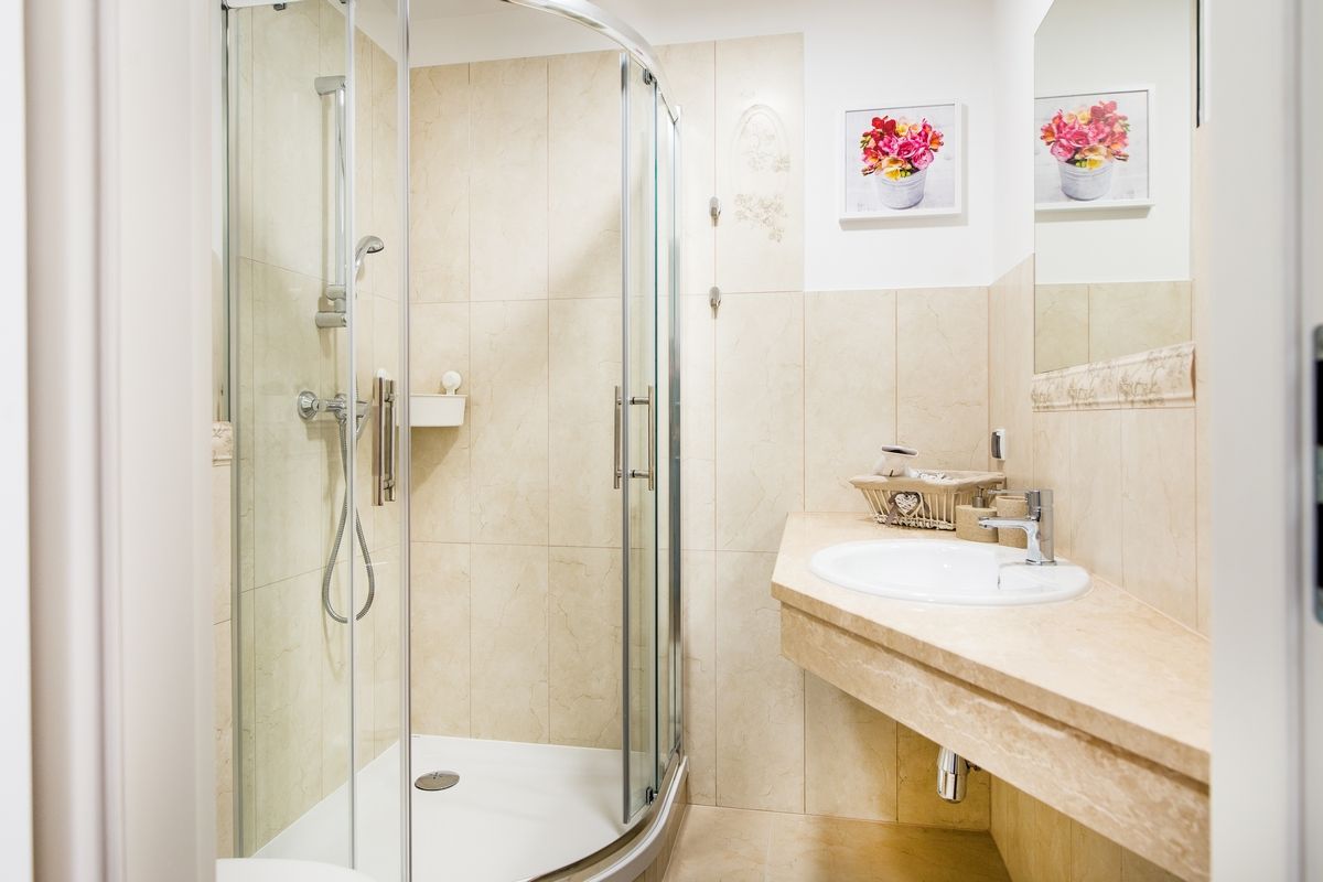 Łazienka: prysznic, suszarka do włosów, ręczniki, mydło.