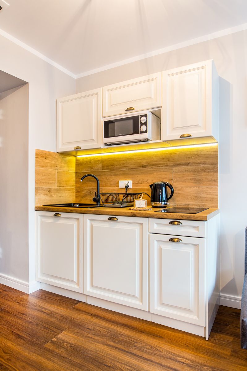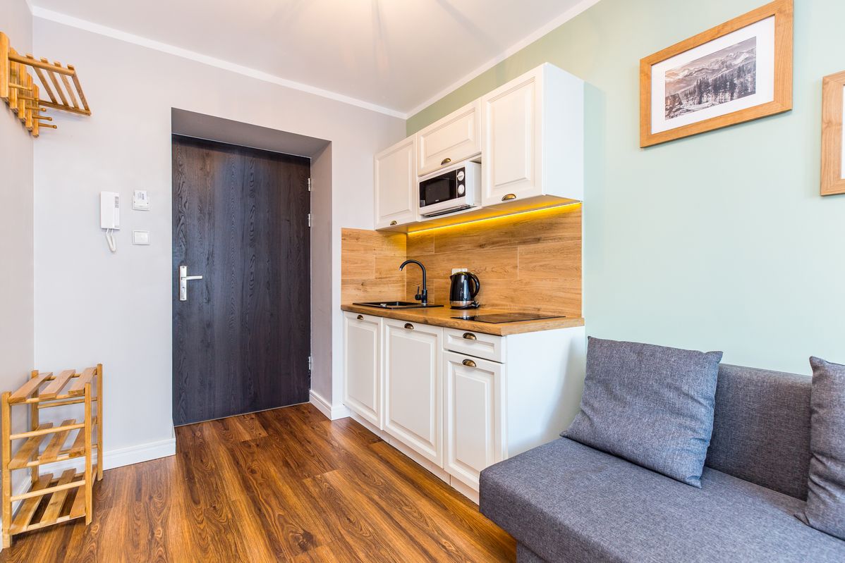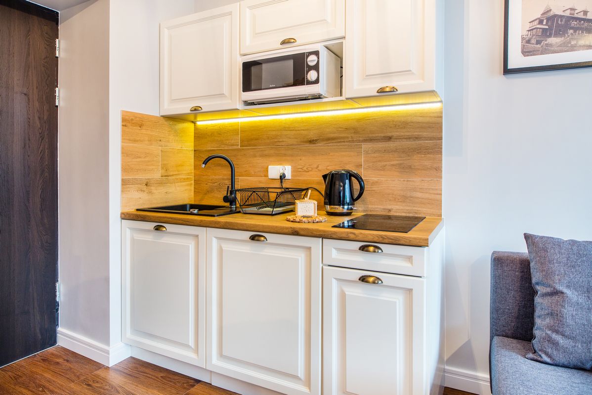Kuchnia: aneks kuchenny - kuchenka, lodówka, czajnik, mikrofala, naczynia kuchenne