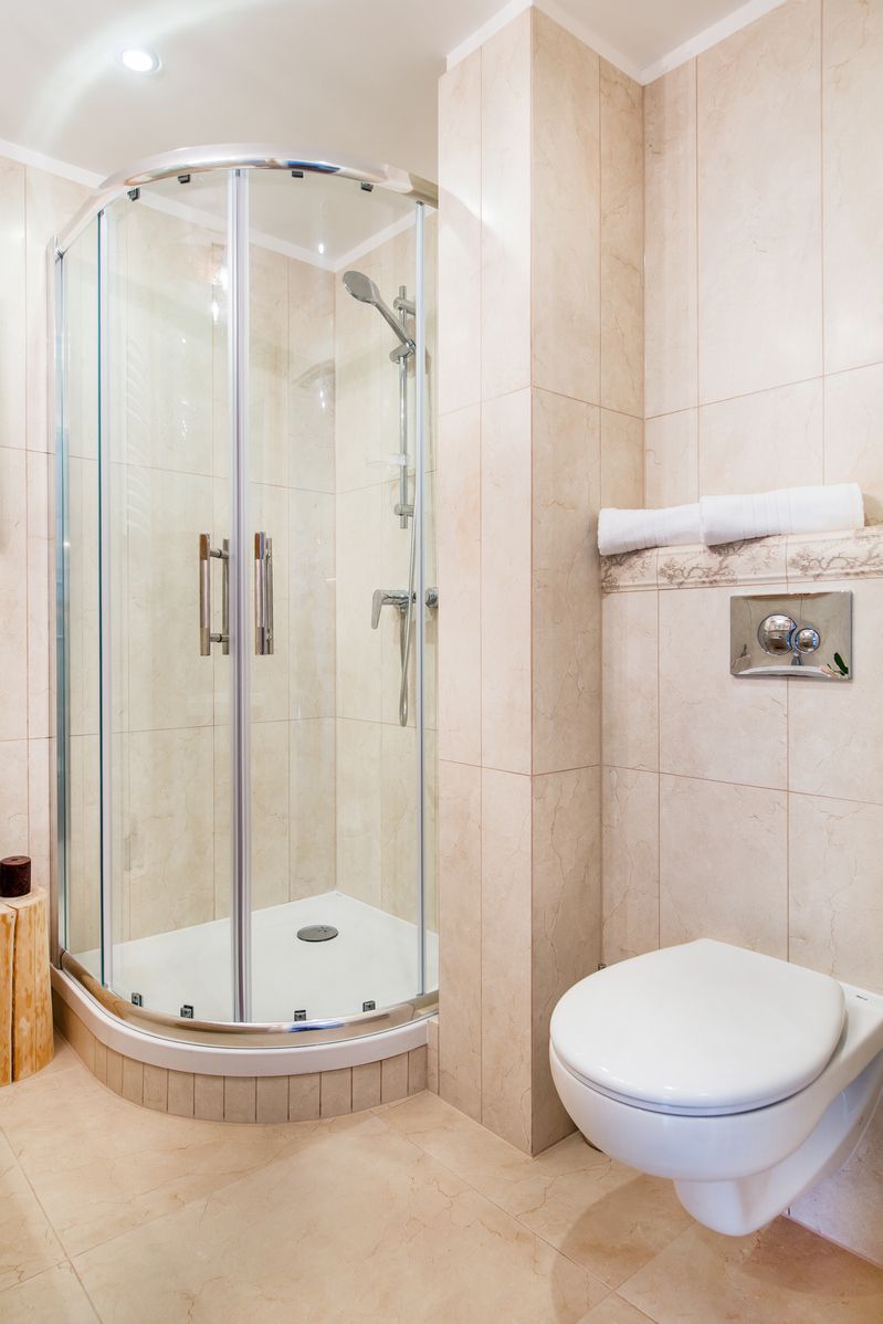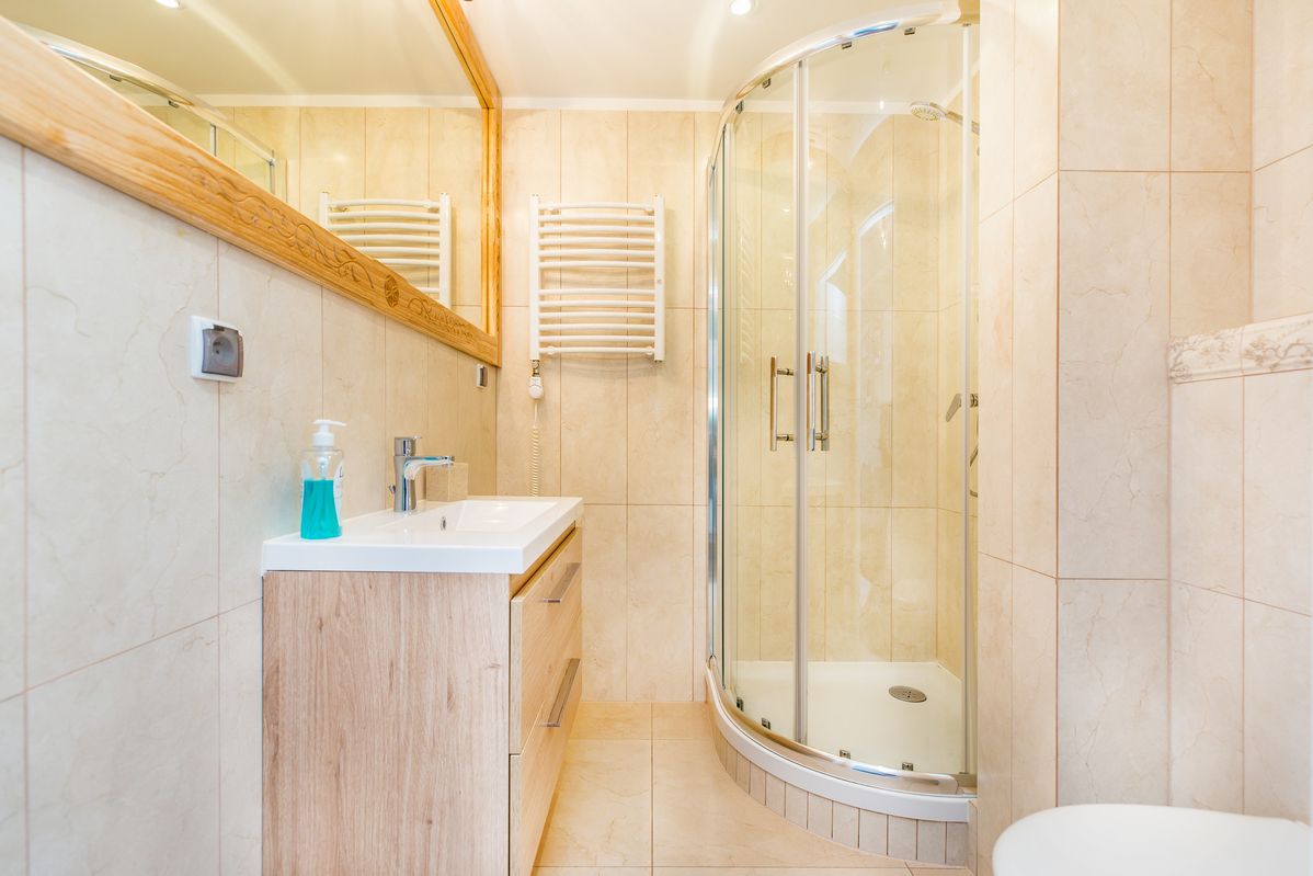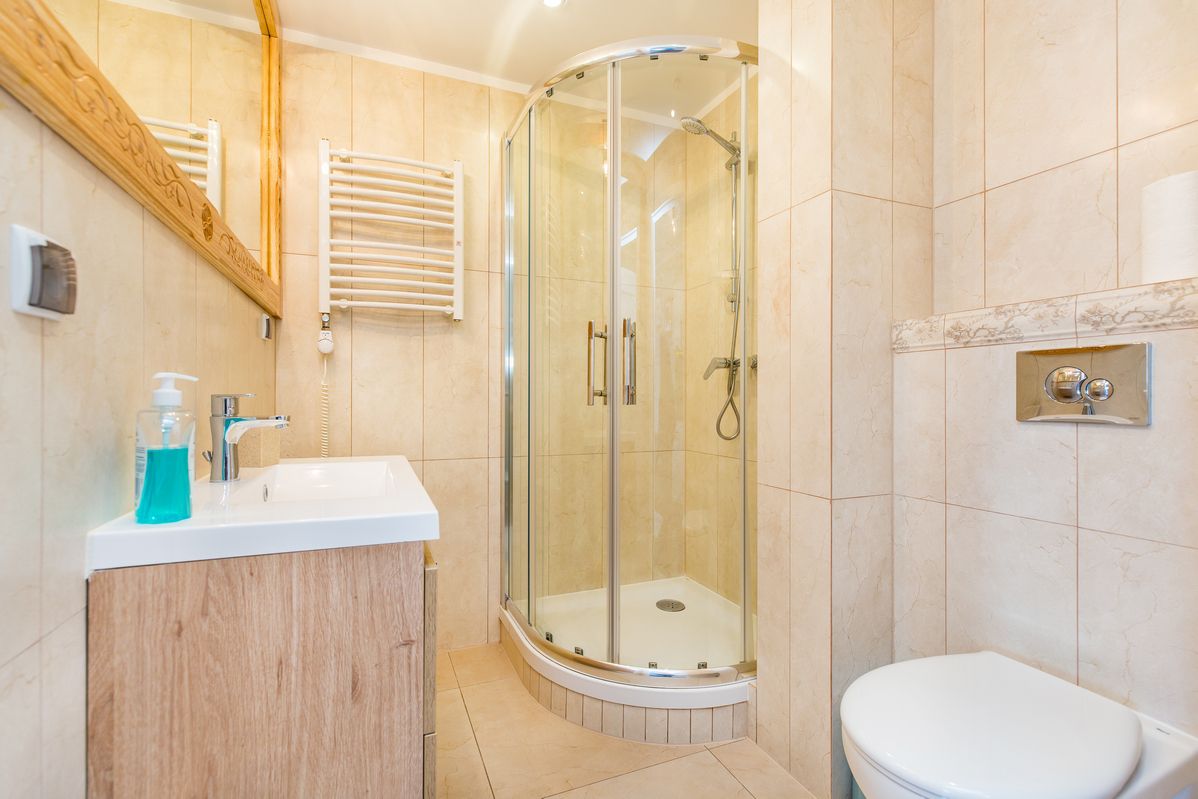 Łazienka: prysznic, suszarka do włosów, ręczniki, mydło