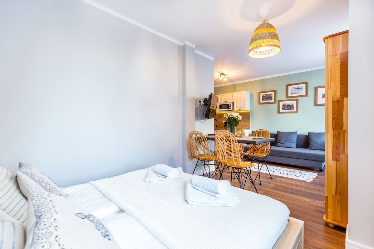 O apartamencie:Apartament zlokalizowany jest na I piętrze. Powierzchnia łączna apartamentu to 25 m2 (nie licząc powierzchni łazienki). Mieszkanie zapewnia komfort oraz domową atmosferę. Idealny dla max 4 osób. Bardzo dużym atutem jest przynależny 15 m taras.