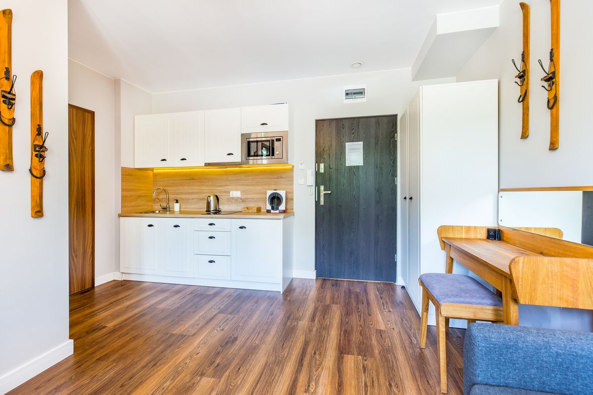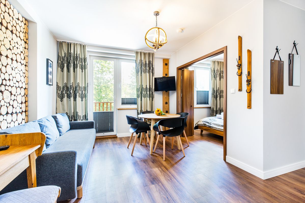 Apartament zlokalizowany jest na pierwszym piętrze . Powierzchnia łączna apartamentu to 28m2. Składa się z aneksu kuchennego połączonego z salone, oddzielnej sypialni , łazienki oraz przynależnego balkonu. Mieszkanie zapewnia komfort oraz domową atmosferę. Idealny dla max 4 osób.