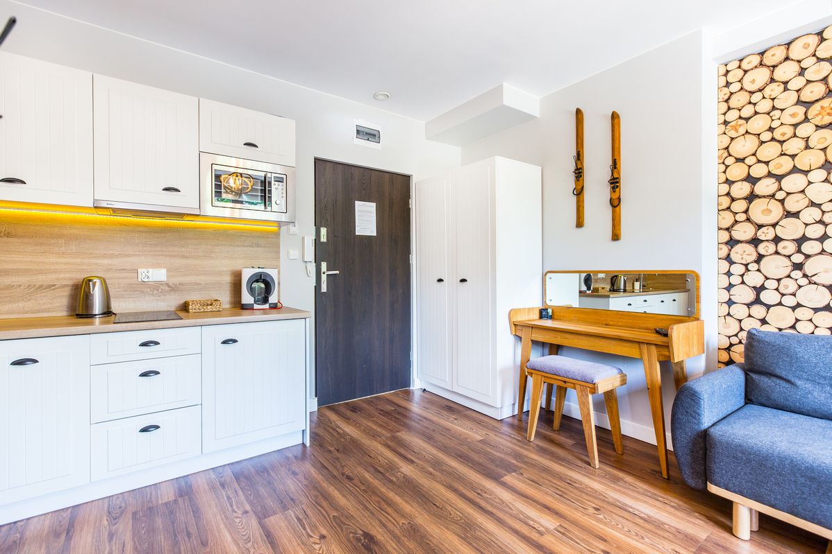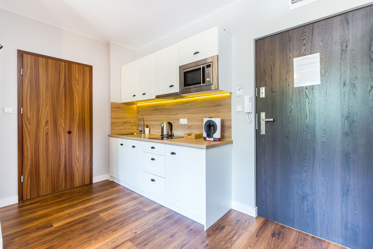 Każdy apartament wyposażony jest w podstawowe środki chemiczne oraz mop z wiaderkiem.