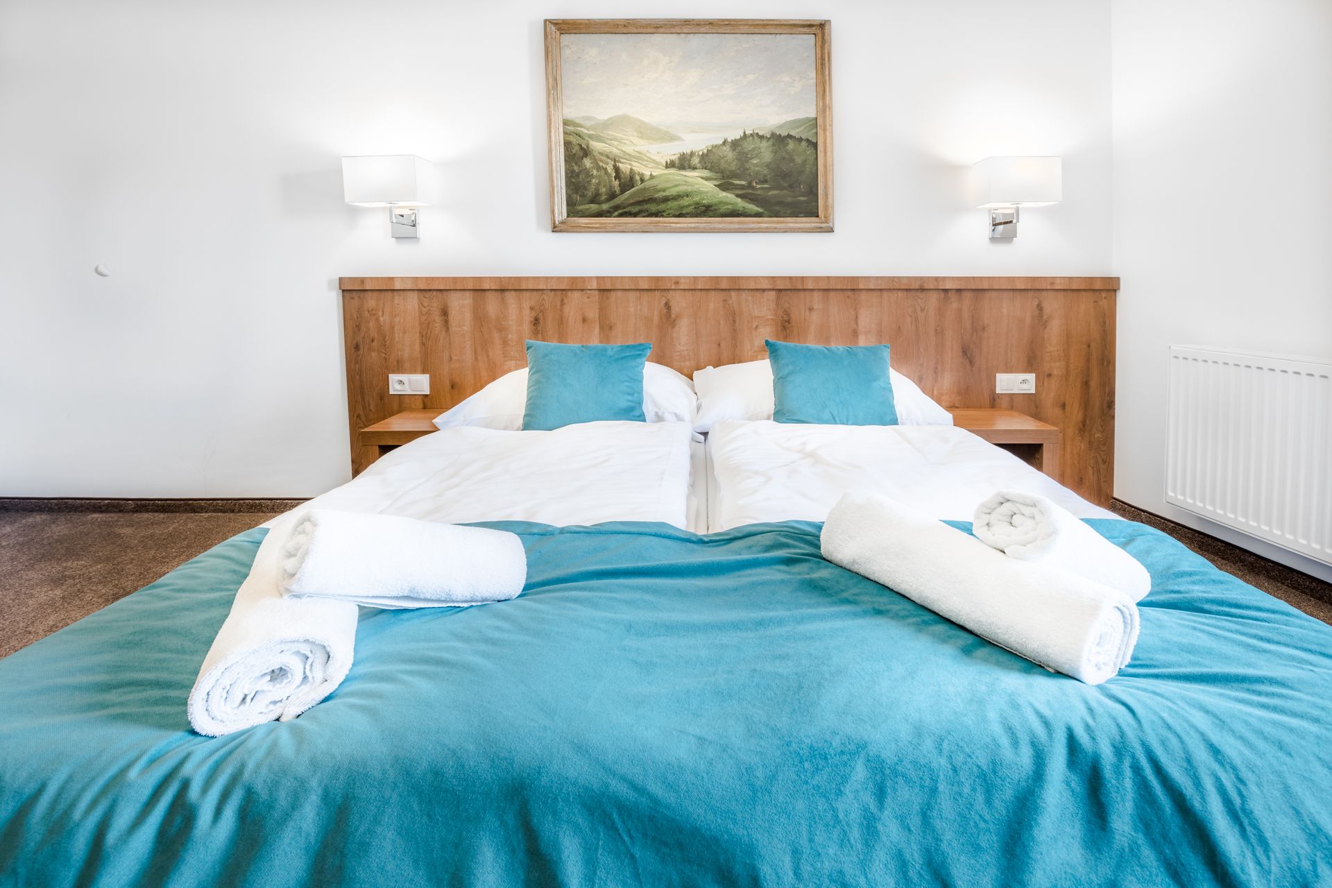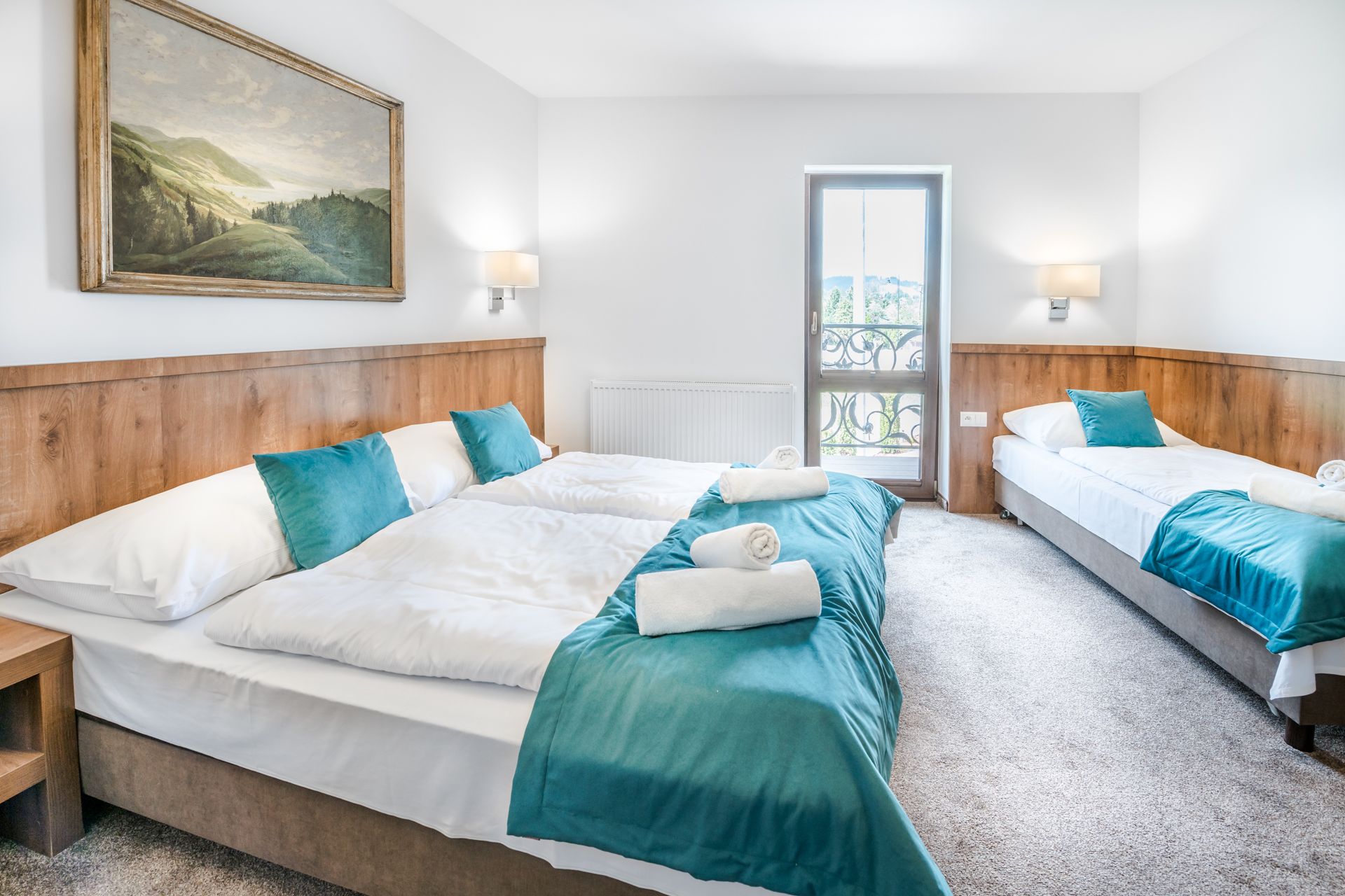 Komfortowe trzyosobowe pokoje, z możliwością dostawki dla dziecka.