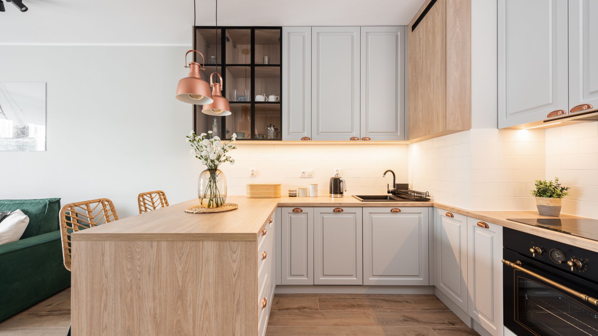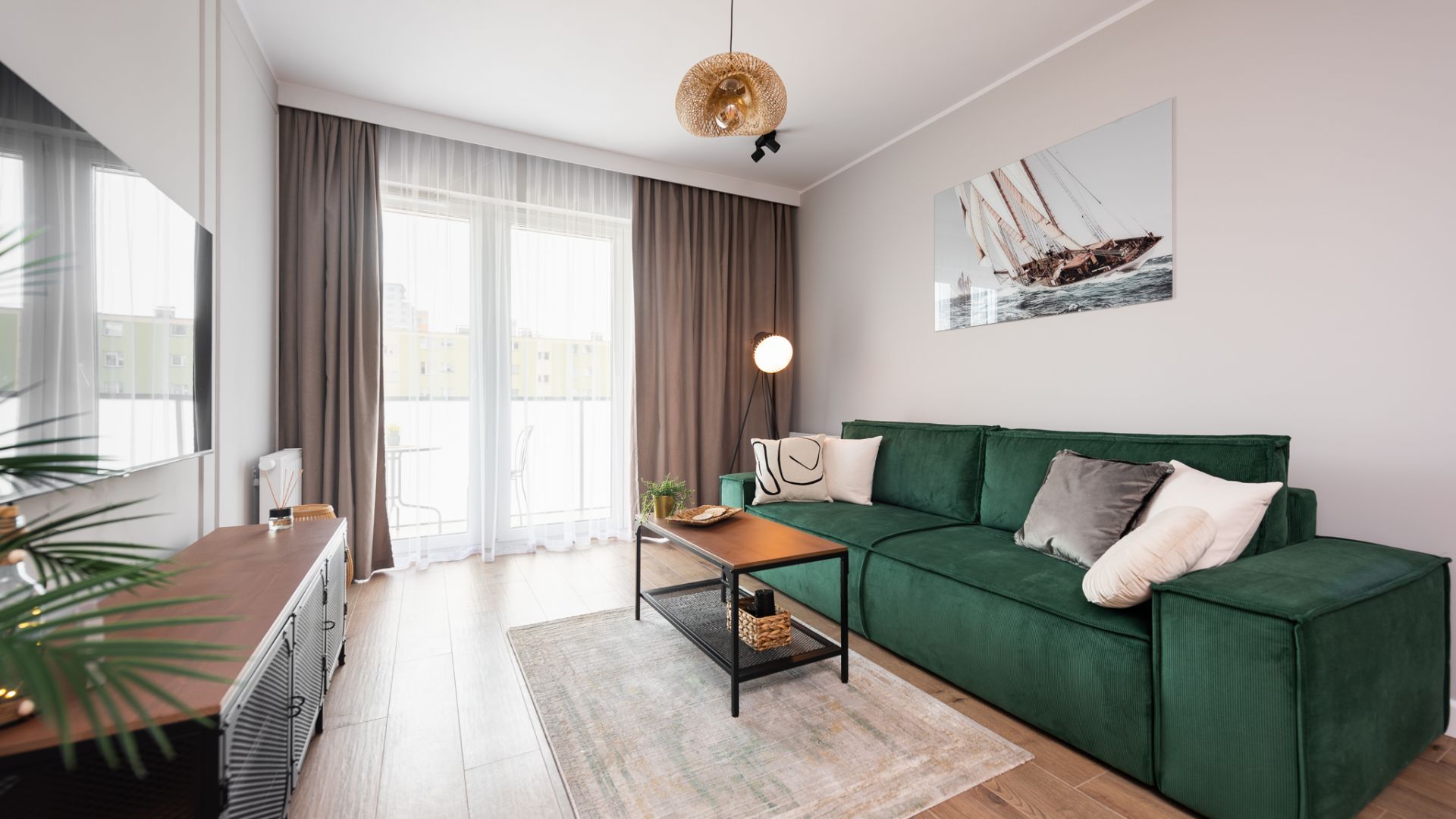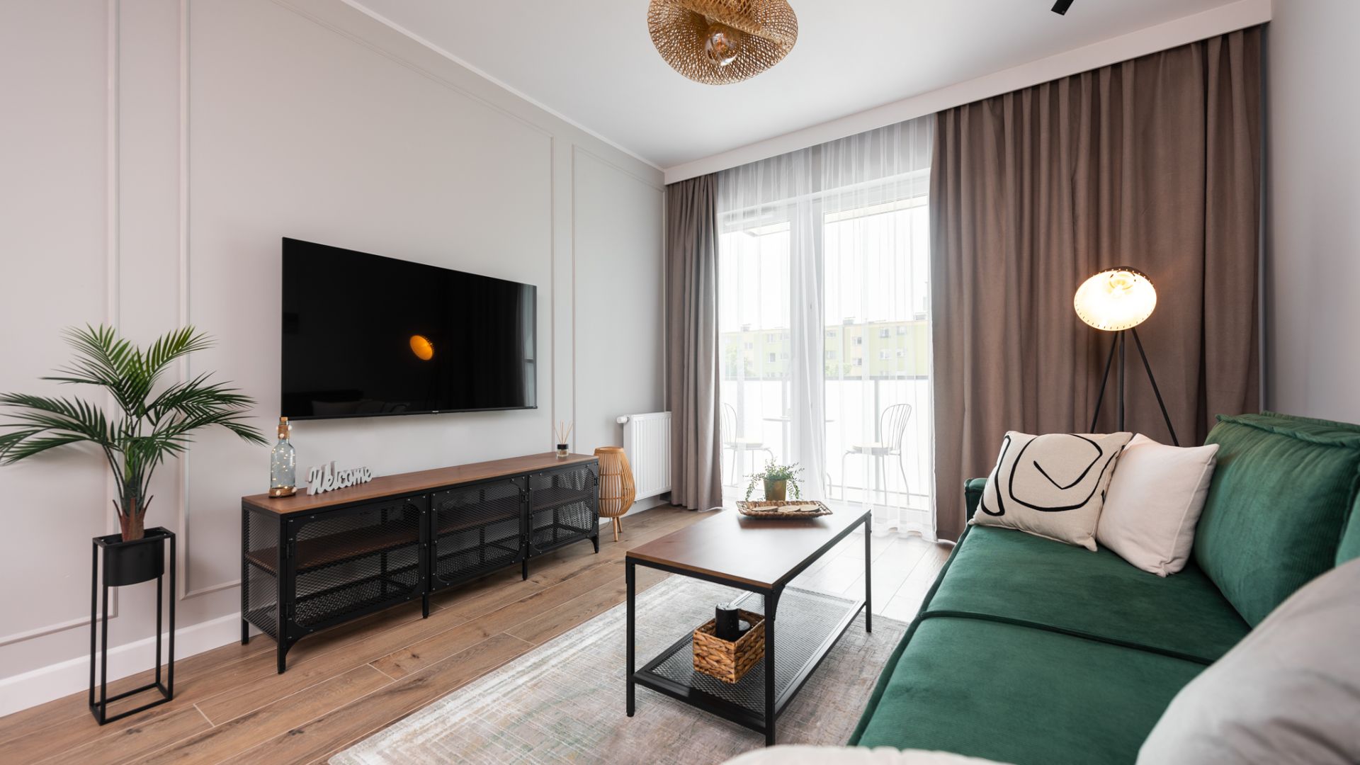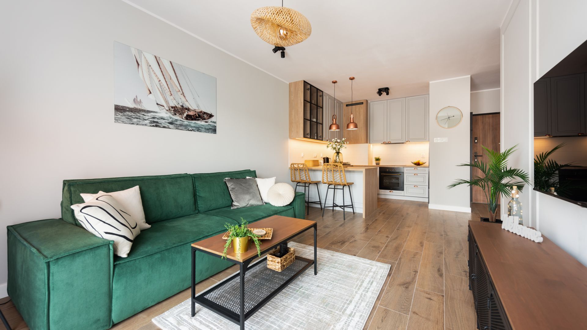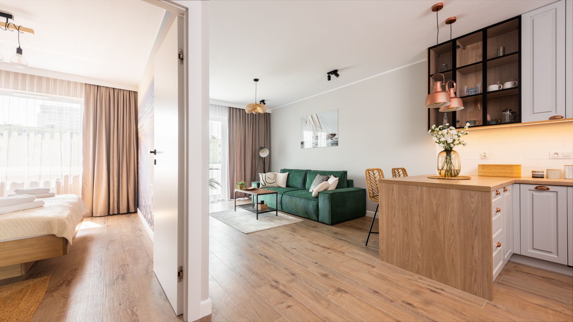 Wnętrze zostało zaprojektowane w nowoczesnym stylu z dbałością o detale. Salon z wygodną, zieloną sofą i miedzianymi akcentami to serce domu. Dużym atutem jest przestronny balkon wyposażony w stolik i krzesła, który stanowi naturalne przedłużenie strefy dziennej i jest doskonałym miejscem na odpoczynek po dniu pełnym wrażeń. Aneks kuchenny z funkcjonalną wyspą posiada wszystko, co niezbędne do przygotowywania posiłków.