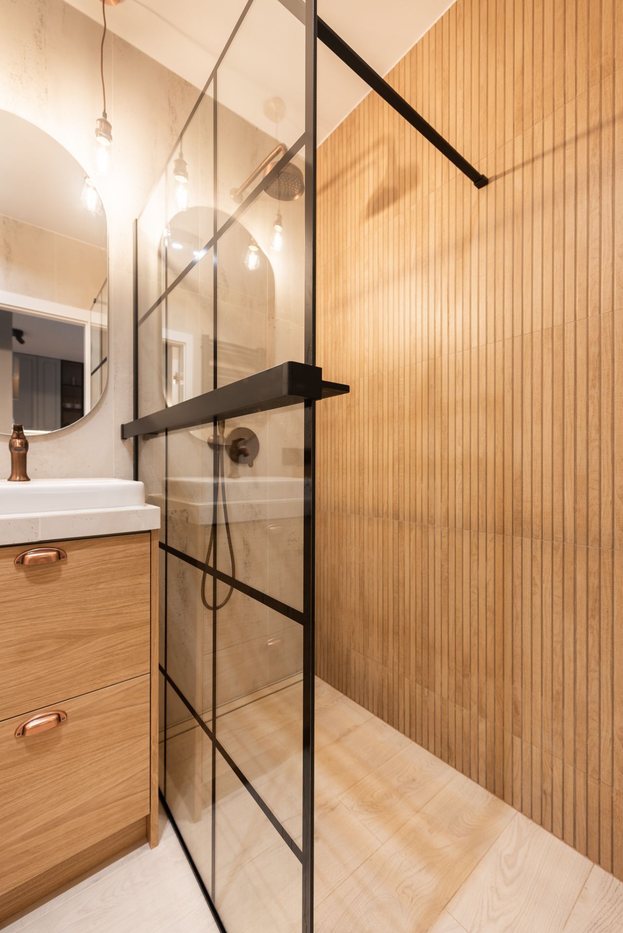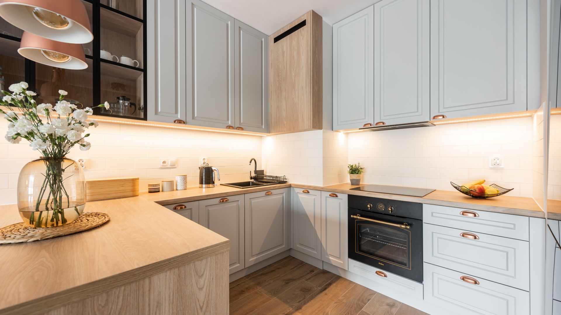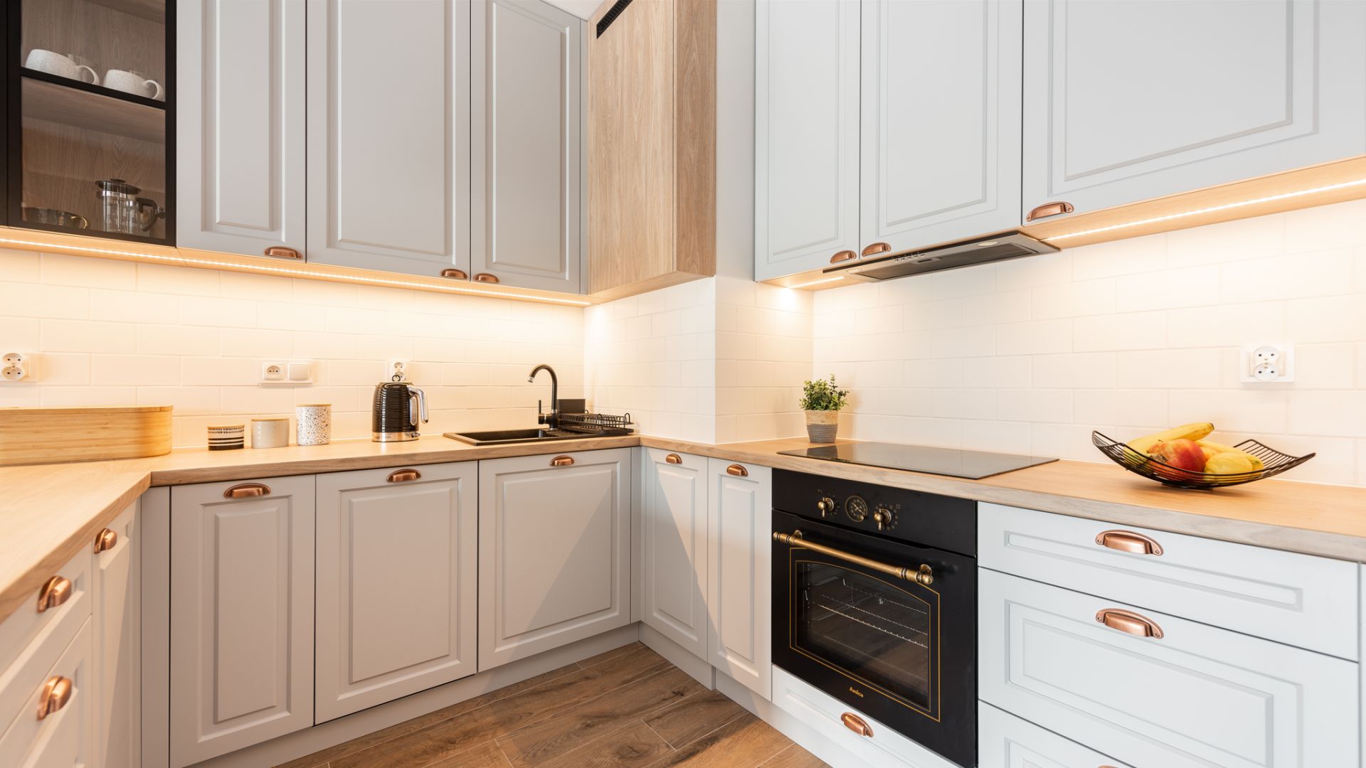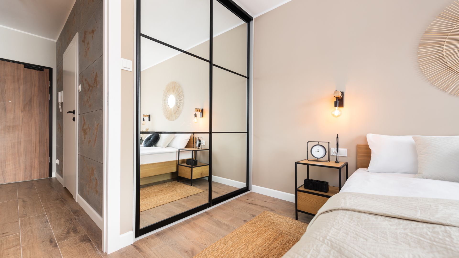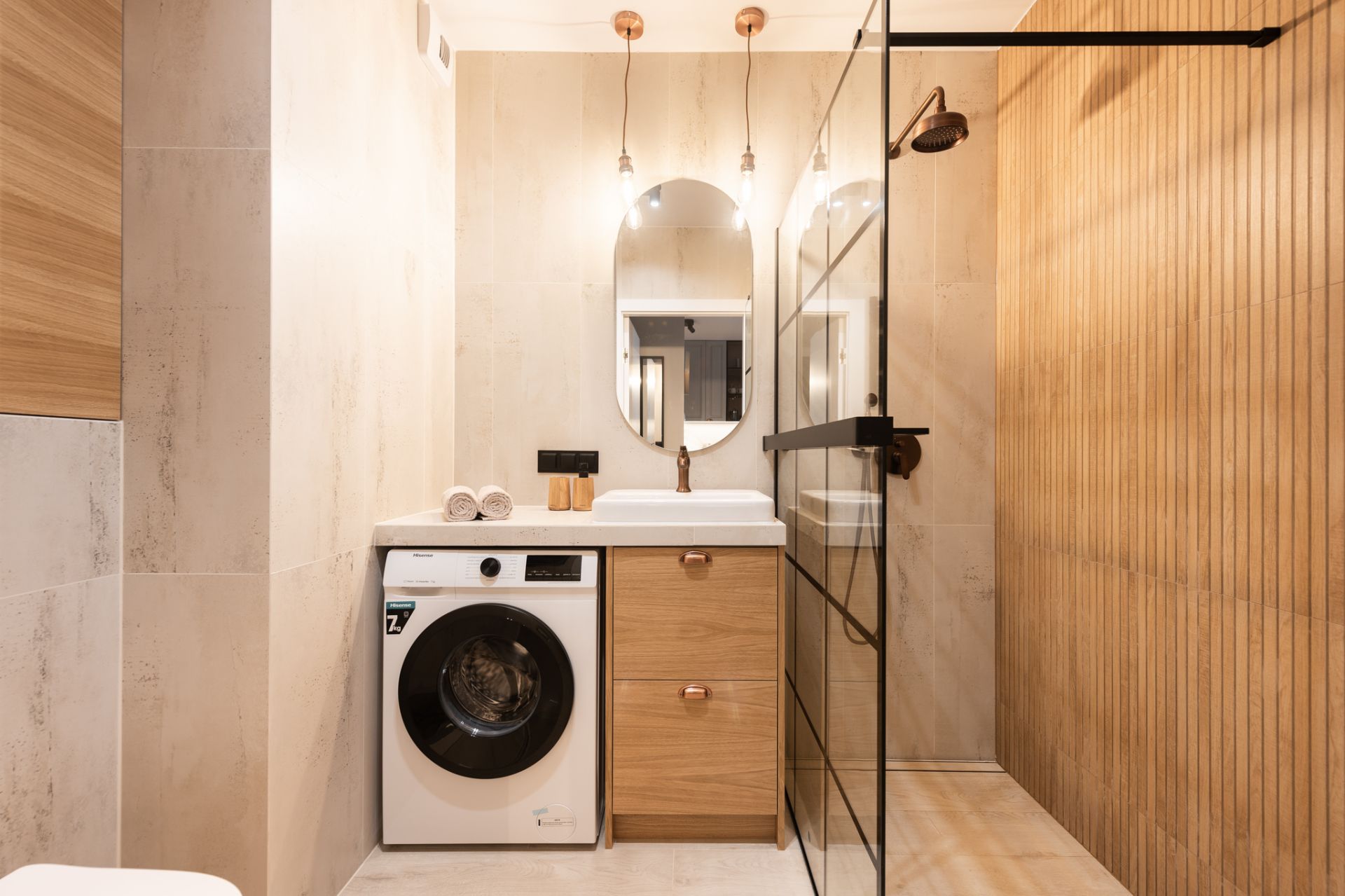 Wnętrze zostało zaprojektowane w nowoczesnym stylu z dbałością o detale. Salon z wygodną, zieloną sofą i miedzianymi akcentami to serce domu. Dużym atutem jest przestronny balkon wyposażony w stolik i krzesła, który stanowi naturalne przedłużenie strefy dziennej i jest doskonałym miejscem na odpoczynek po dniu pełnym wrażeń. Aneks kuchenny z funkcjonalną wyspą posiada wszystko, co niezbędne do przygotowywania posiłków.