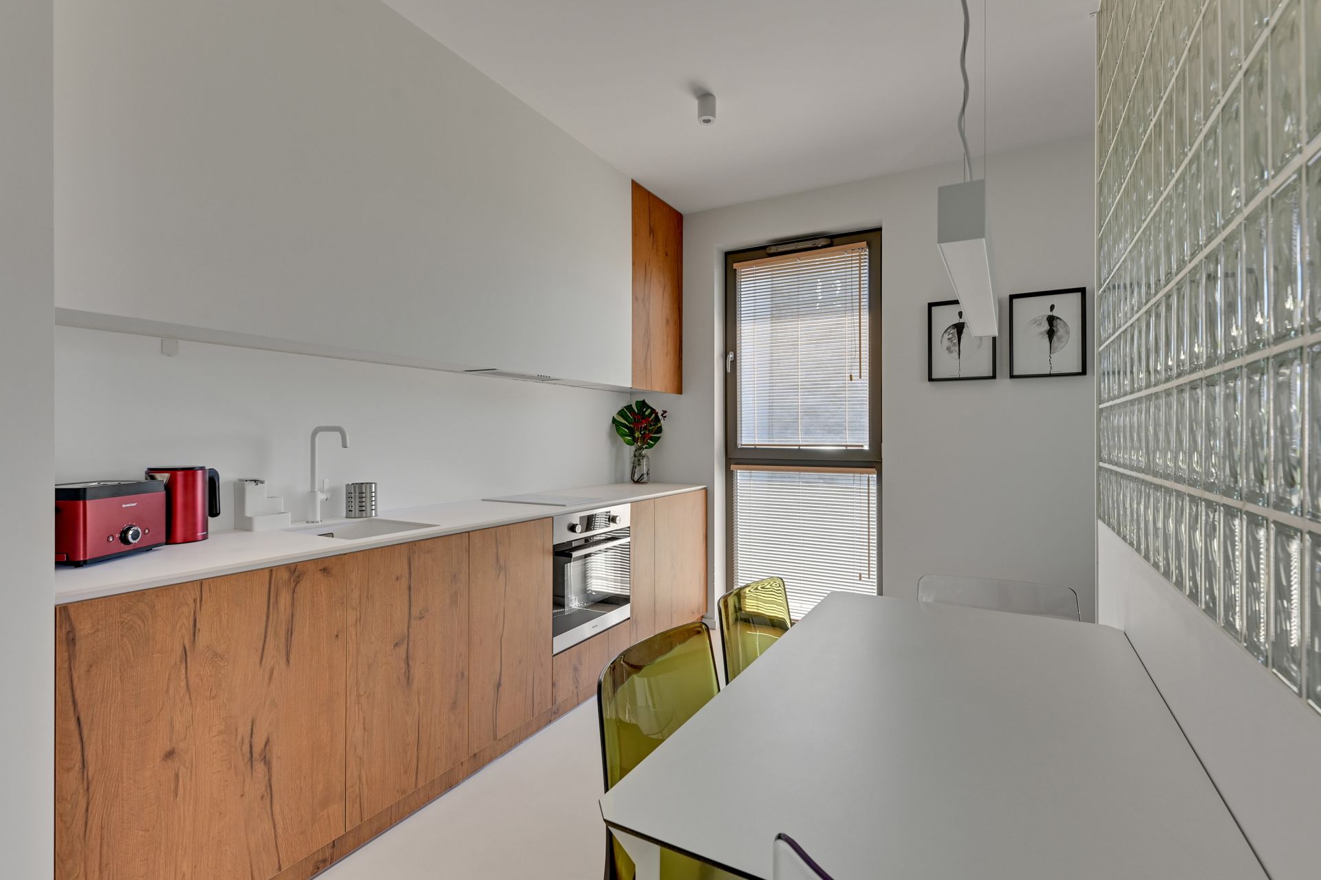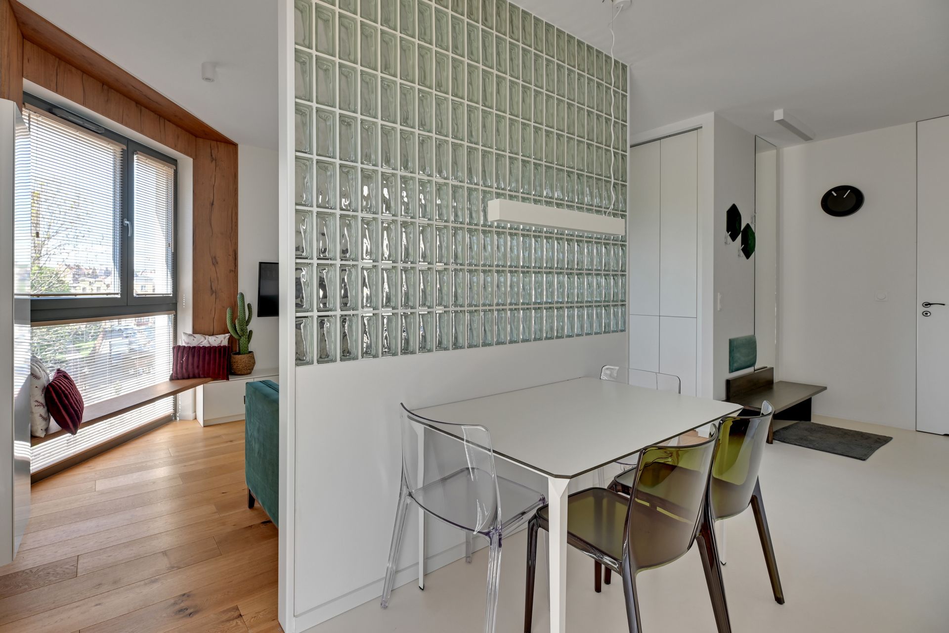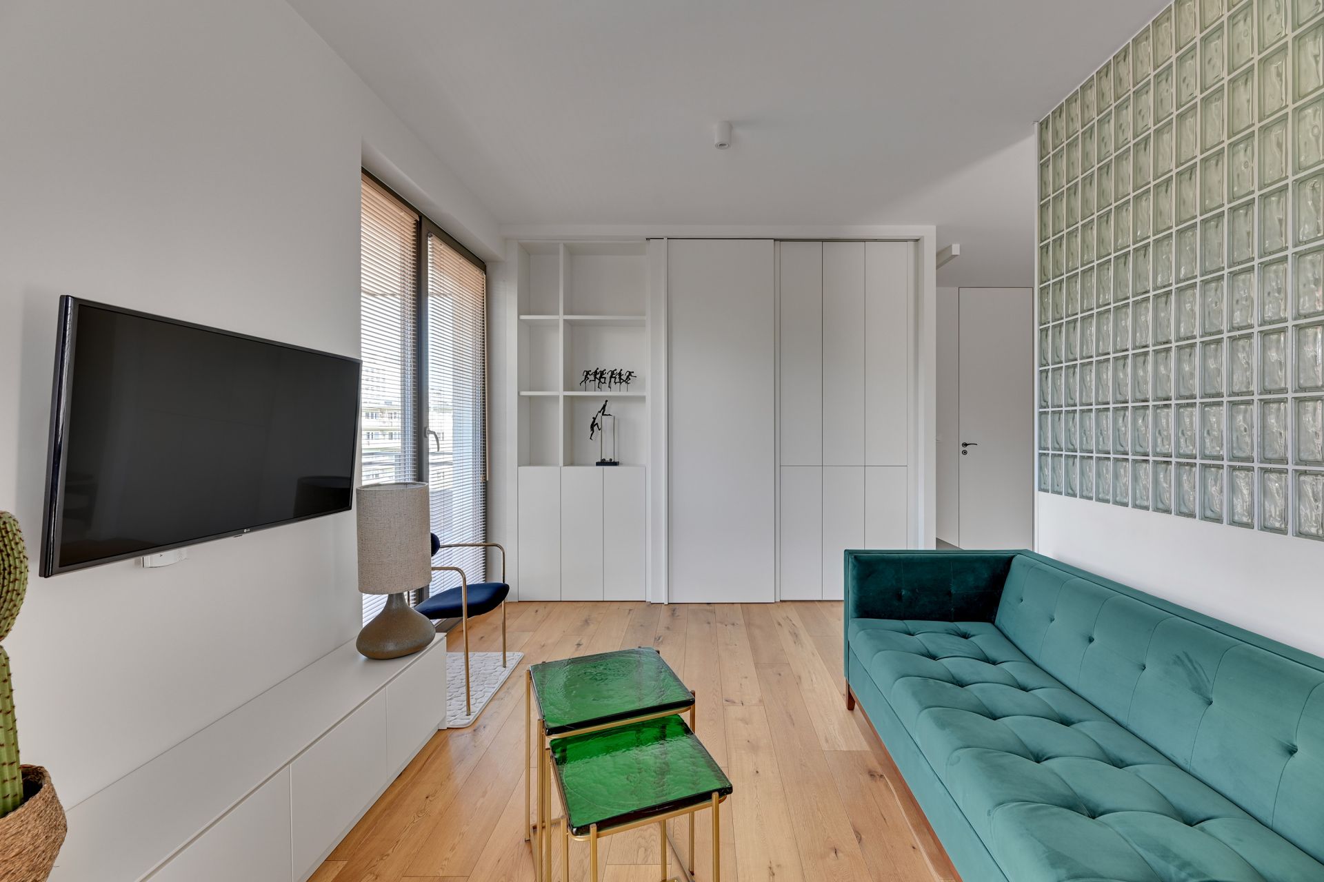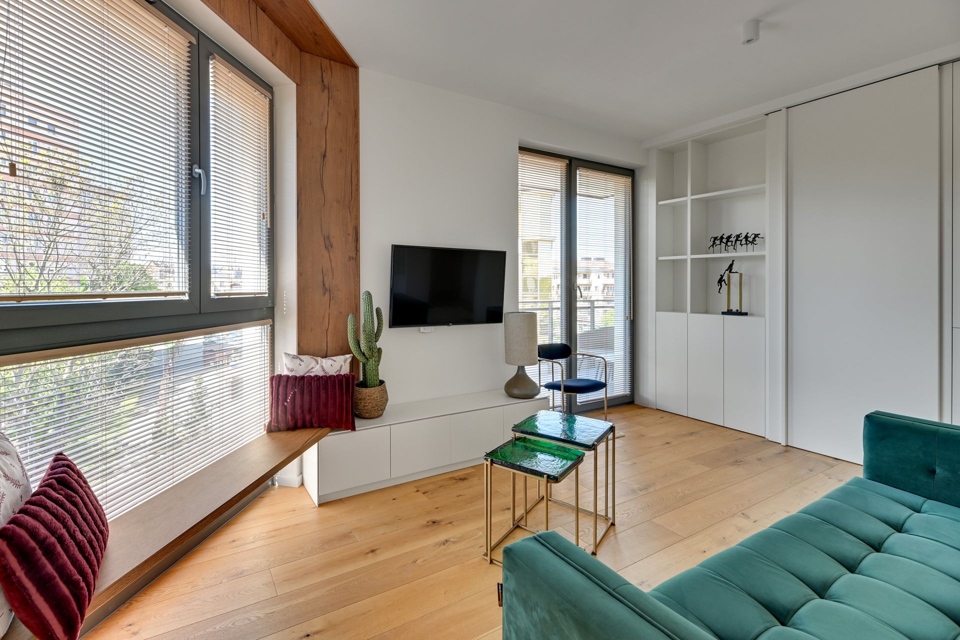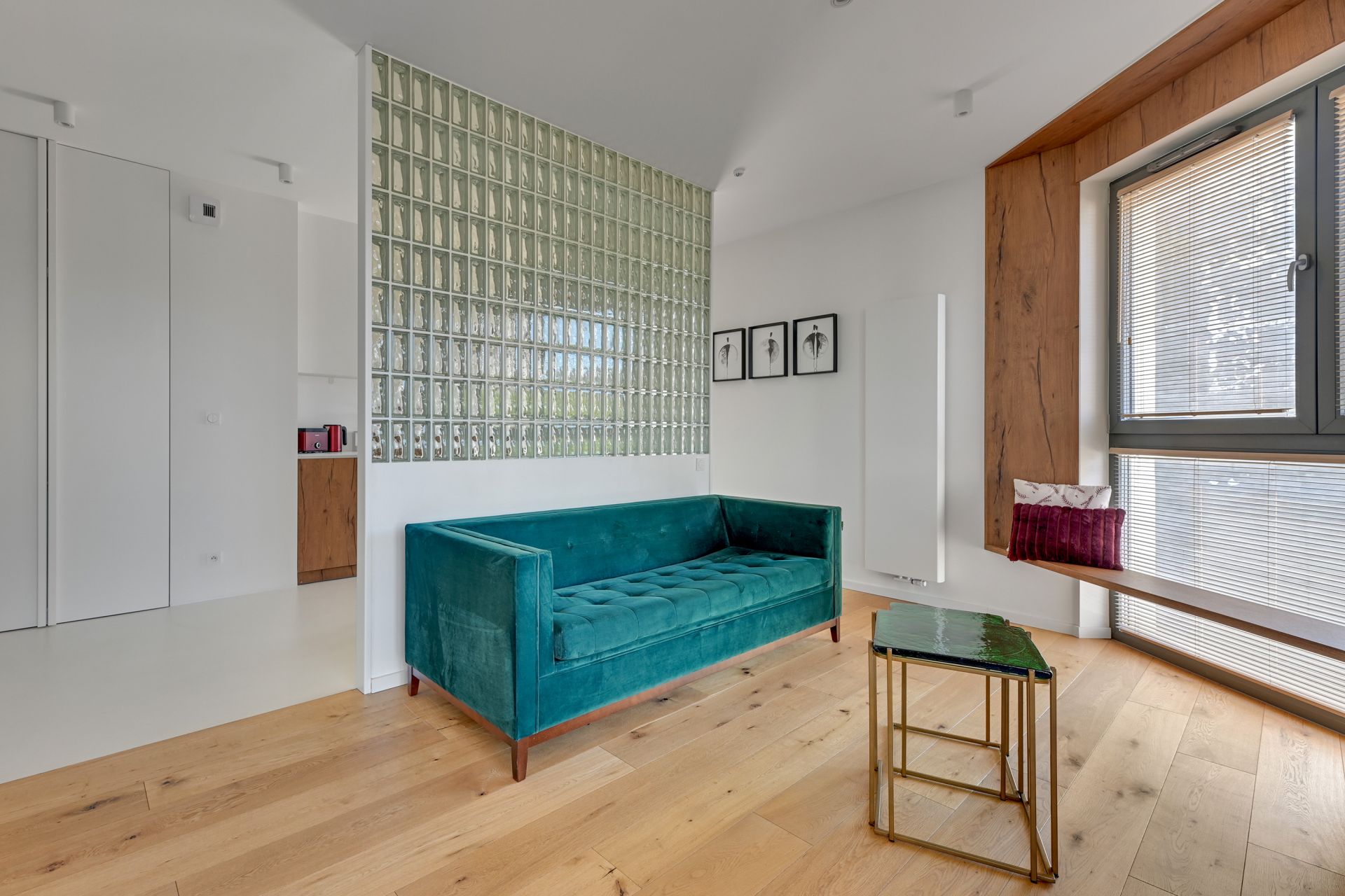 Wnętrze apartamentu zachwyca unikalnym designem, z komfortową sypialnią, nowoczesną łazienką z tropikalnymi akcentami i przestronną częścią dzienną z wygodną turkusową sofą. Szklana ścianka działowa dodaje przestrzeni lekkości i charakteru. W pełni wyposażony aneks kuchenny umożliwia swobodne przygotowywanie posiłków.