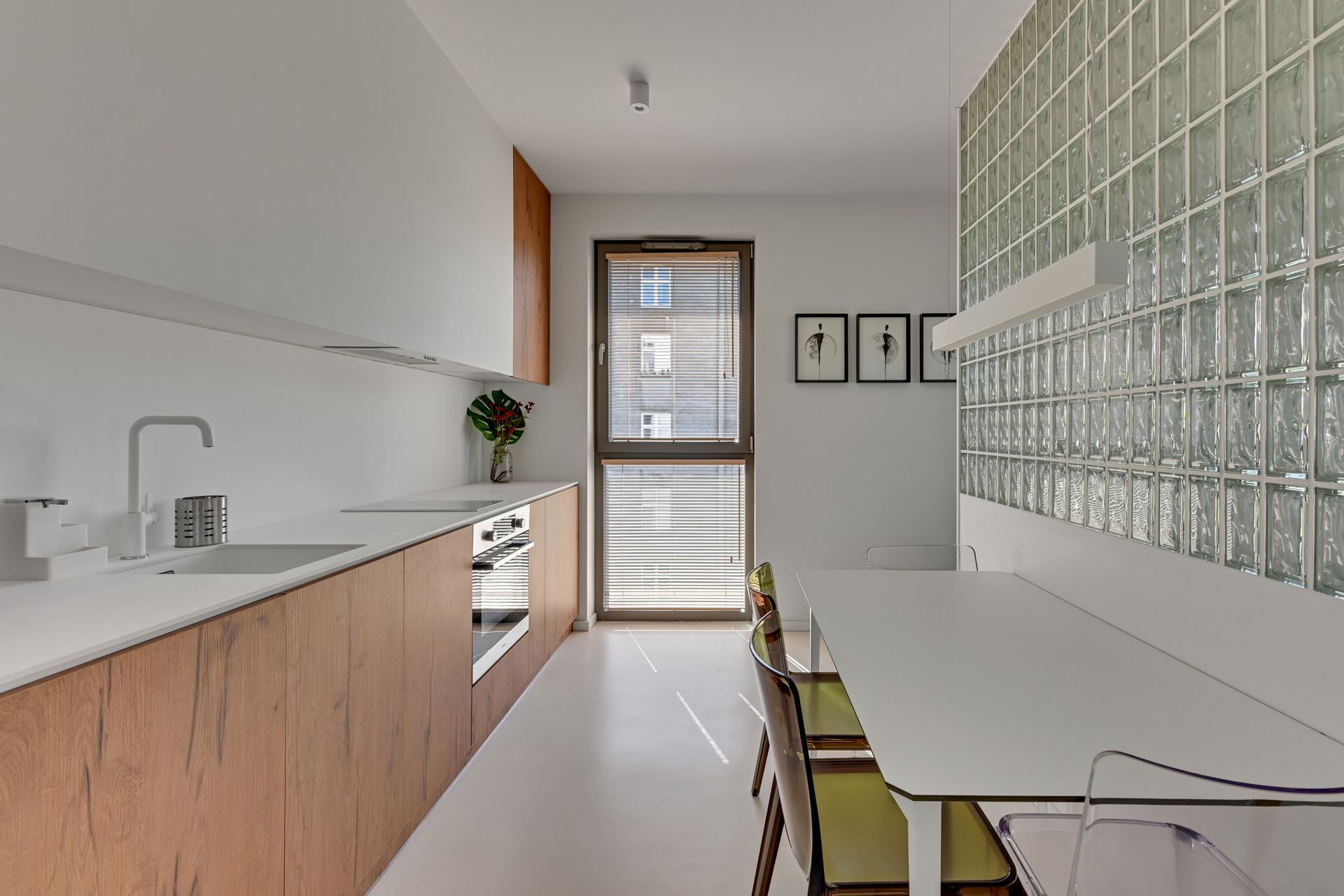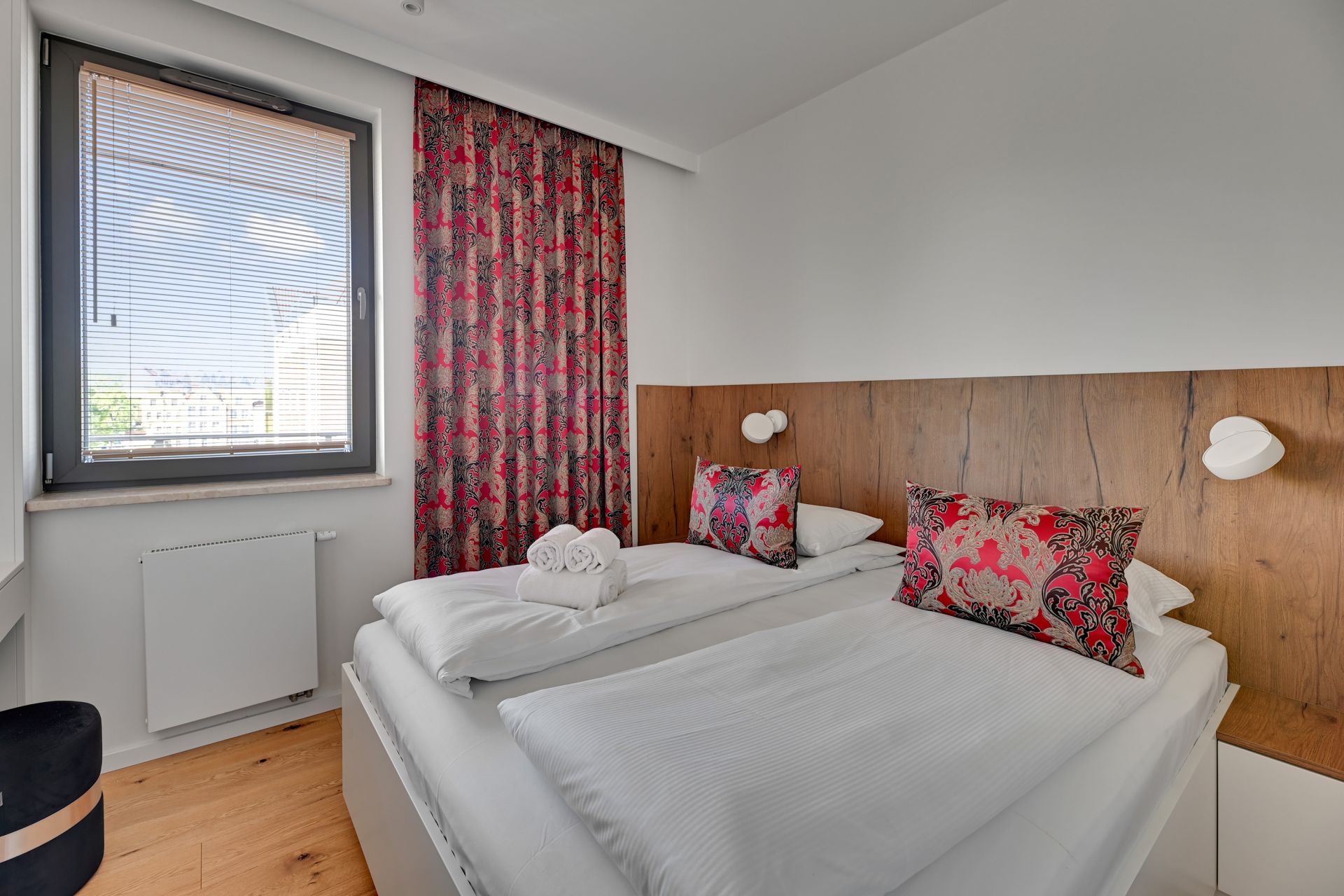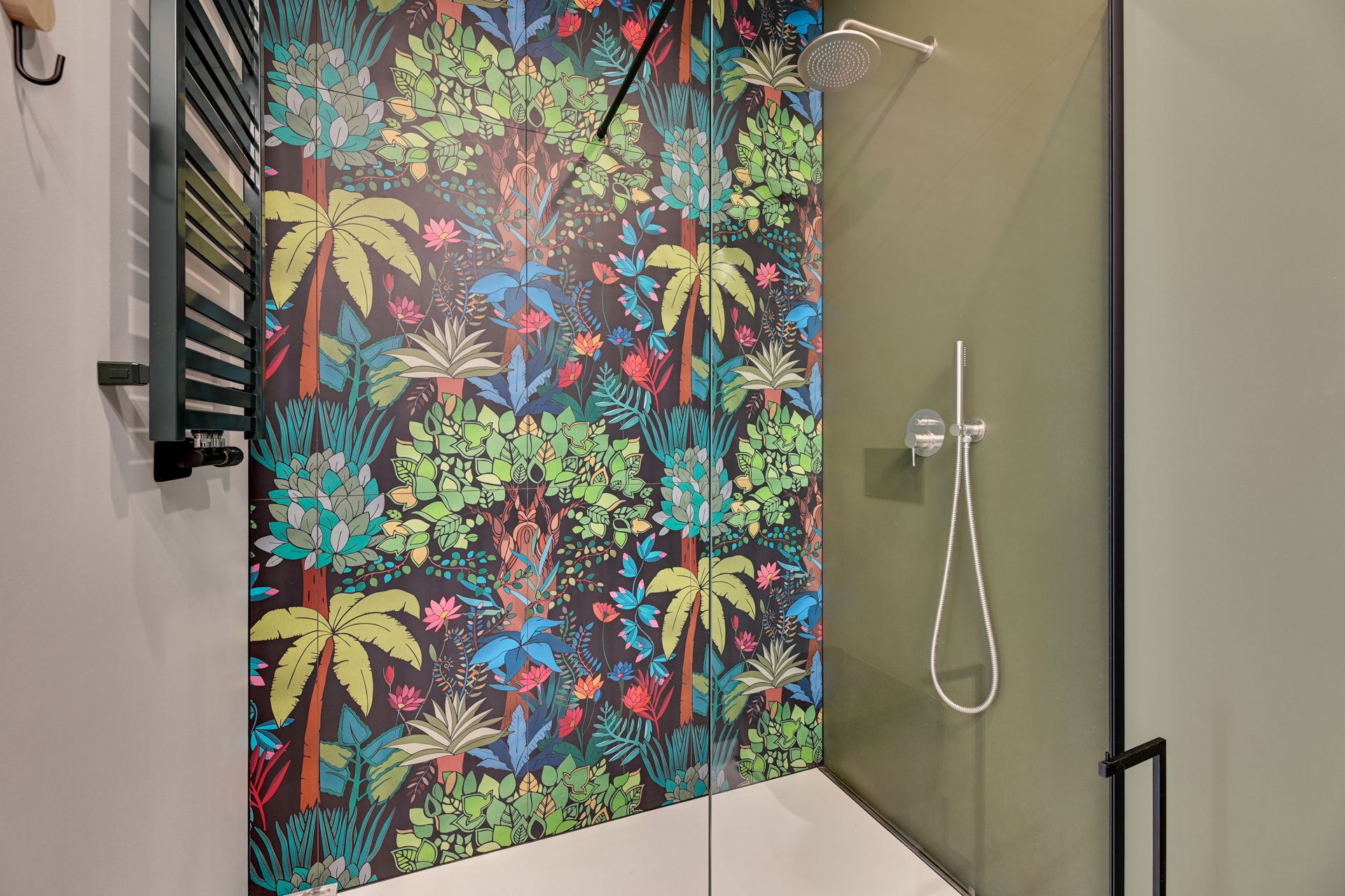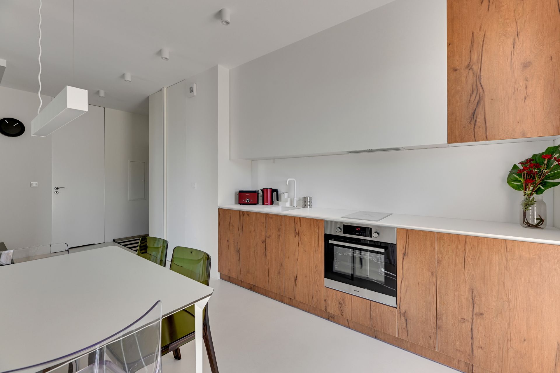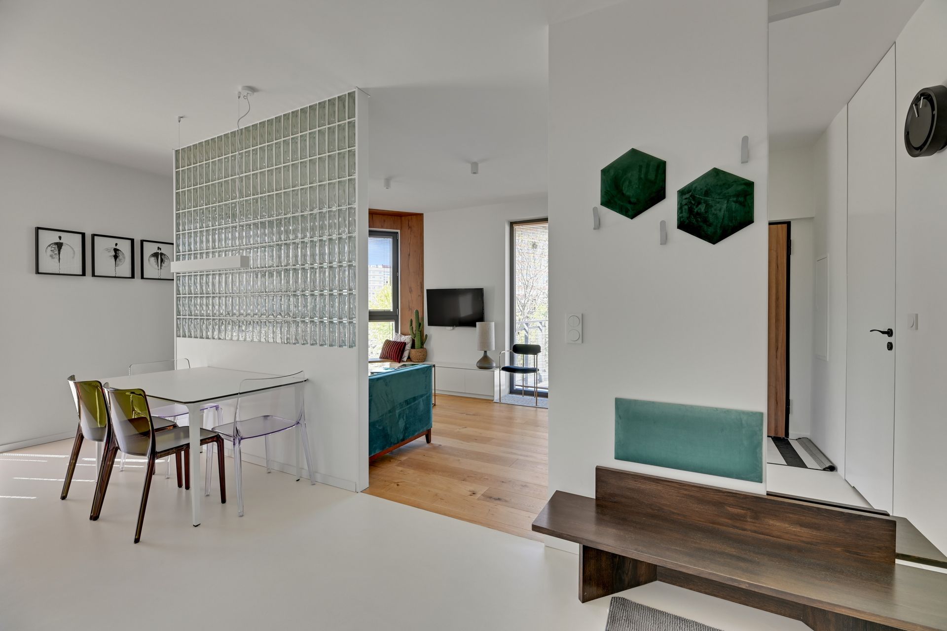 Wnętrze apartamentu zachwyca unikalnym designem, z komfortową sypialnią, nowoczesną łazienką z tropikalnymi akcentami i przestronną częścią dzienną z wygodną turkusową sofą. Szklana ścianka działowa dodaje przestrzeni lekkości i charakteru. W pełni wyposażony aneks kuchenny umożliwia swobodne przygotowywanie posiłków.