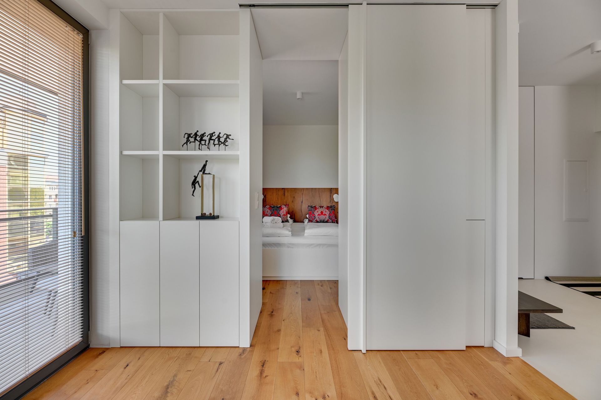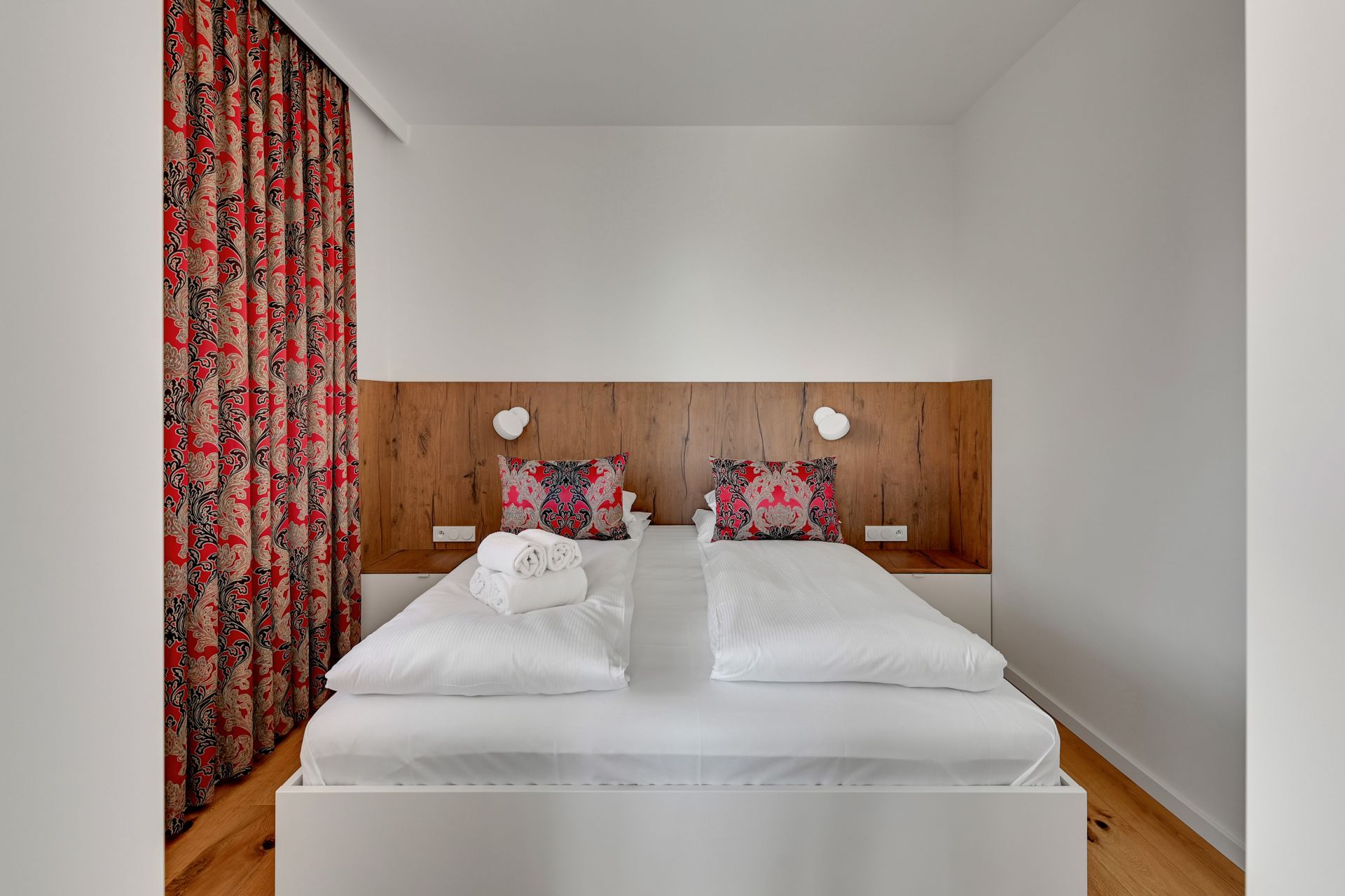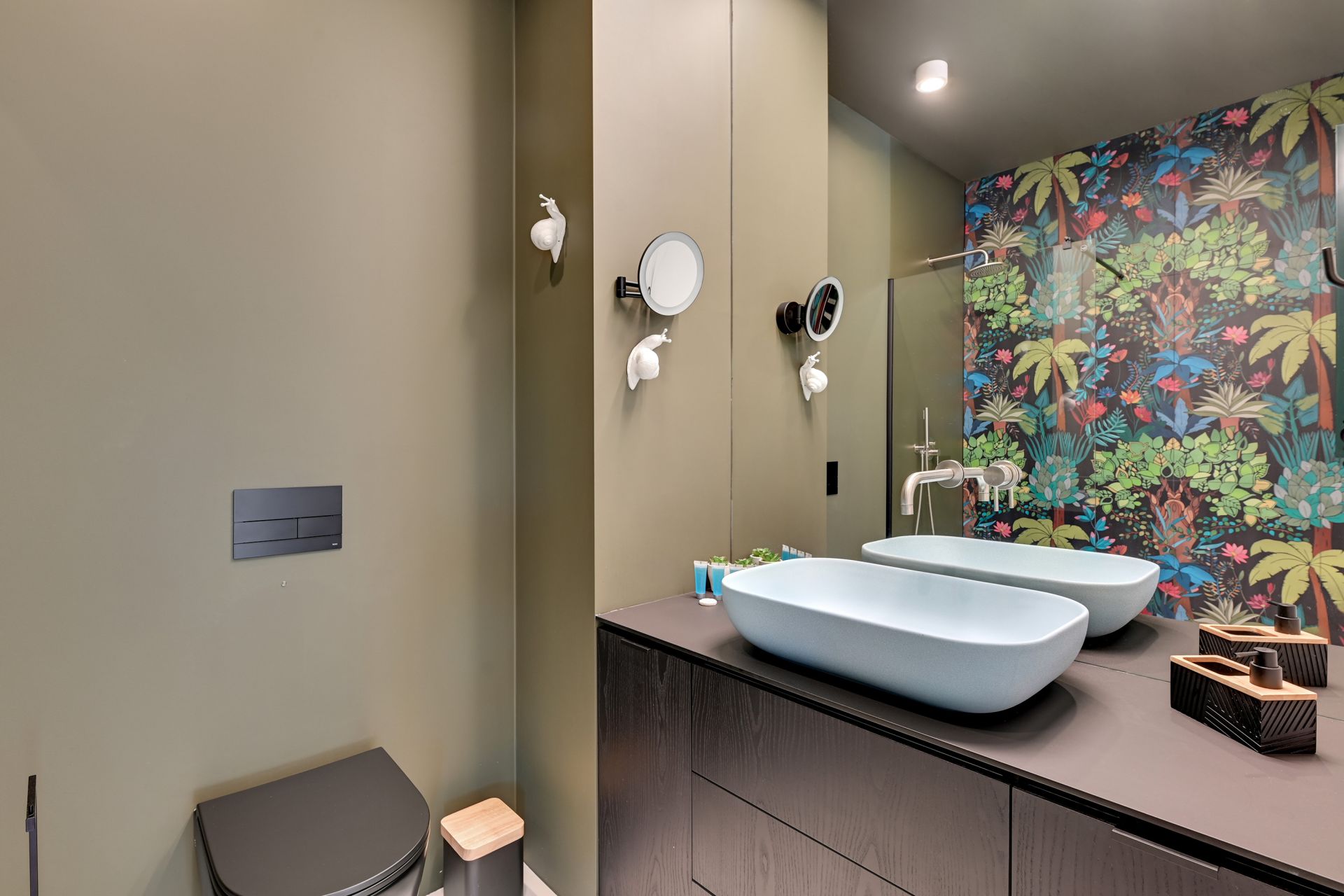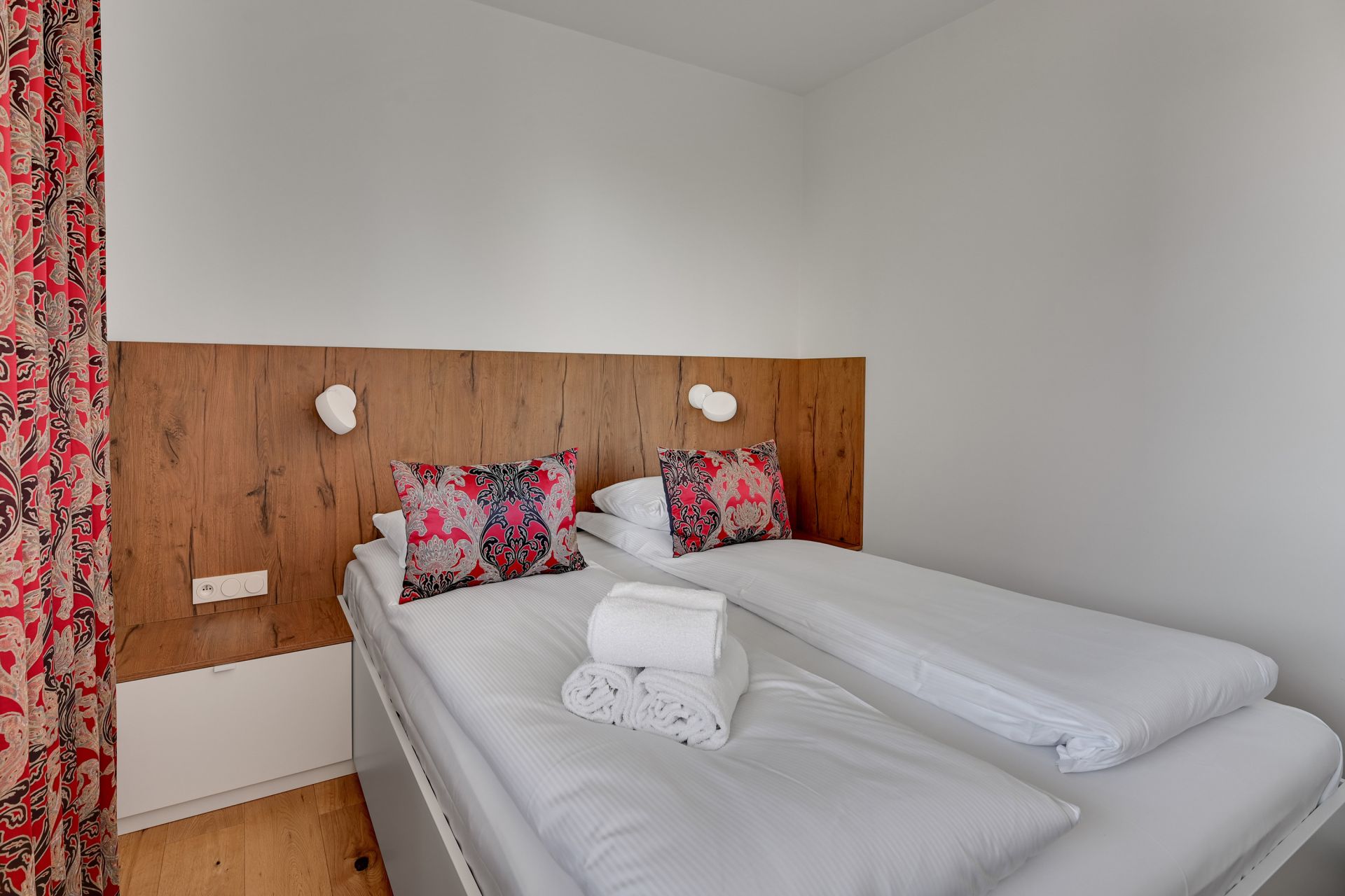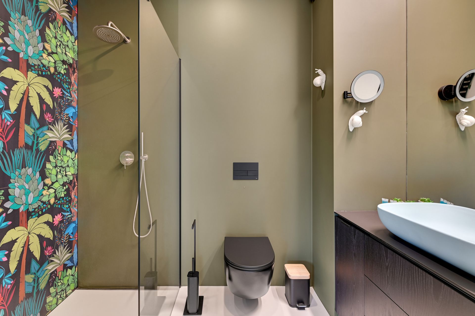 Wnętrze apartamentu zachwyca unikalnym designem, z komfortową sypialnią, nowoczesną łazienką z tropikalnymi akcentami i przestronną częścią dzienną z wygodną turkusową sofą. Szklana ścianka działowa dodaje przestrzeni lekkości i charakteru. W pełni wyposażony aneks kuchenny umożliwia swobodne przygotowywanie posiłków.