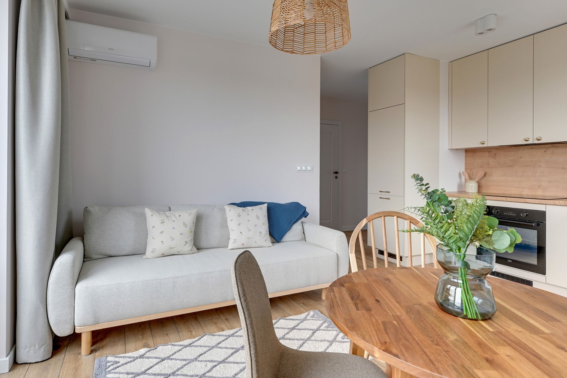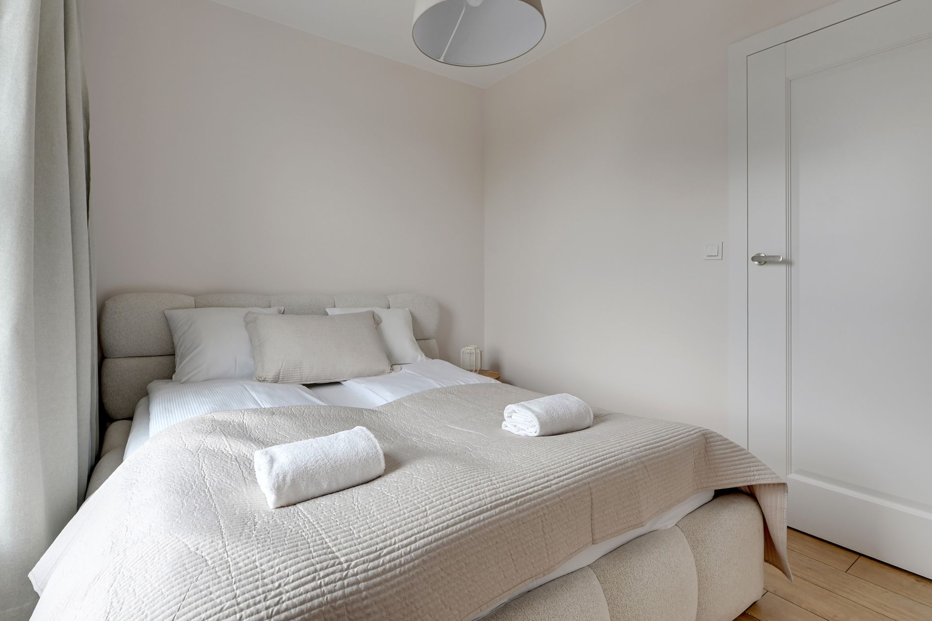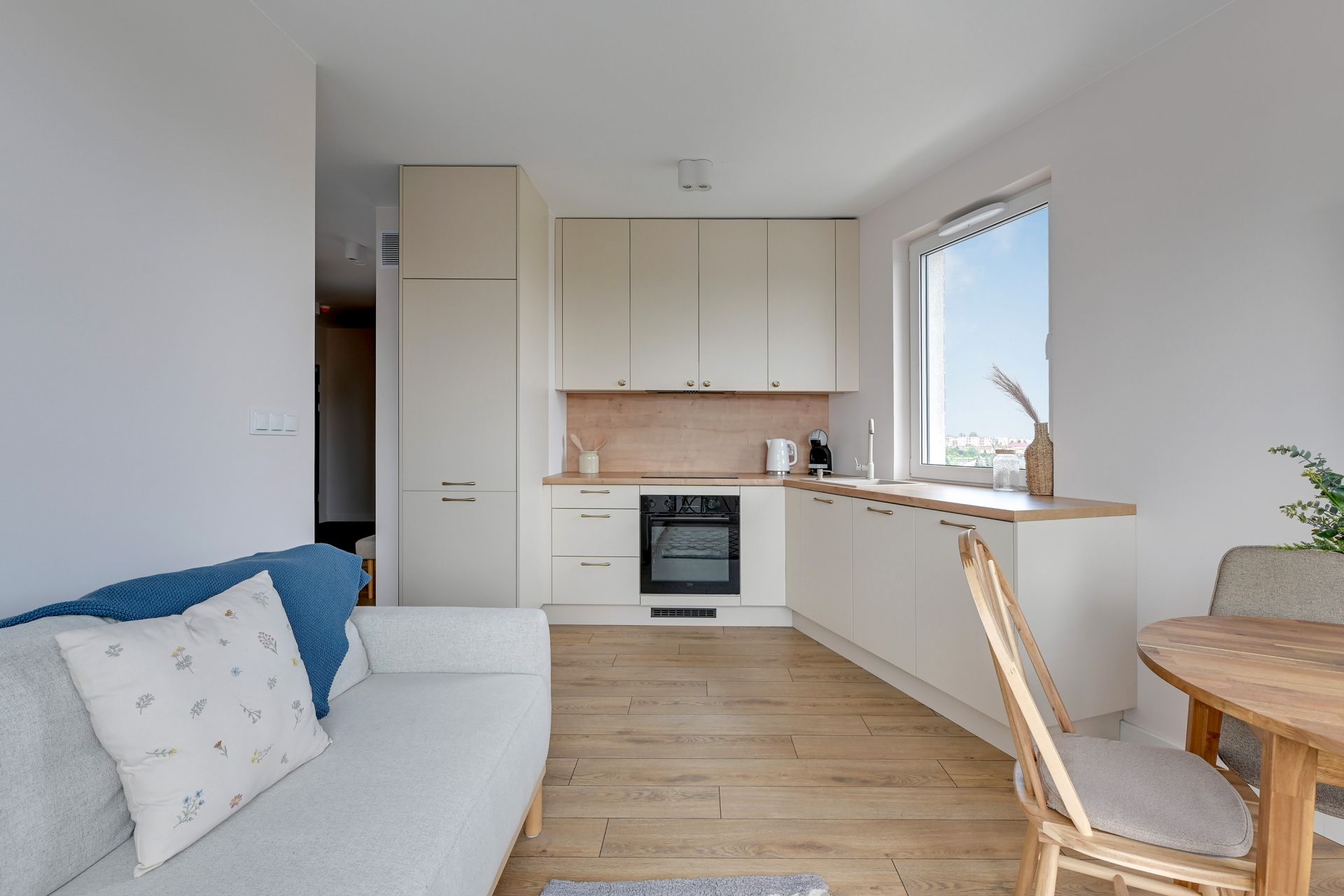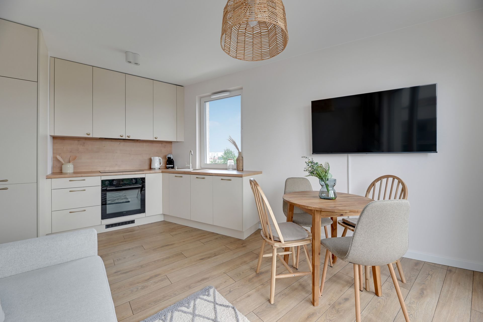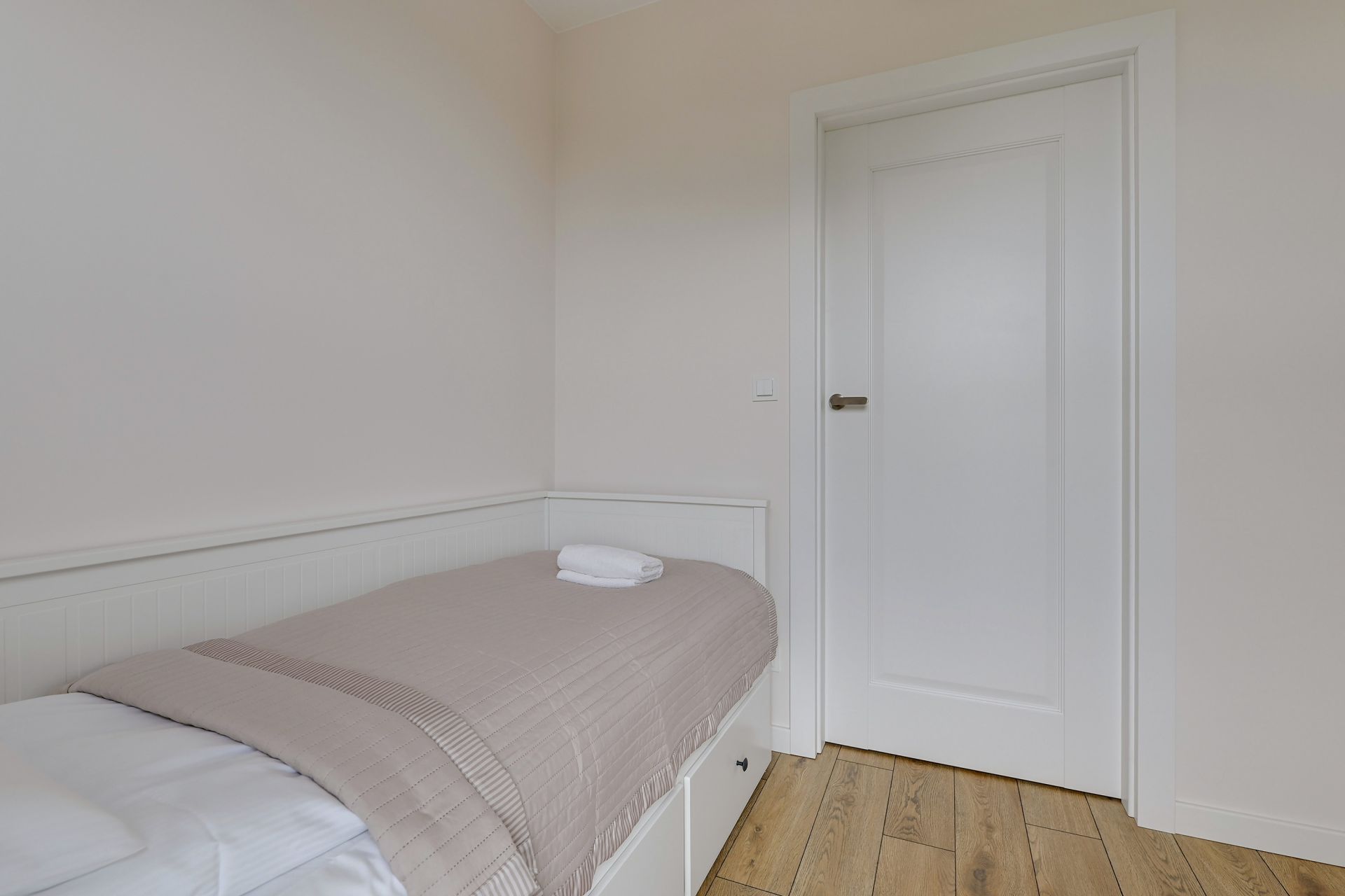 Wnętrze o powierzchni 47 m² zostało zaprojektowane z myślą o Waszym komforcie i odprężeniu, urzekając nowoczesnym designem z dyskretnymi akcentami marynistycznymi. Apartament składa się z dwóch przytulnych sypialni oraz jasnego salonu z aneksem kuchennym. W pierwszej sypialni znajdziecie Państwo wygodne łóżko podwójne, a druga sypialnia oferuje komfortowe łóżko z funkcją rozkładania dla dwóch osób. Dodatkowo, w salonie znajduje się wygodna sofa, która zapewni dodatkowe miejsce do spania dla piątej osoby.