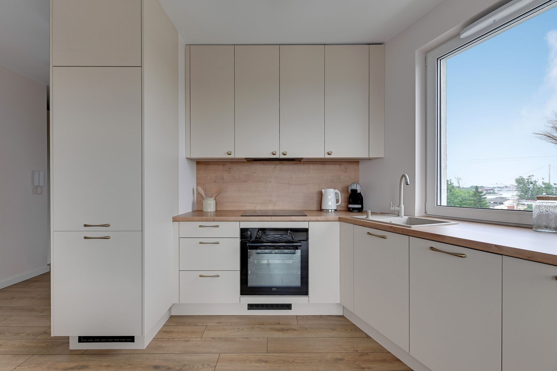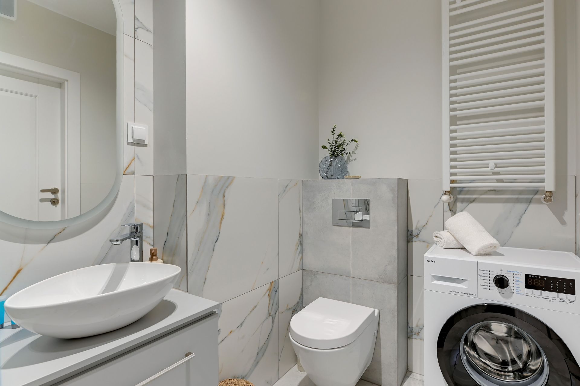 W pełni wyposażony aneks kuchenny umożliwia swobodne przygotowywanie posiłków. Do dyspozycji gości jest niezbędny sprzęt, taki jak płyta kuchenna, piekarnik, lodówka, zmywarka oraz czajnik. W salonie znajduje się telewizor oraz szybki dostęp do Wi-Fi, gwarantując rozrywkę i łączność ze światem. Dla komfortu w upalne dni, apartament wyposażony jest w klimatyzację. Nowoczesna łazienka z prysznicem i pralką dopełnia funkcjonalności, a także zapewni dostęp do suszarki do włosów, żelazka i deski do prasowania.