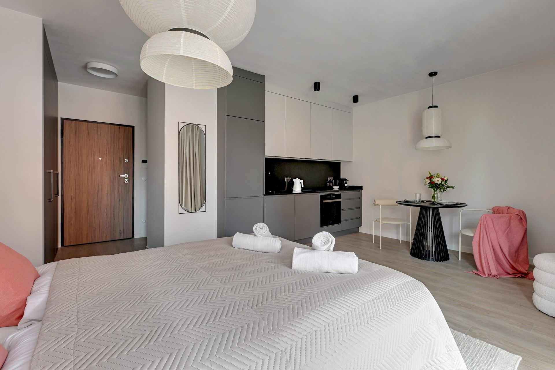 Stylowe studio zlokalizowane w bardzo bliskim sąsiedztwie Starego Miasta . Apartament składa się z pokoju z aneksem kuchennym oraz łazienki z wanną.