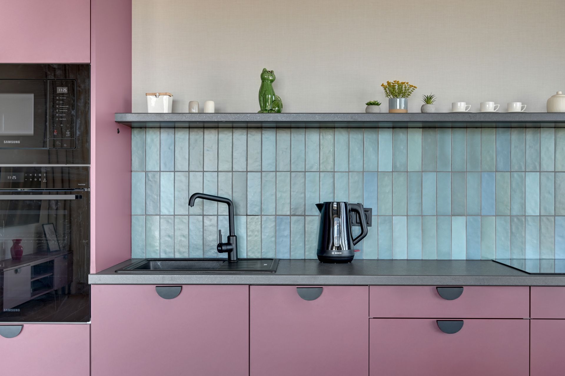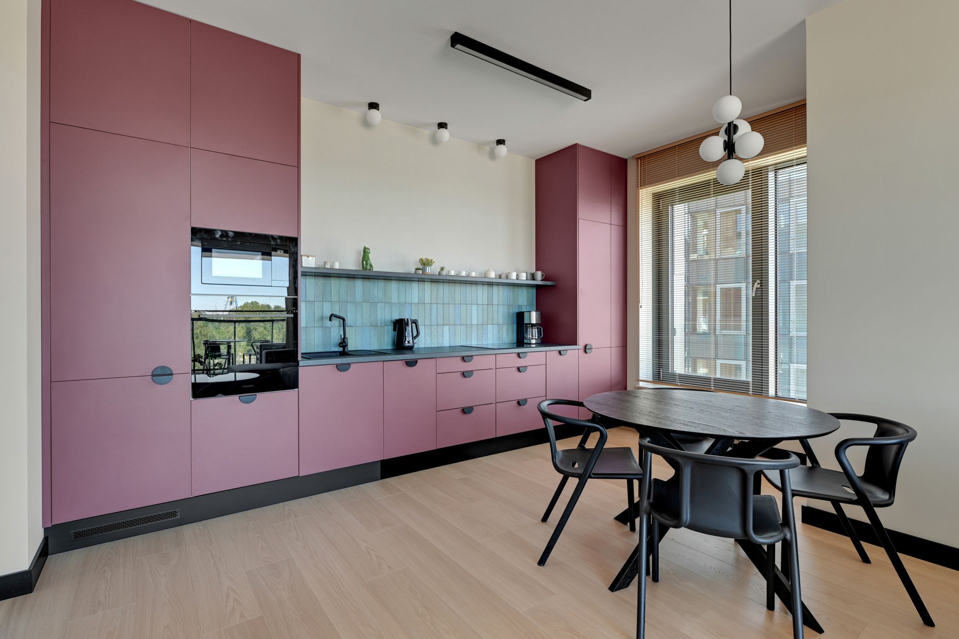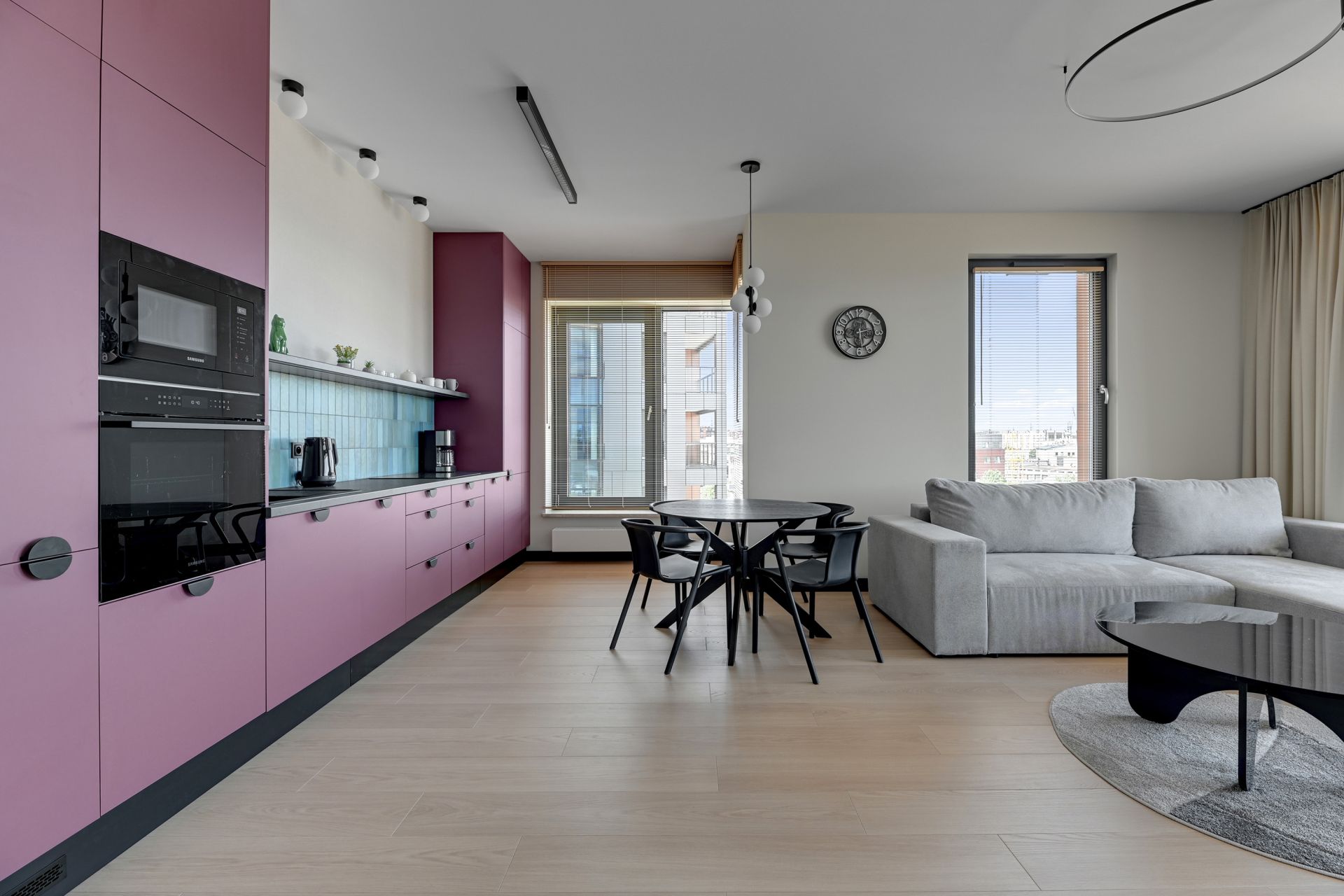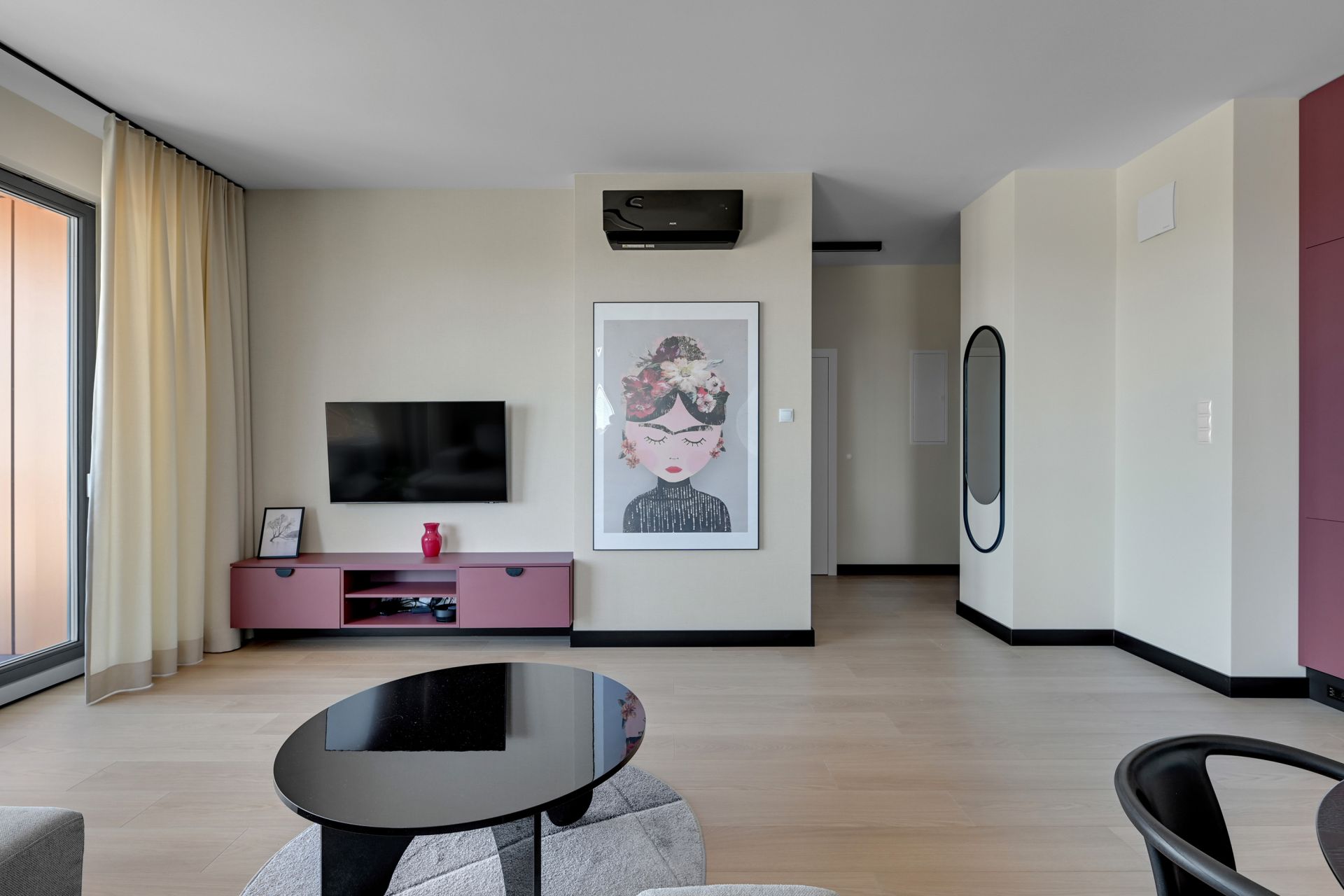 Centralnym punktem apartamentu jest przestronny salon połączony z w pełni wyposażonym aneksem kuchennym. To właśnie tutaj spędzisz niezapomniane chwile z rodziną lub przyjaciółmi. Aneks kuchenny zachwyca nie tylko funkcjonalnością, ale także oryginalną kolorystyką – połączenie nasyconego różu i głębokiego błękitu tworzy atmosferę świeżości i energii.