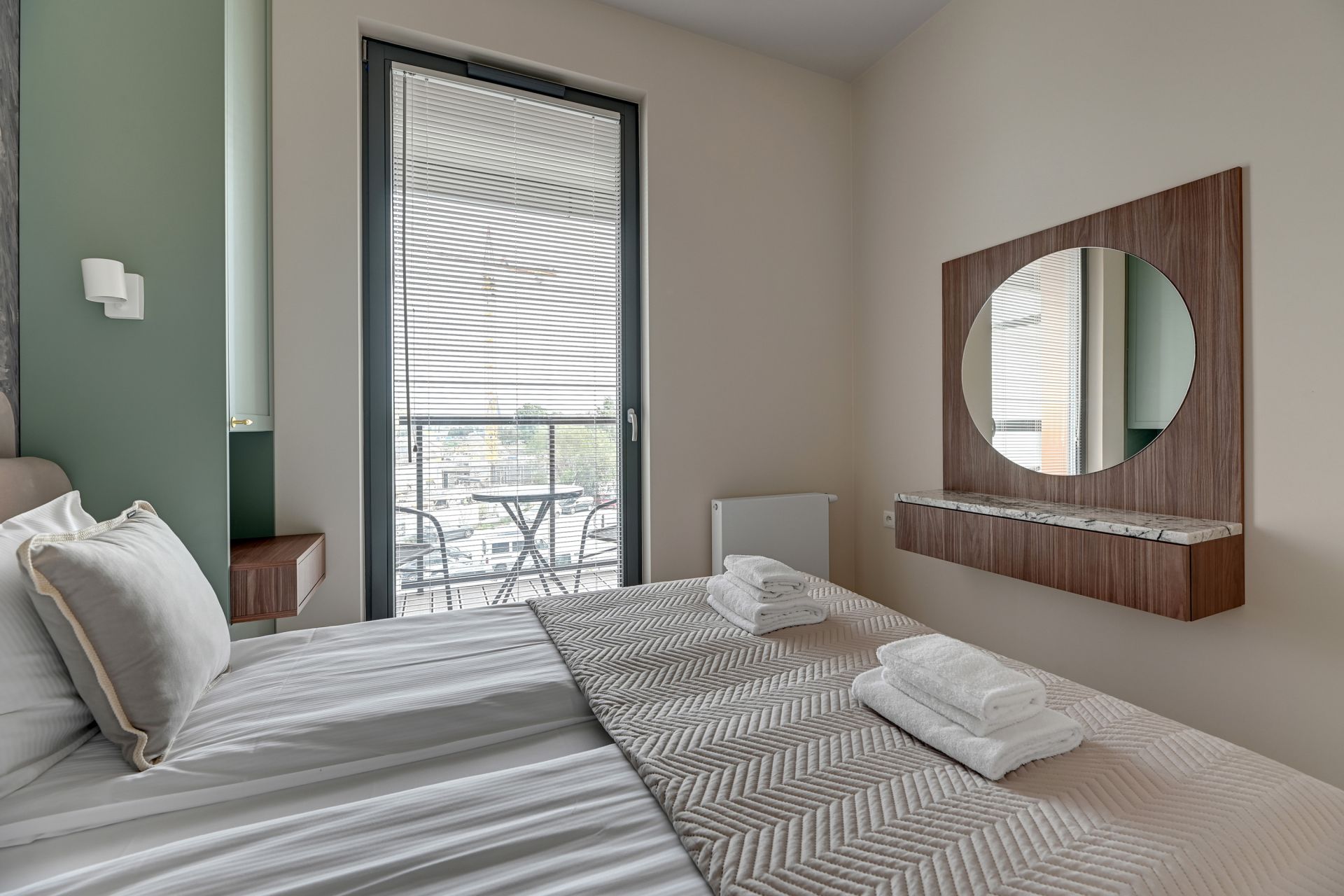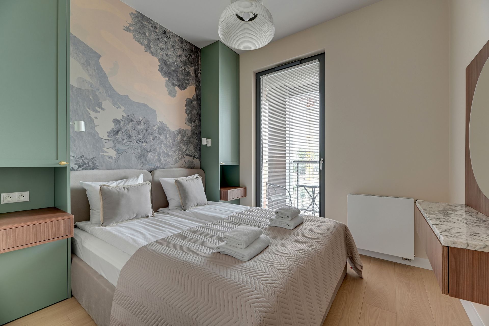 Sypialnia to oaza spokoju, wyposażona w wygodne podwójne łóżko, zapewniające komfortowy sen. Eleganckie meble i stonowana kolorystyka sprzyjają relaksowi i odprężeniu.