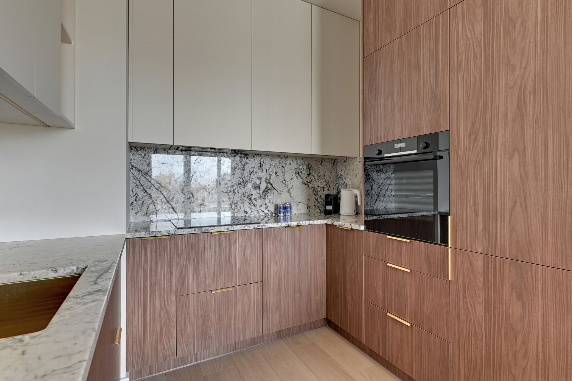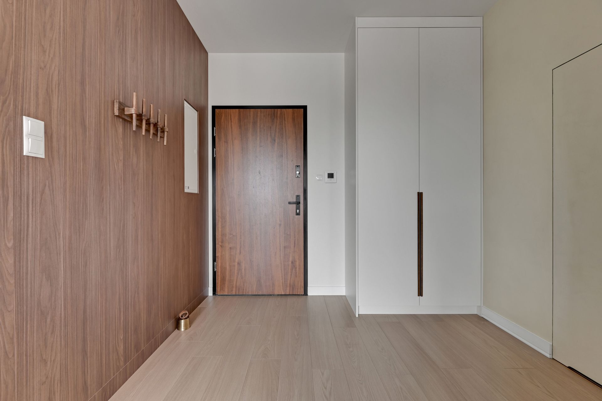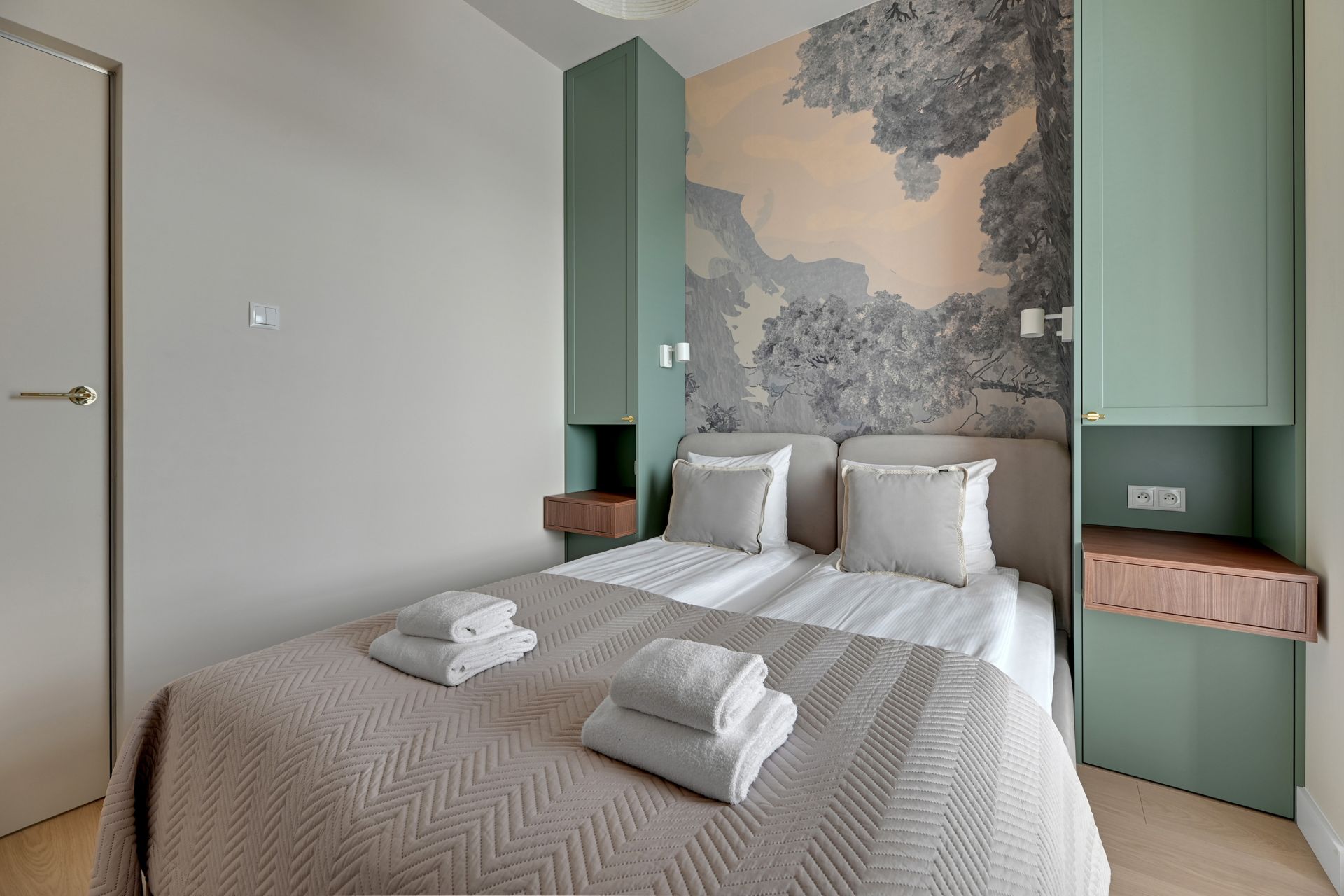 Elegancka łazienka z prysznicem i pralką zapewni Ci komfort i wygodę. Całość apartamentu utrzymana jest w stonowanych odcieniach bieli, beżu i elementami drewnianymi, tworząc harmonijną i luksusową atmosferę.