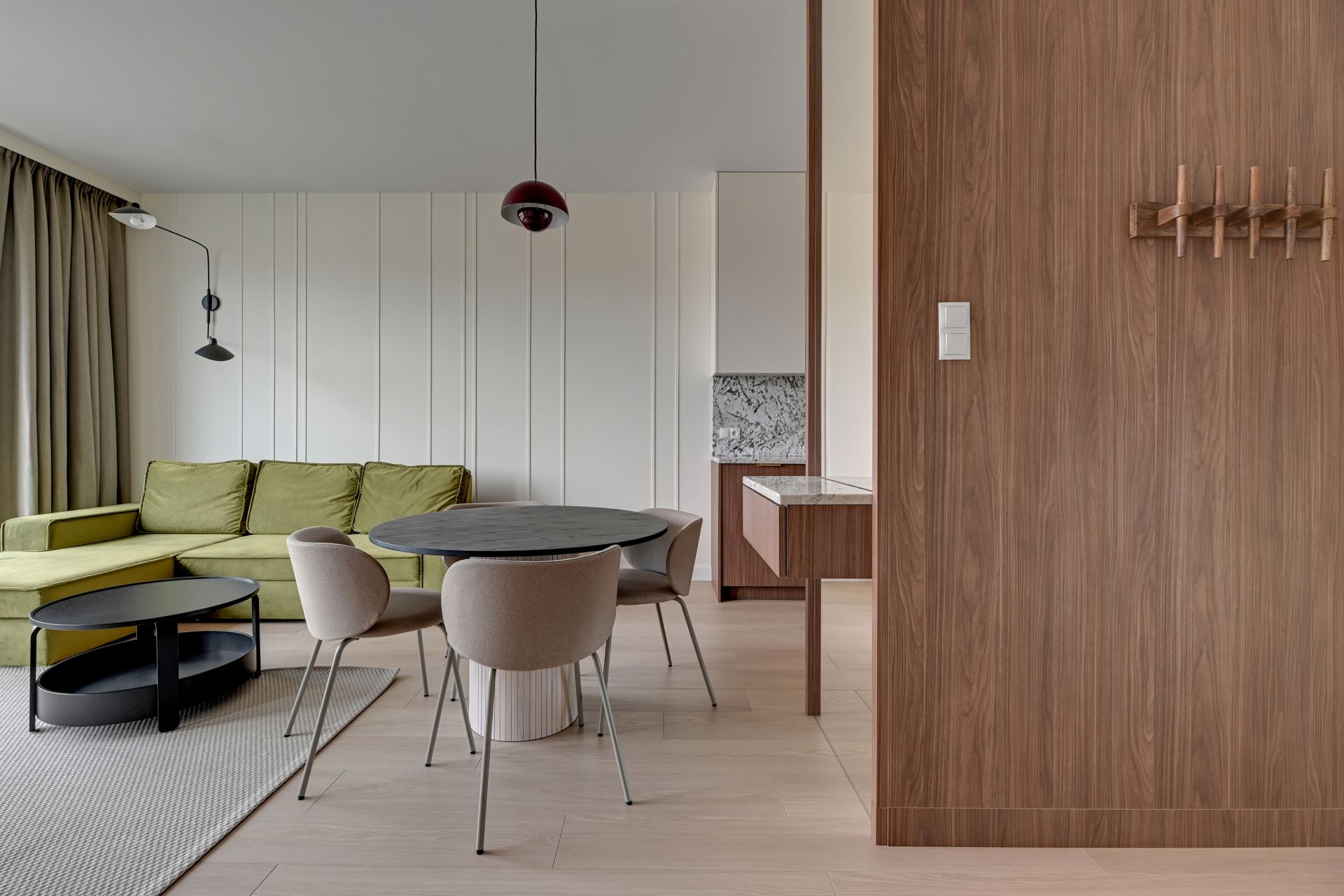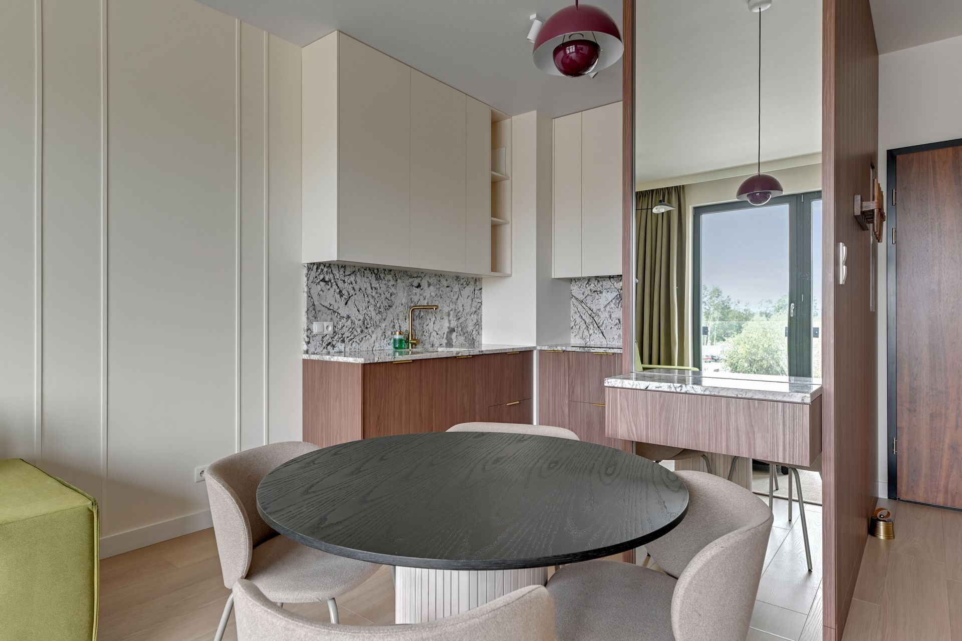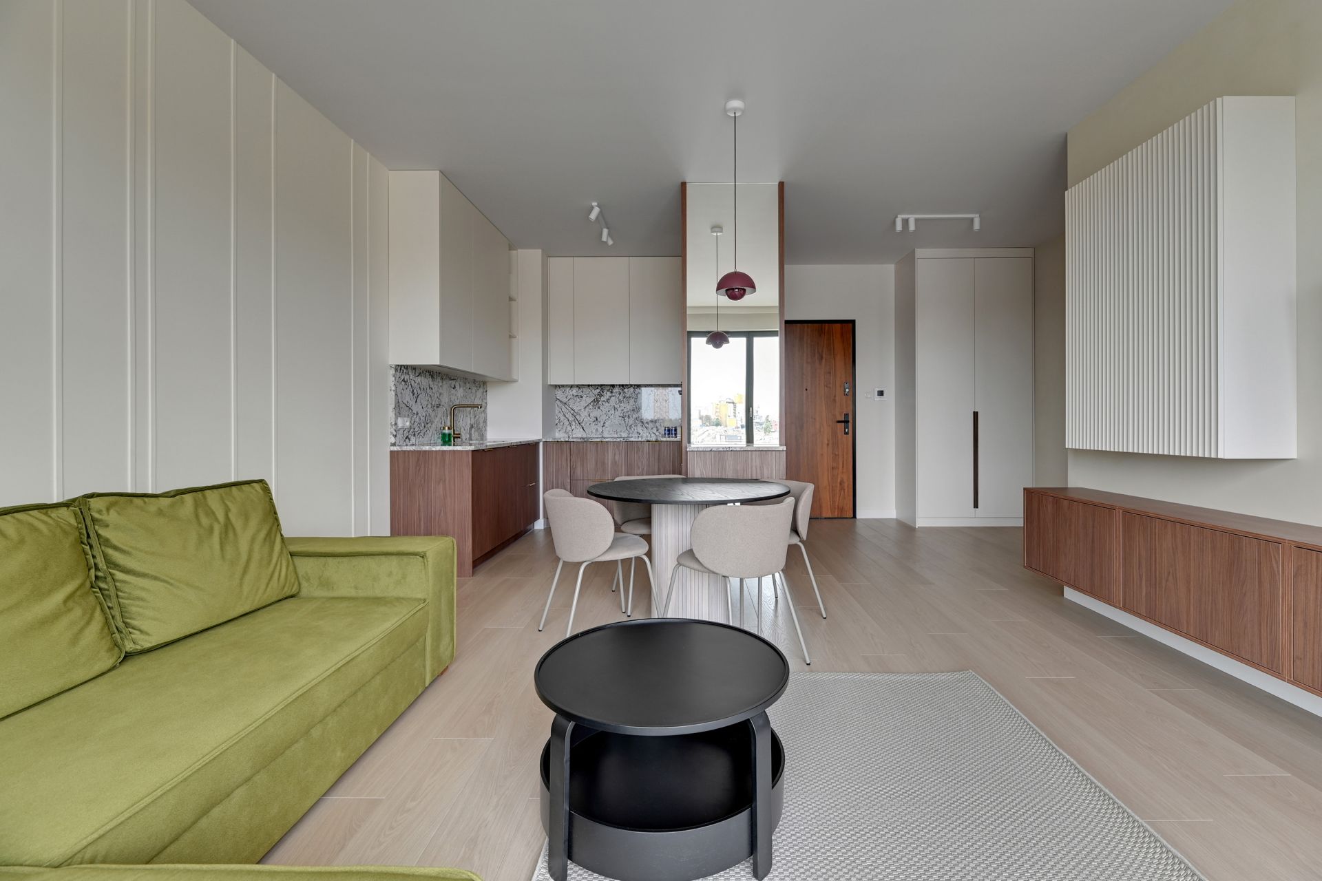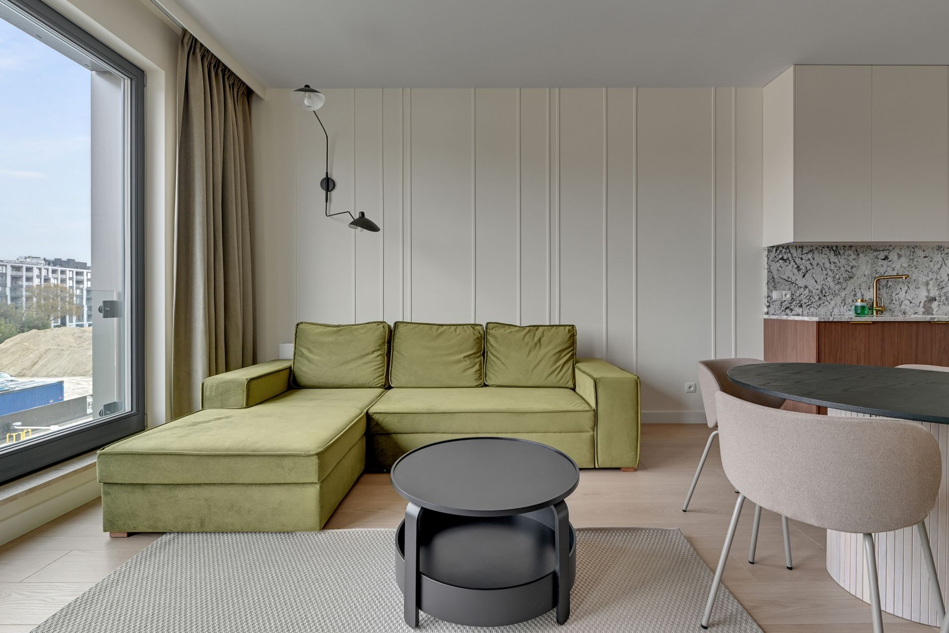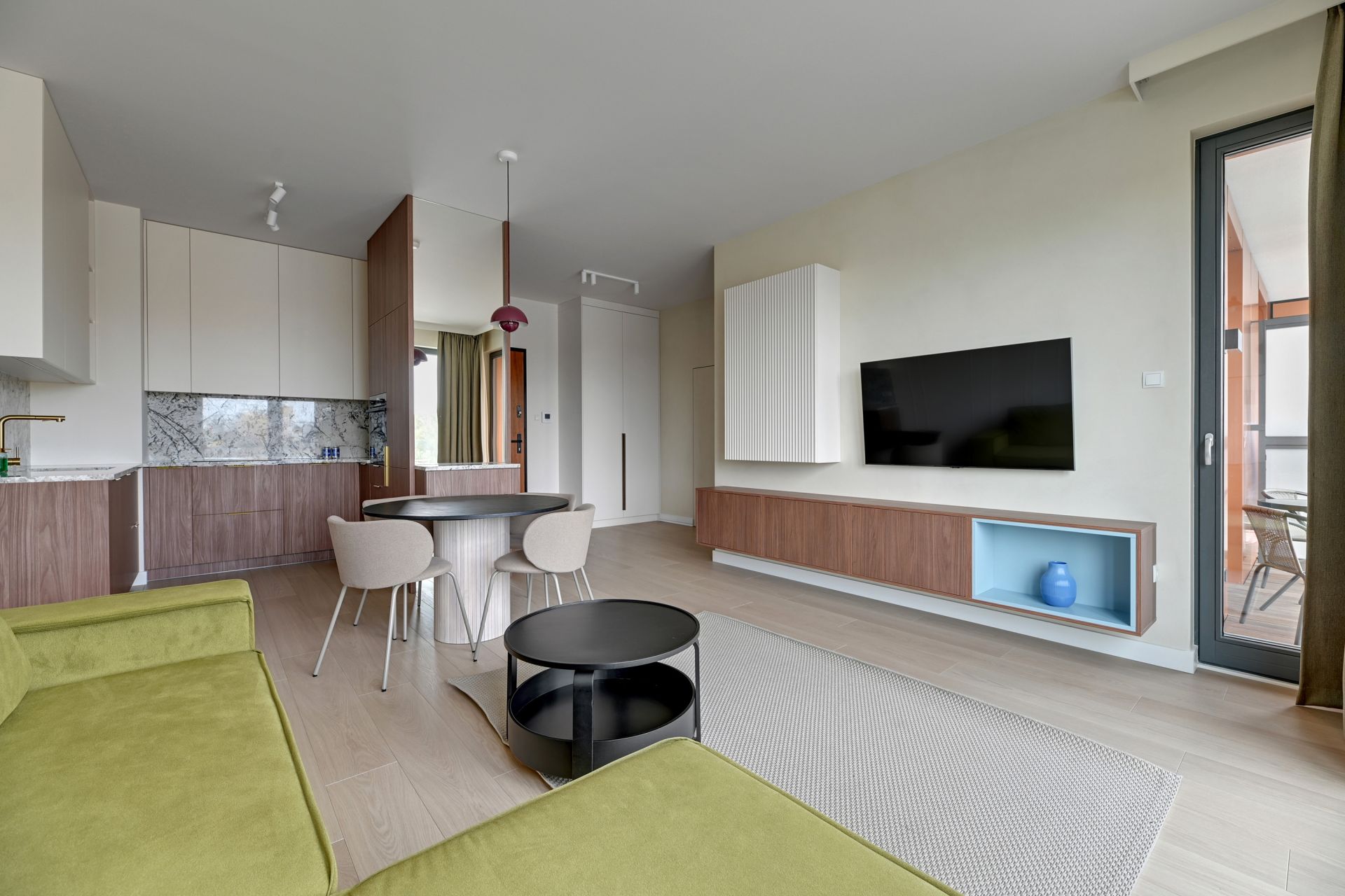 Przytulny salon to miejsce idealne na odpoczynek po dniu zwiedzania. Rozkładana sofa zapewnia dodatkowe miejsca noclegowe dla dwóch osób, a Smart TV gwarantuje rozrywkę na najwyższym poziomie.
