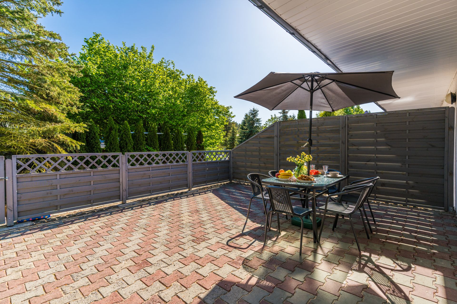 - duży, częściowo zadaszony, zamykany taras wyłożony kostką brukową z zestawem ogrodowym: stolik, krzesła i parasol + klimatyczna strefa wypoczynkowa z 2 fotelami ogrodowymi