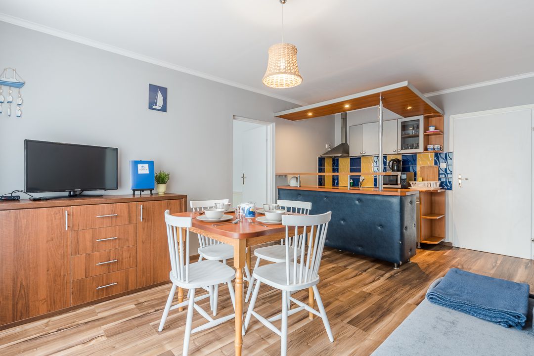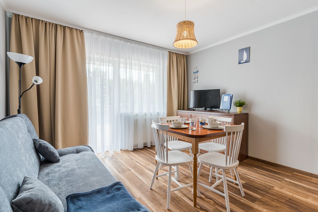 - duży salon z rozkładaną kanapą - 140cm (telewizor 32 cale, stół z krzesłami, komoda, pościel, lampa do czytania)