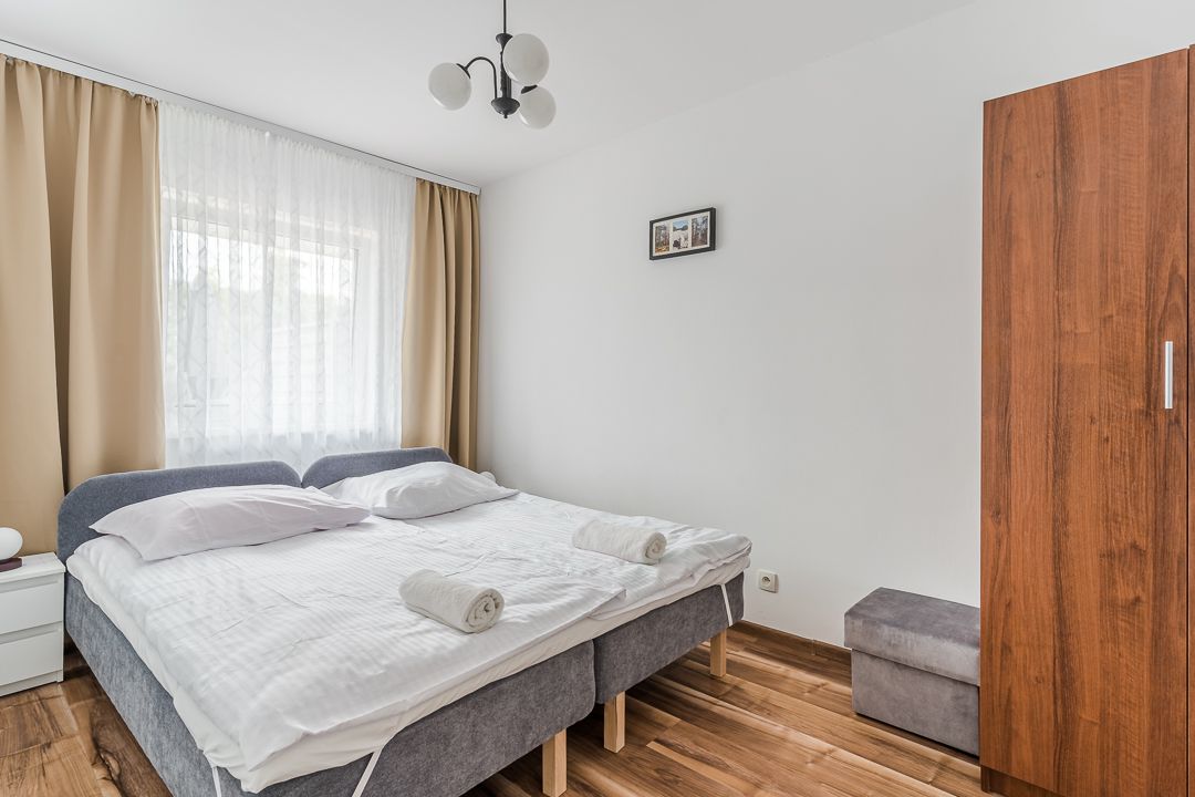 - sypialnia 1: łóżko małżeńskie (komoda, pościel, stolik, lampka nocna)