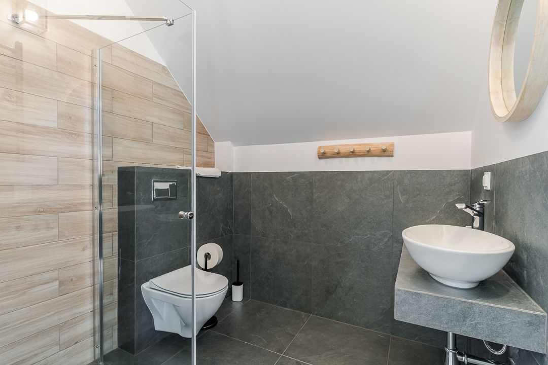 - Na piętrze: łazienka z toaletą (prysznic, ręczniki, papier toaletowy, suszarka do włosów, mydło do rąk)