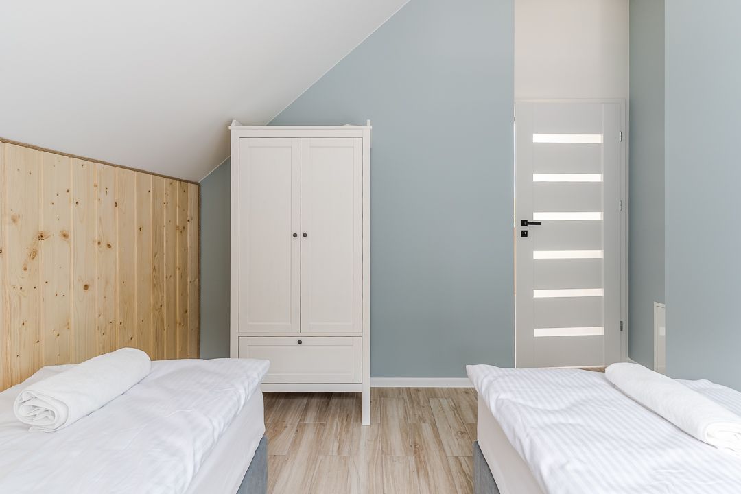 - Na piętrze: sypialnia 2: 2 łóżka pojedyncze 80cm (komoda, pościel, stolik, lampka nocna)- możliwość złączenia łóżek na życzenie
