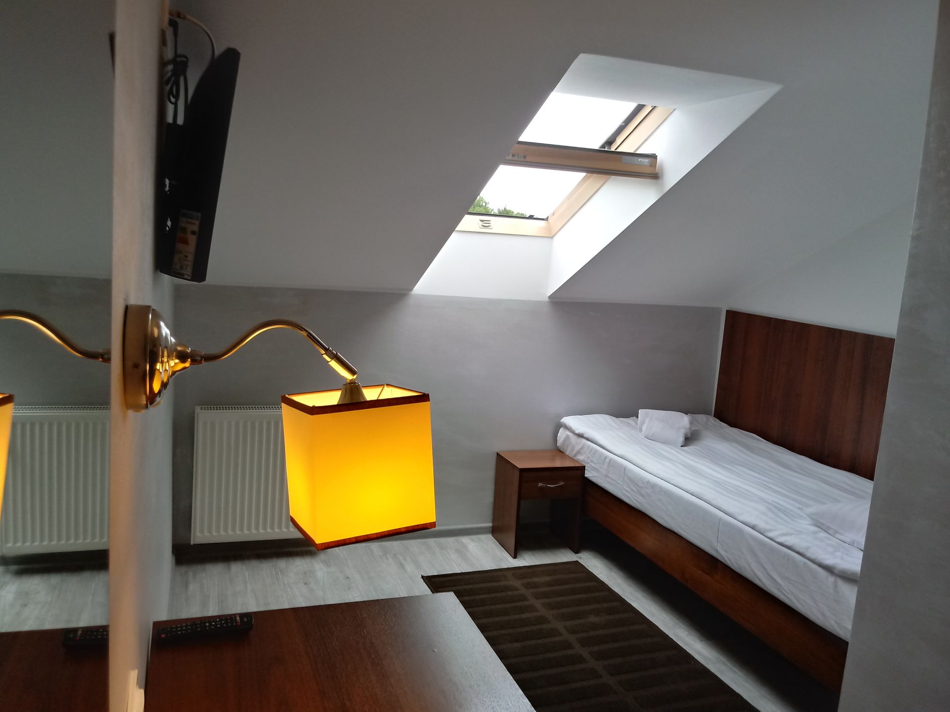 Pokój o powierzchni ok. 10m2, usytuowany na 3 kondygnacji budynku, wyposażony w TV, Wi - Fi, zestaw do parzenia herbaty . W pokoju znajduje się łazienka z prysznicem. Dla każdego z gości przygotowaliśmy zestaw ręczników. Przytulny pokój z oknem poddaszowym. Pokój idealny dla 1 osoby na krótki pobyt. Istnieje możliwość wypożyczenia żelazka oraz suszarki do włosów z recepcji hotelu.