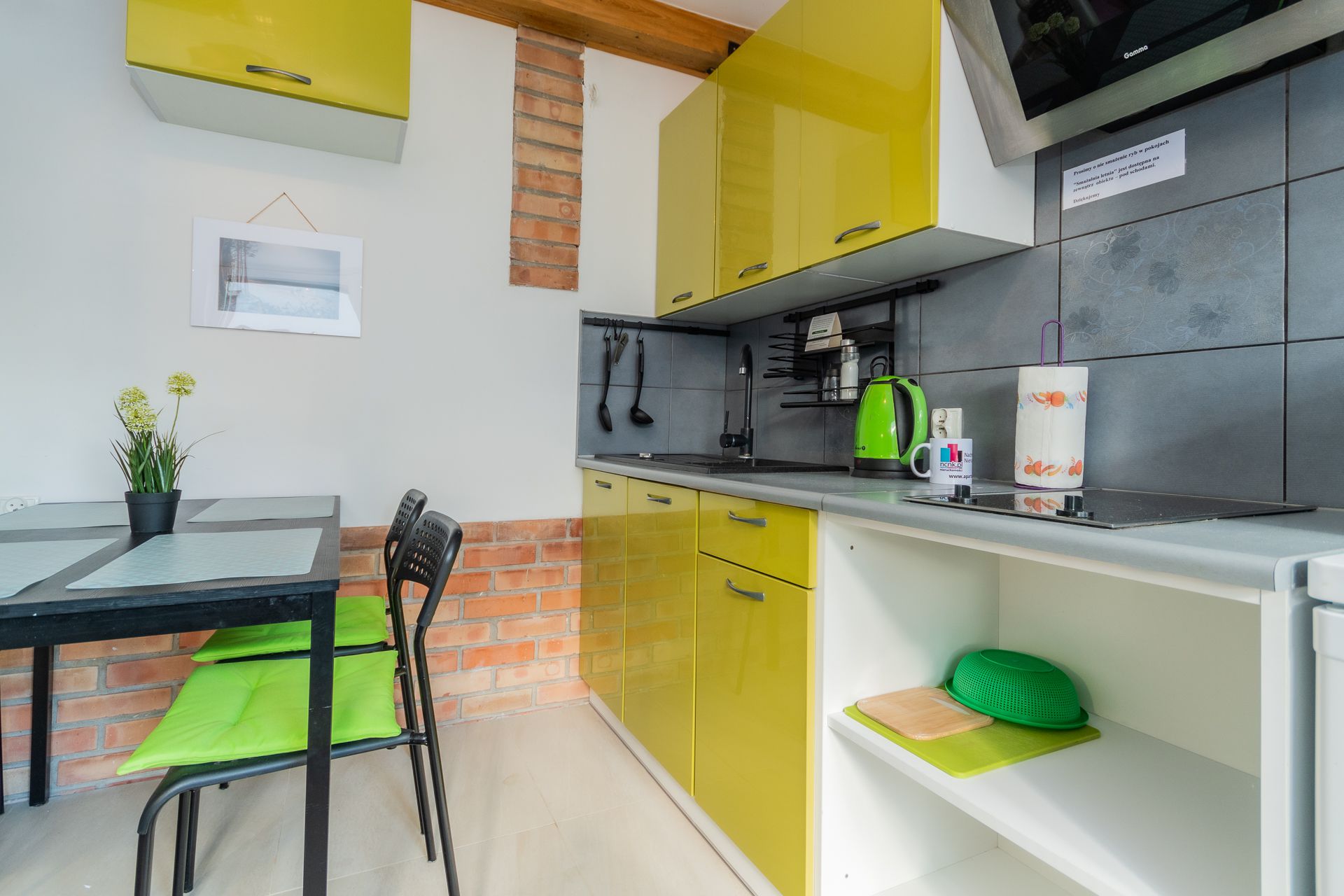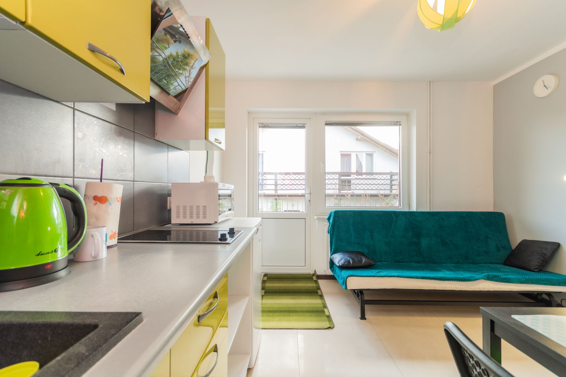 Na parterze kuchnia: lodówka, płyta grzewcza, mikrofala. Okolicznościowa sofa dwuosobowa.