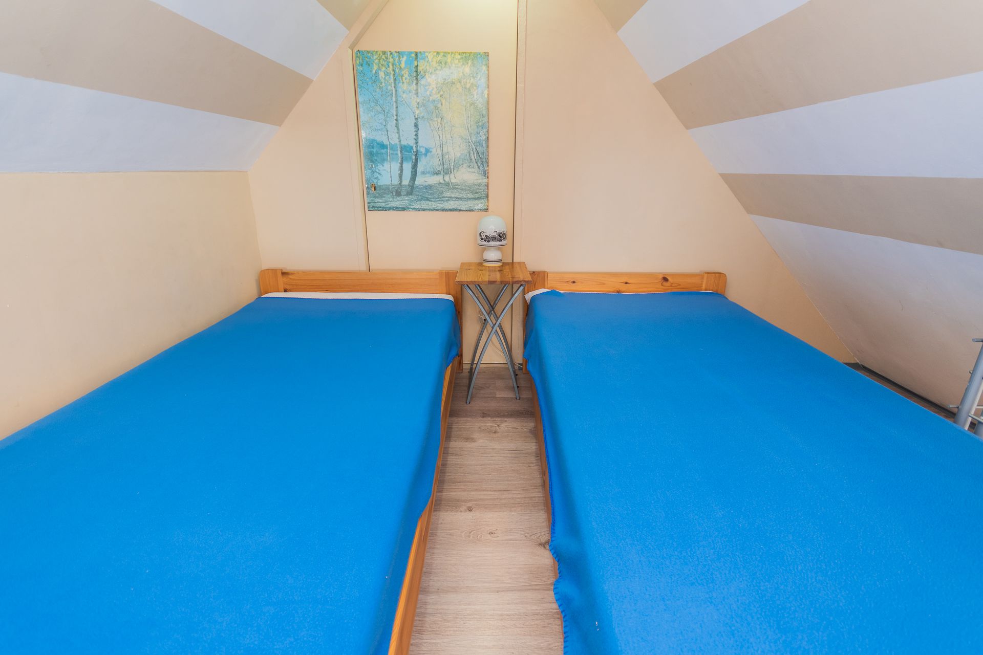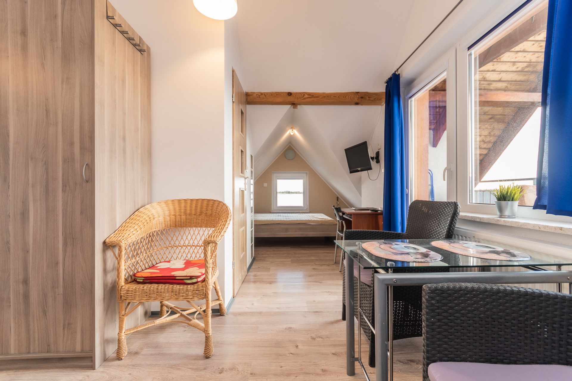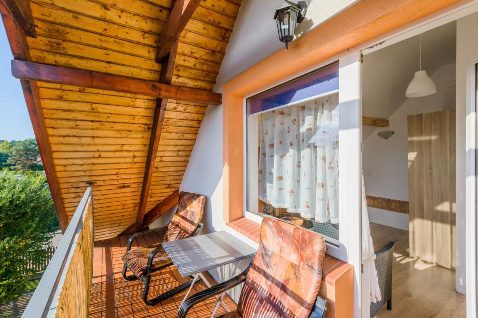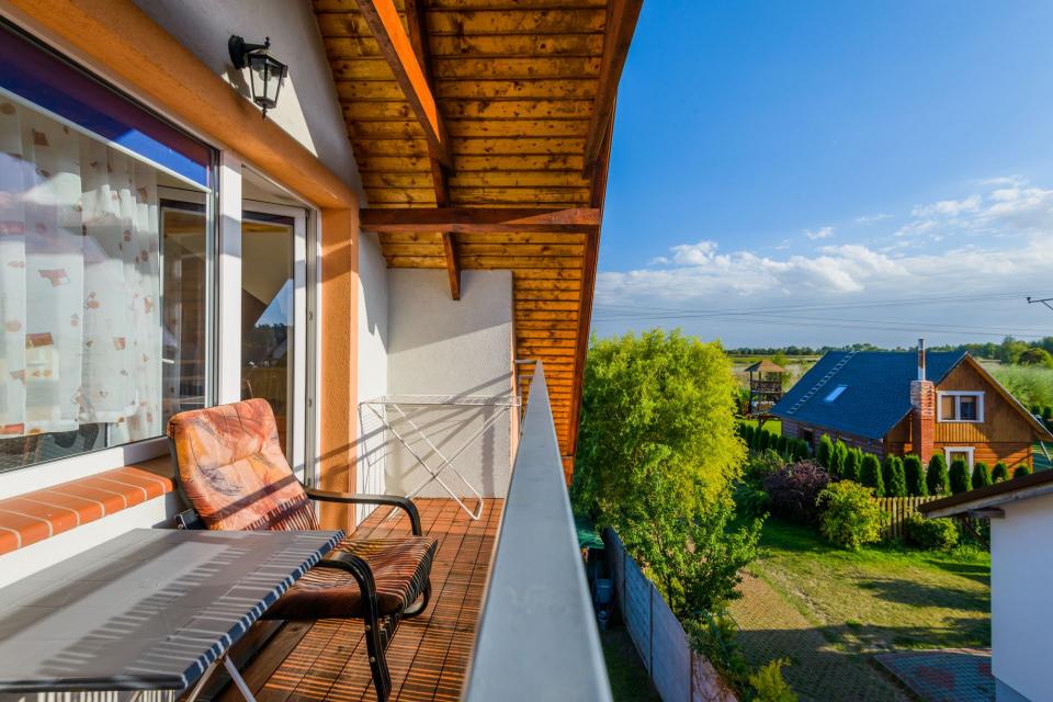Na poddaszu: łoże małżeńskie 140x200 cm, 2 x łóżko sosnowe 90x200 cm, balkon z widokiem na Zalew Wiślany. Strona zachodnia. Powierzchnia ok. 25 m2.