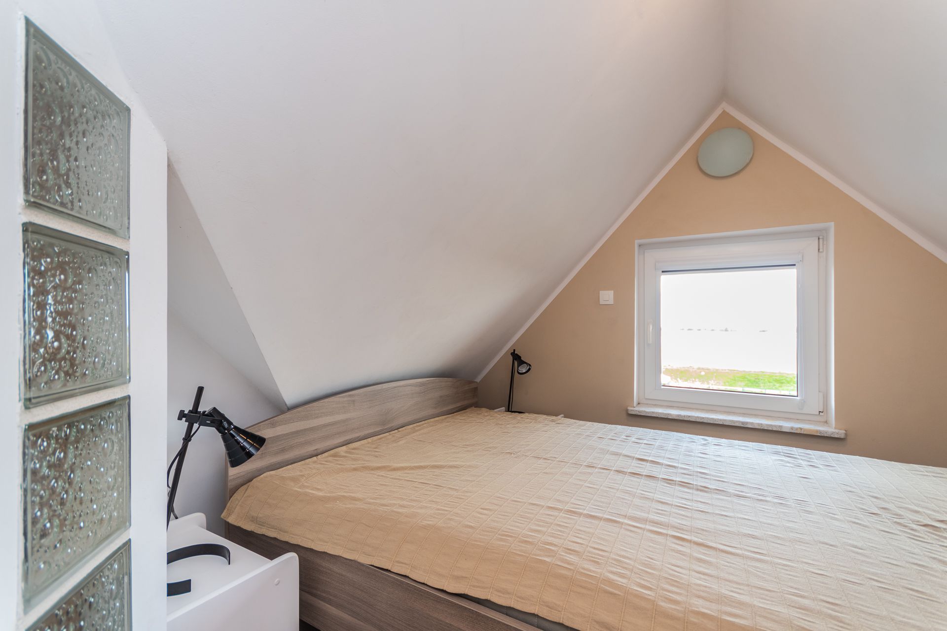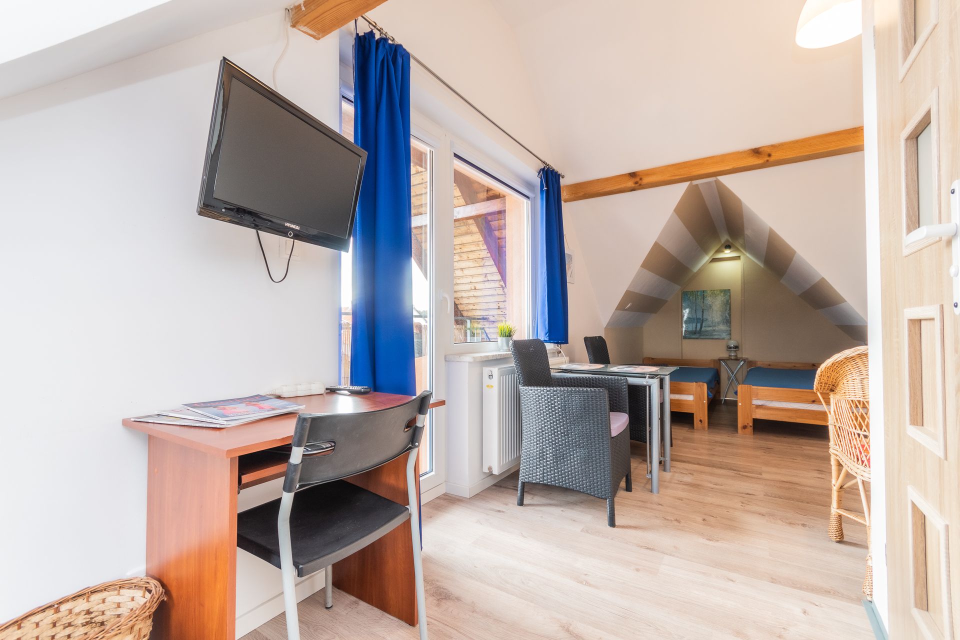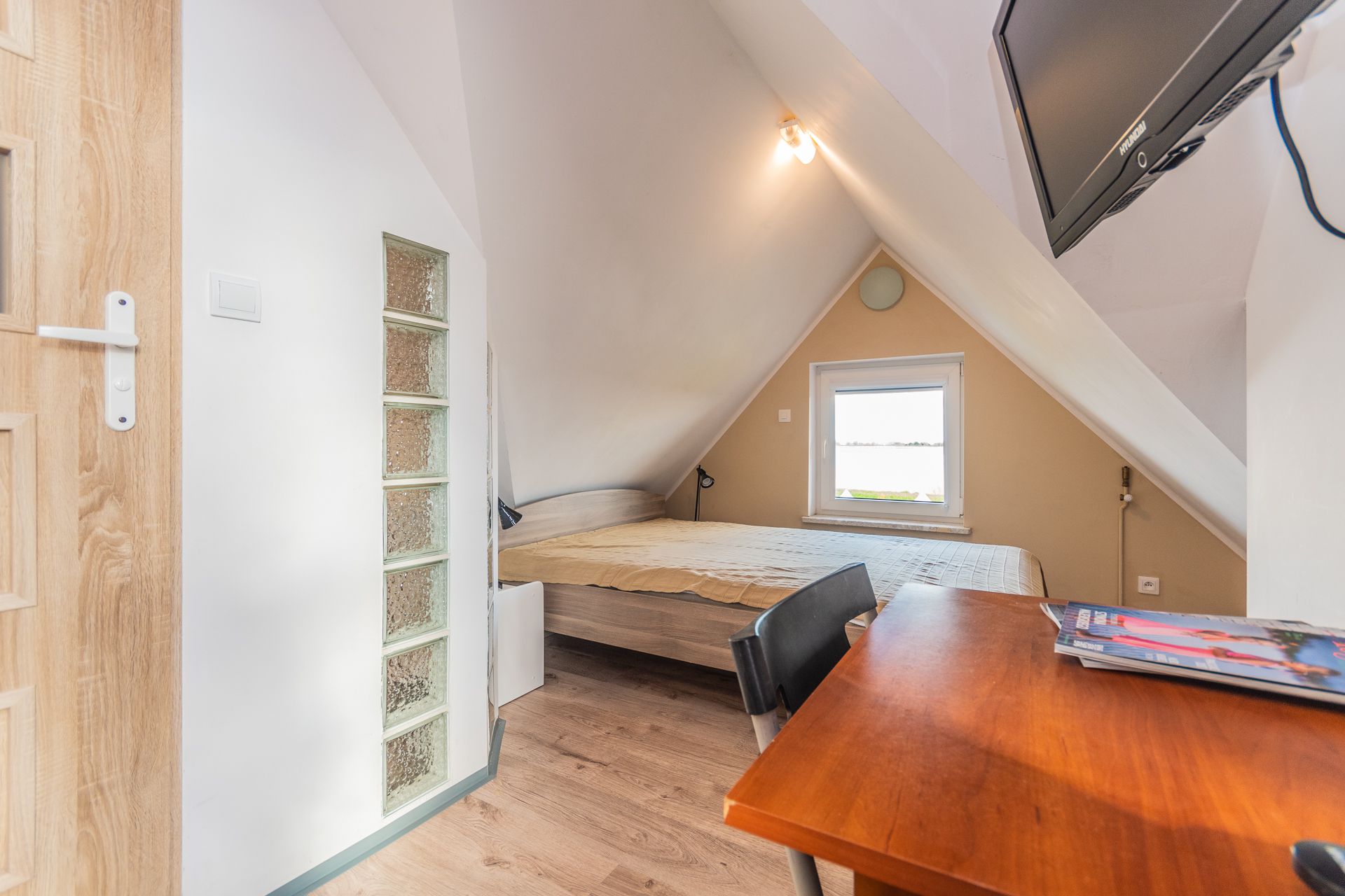 Na poddaszu: łoże małżeńskie 140x200 cm, 2 x łóżko sosnowe 90x200 cm, balkon z widokiem na Zalew Wiślany. Strona zachodnia. Powierzchnia ok. 25 m2.