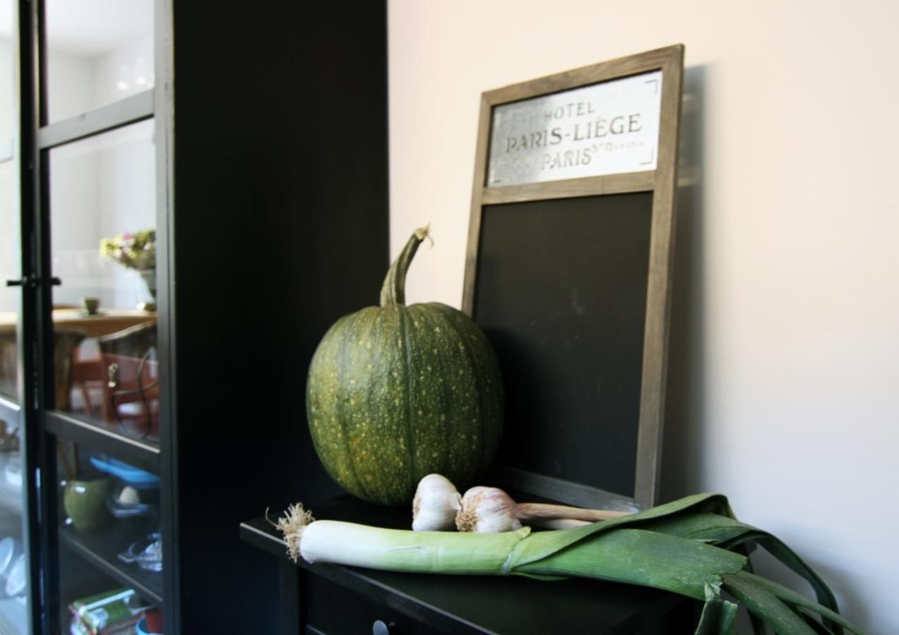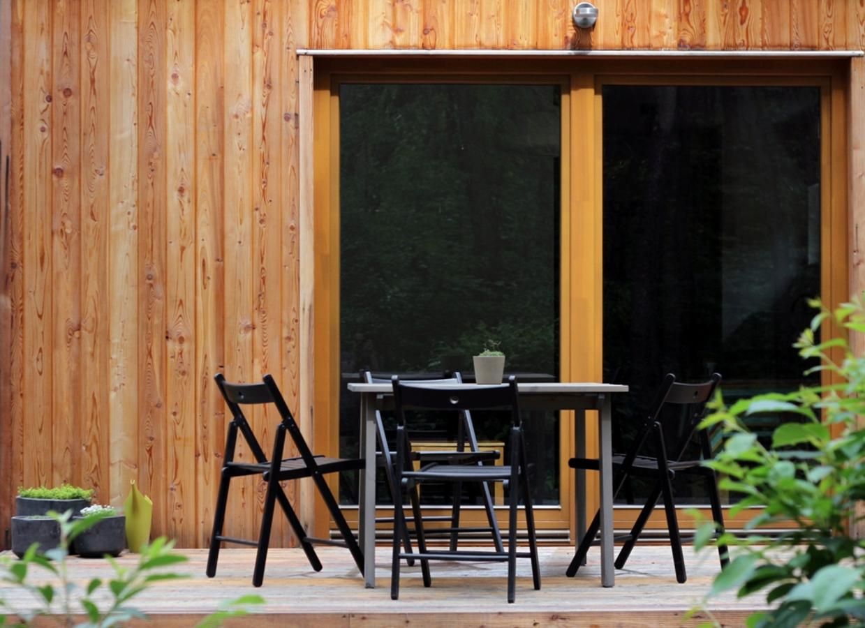 Jeden z trzech domków, domek środkowy, posiada taras z widokiem na las. W wystroju zielone i żółte akcenty.