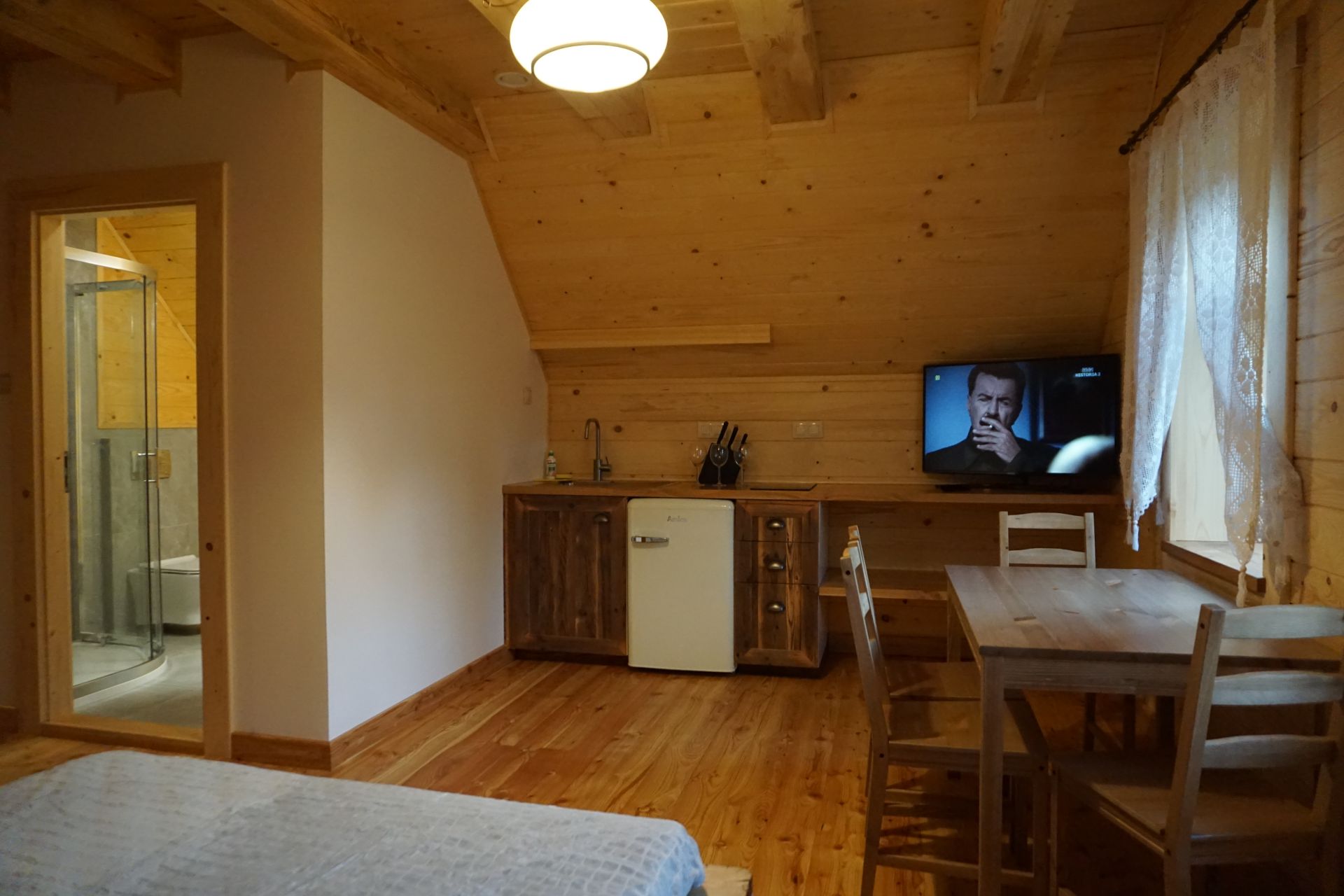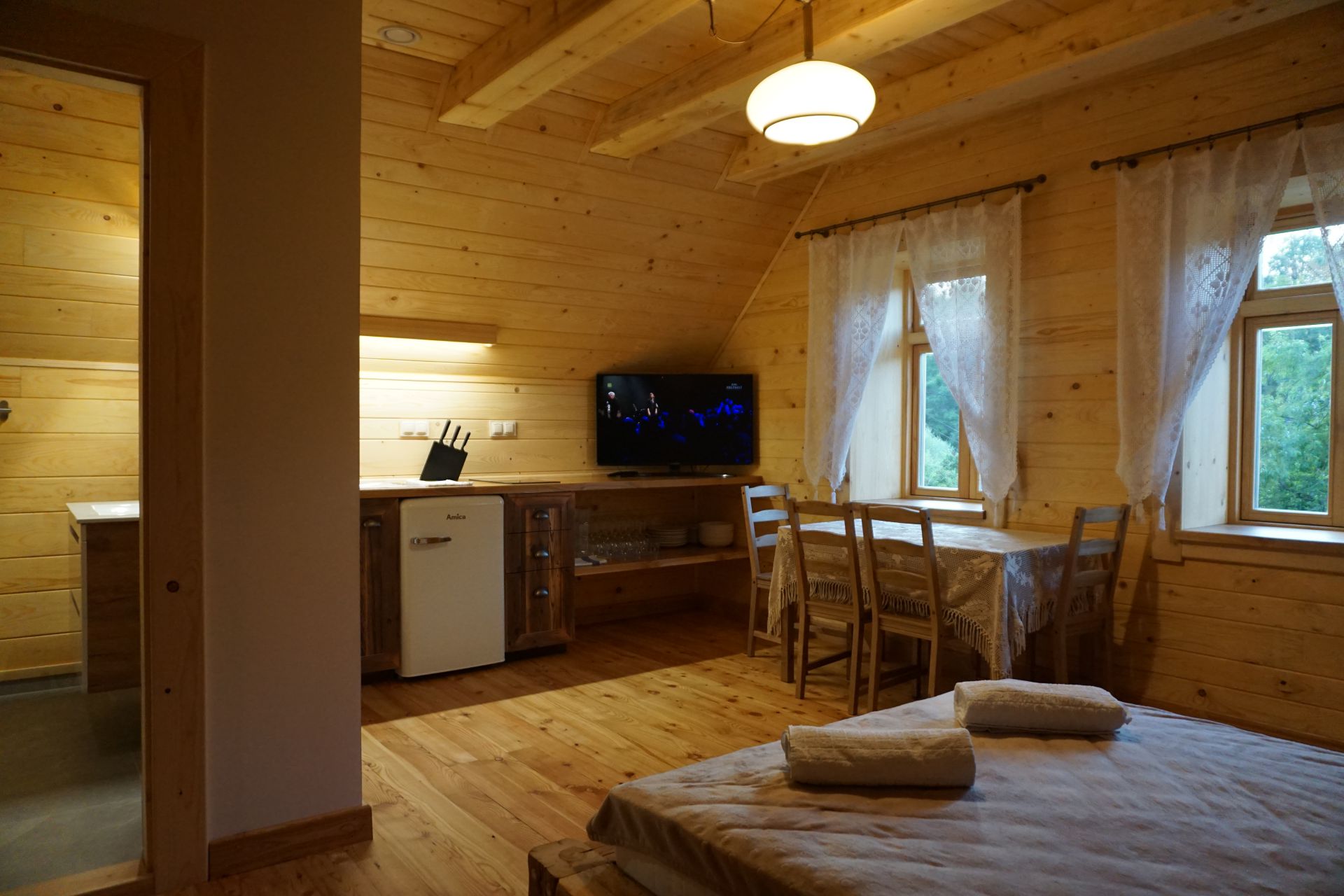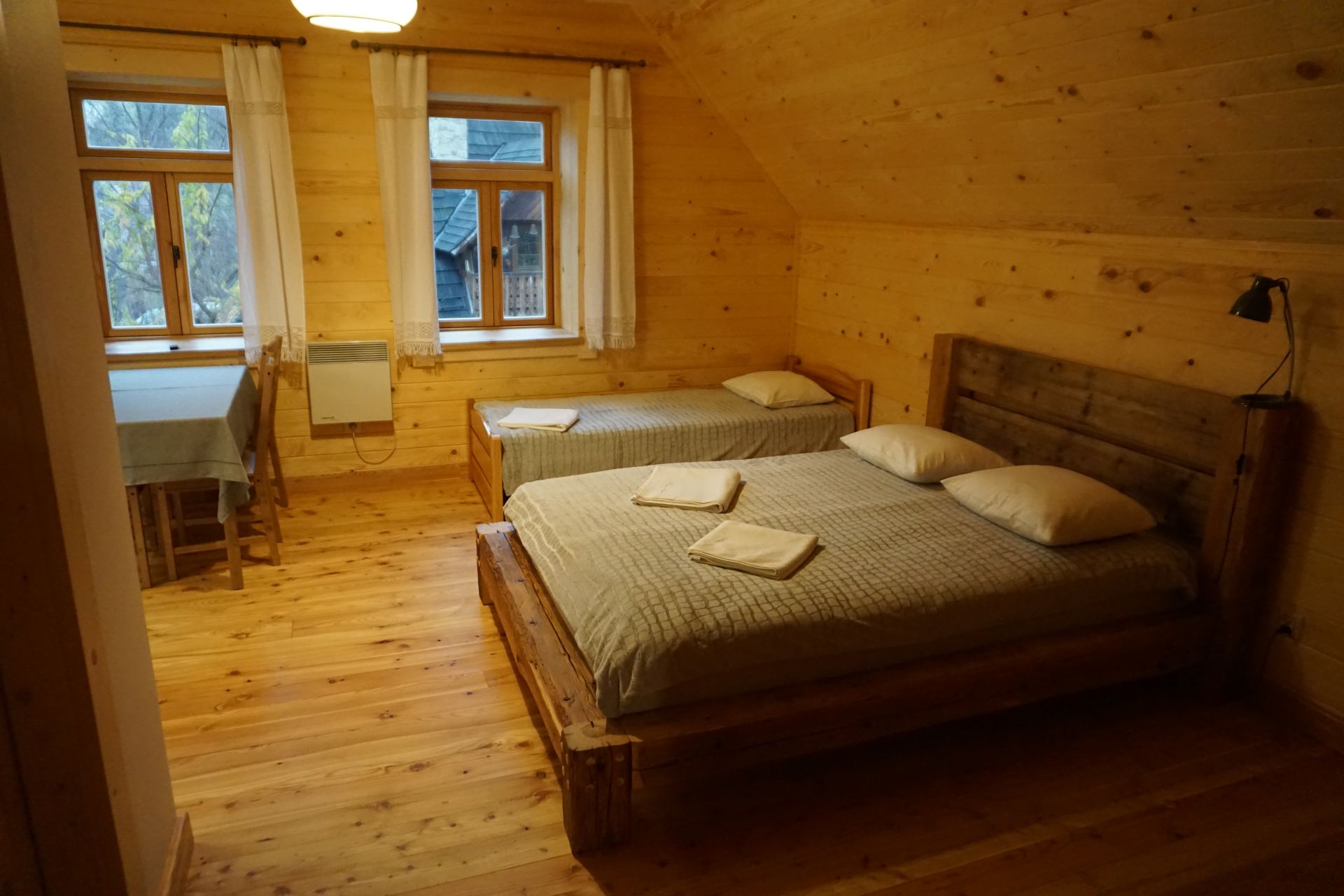 Ten trzyosobowy pokój wyposażony jest w aneks kuchenny i łazienkę. W pokoju jest pojedyncze oraz podwójne łóżko, stół i cztery krzesła, nowoczesny telewizor z wi-fi. Ściany wykonane są w większości z drewna a podłogi z desek modrzewiowych. Pokój ma dwa okna z widokiem na stary drewniany dom kryty gontem.