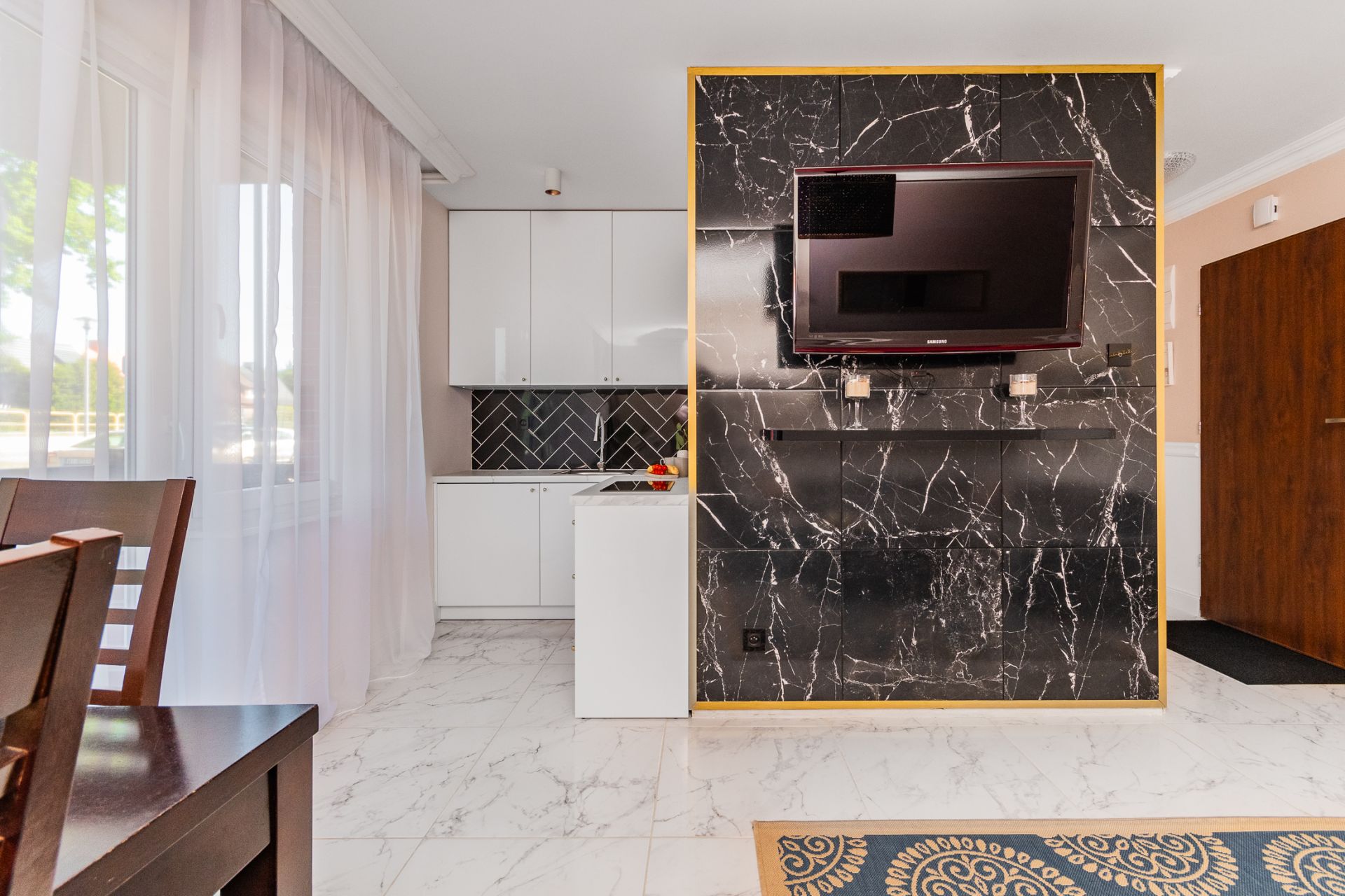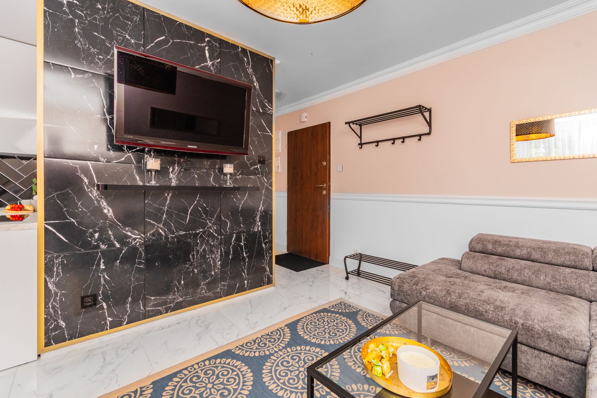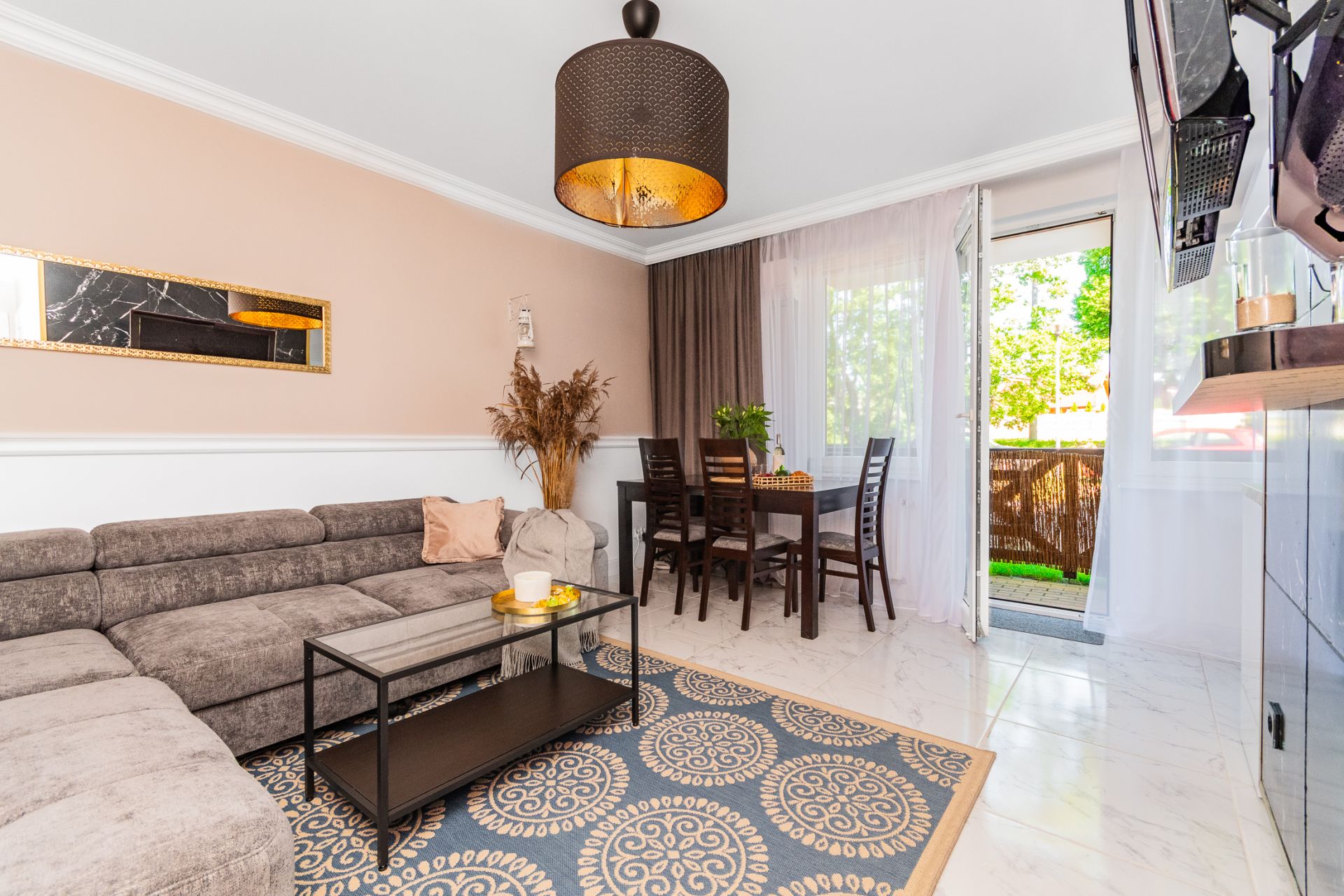 ?️ Salon z wygodną sofą i aneksem kuchennym
