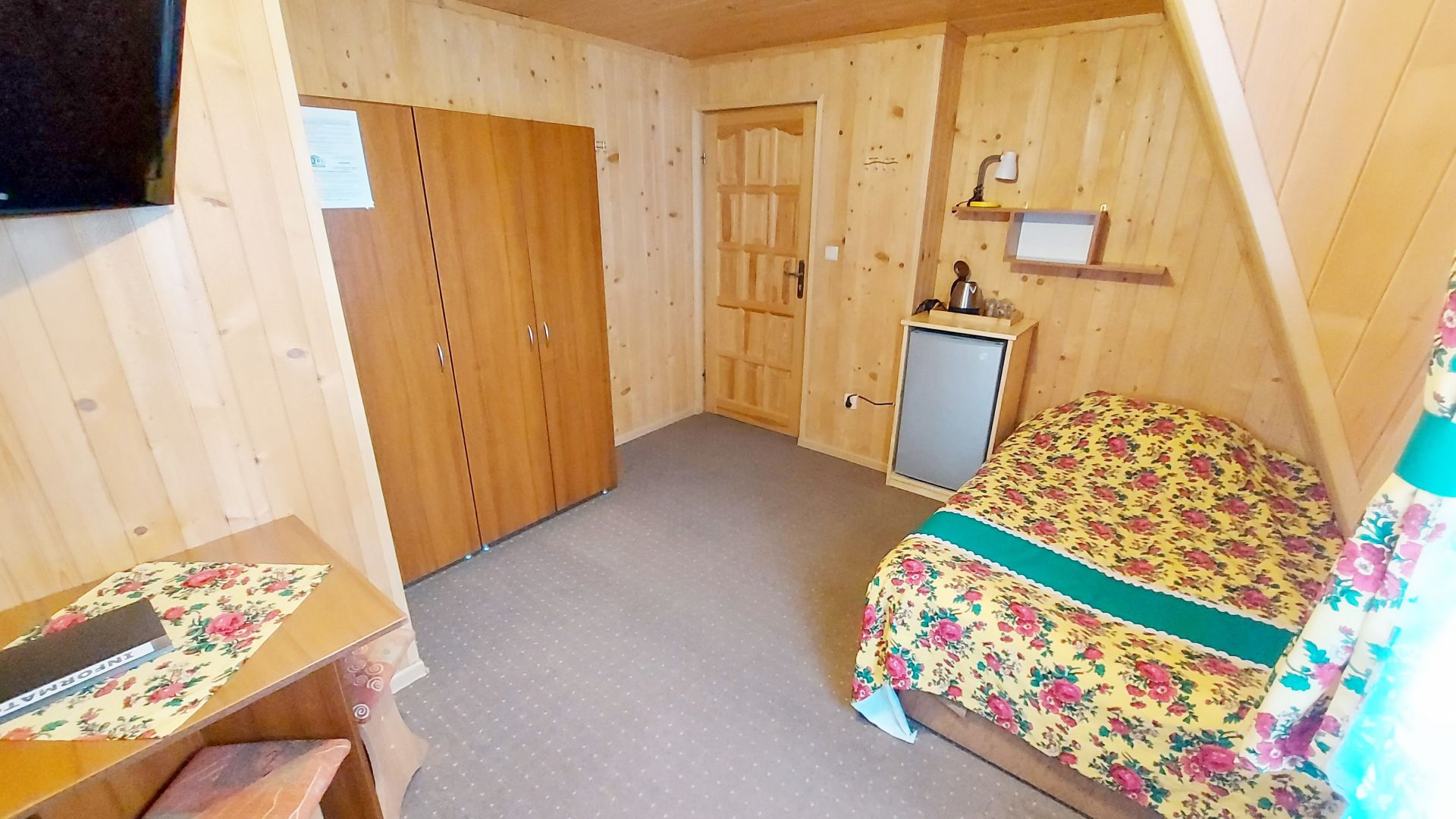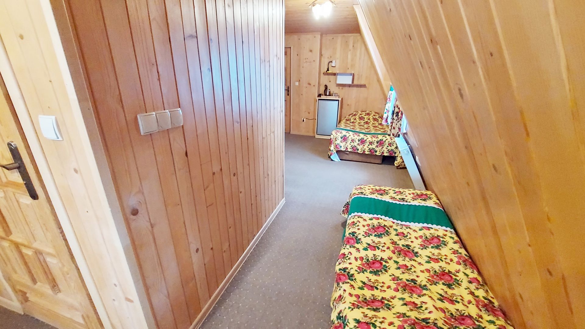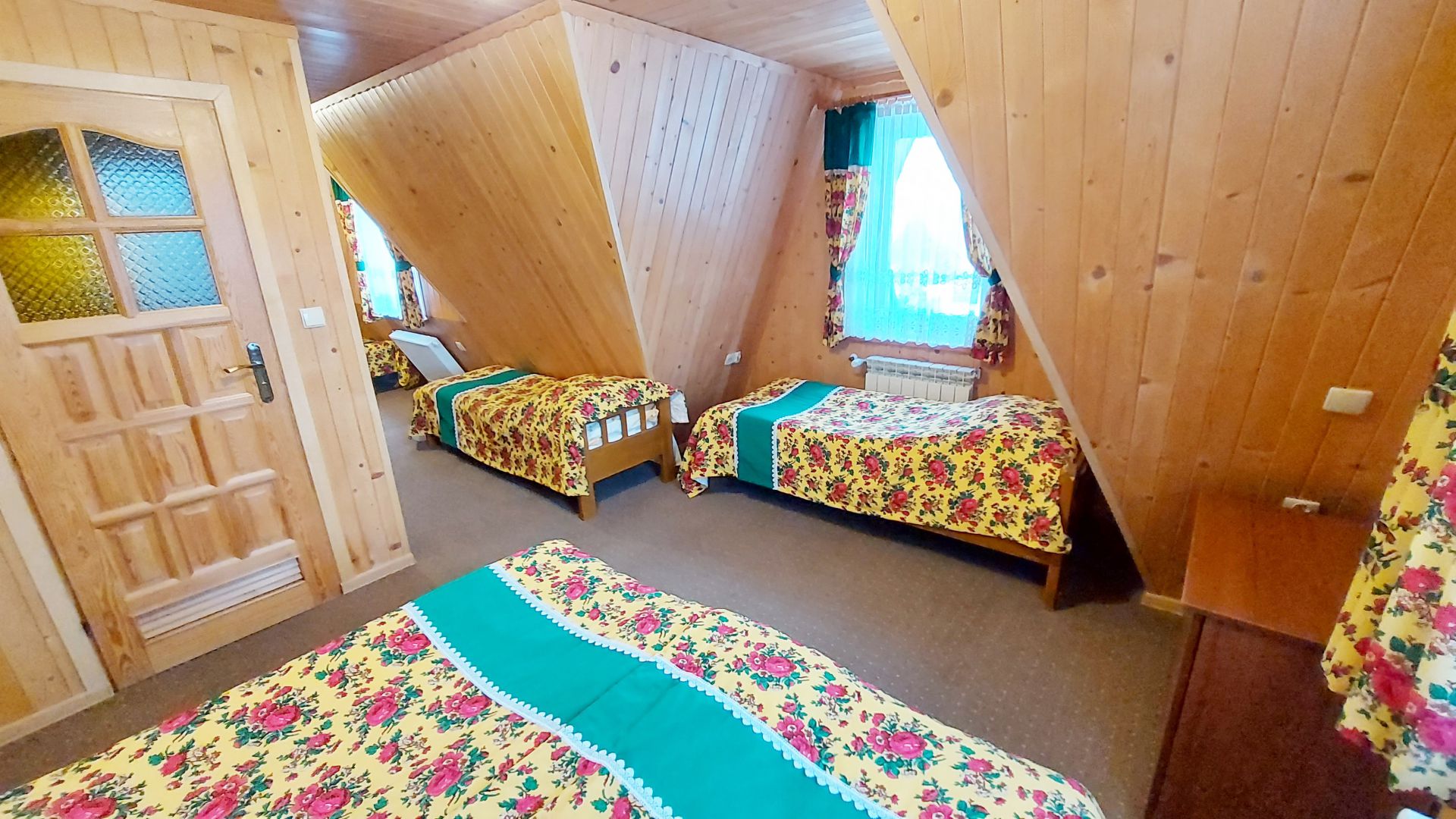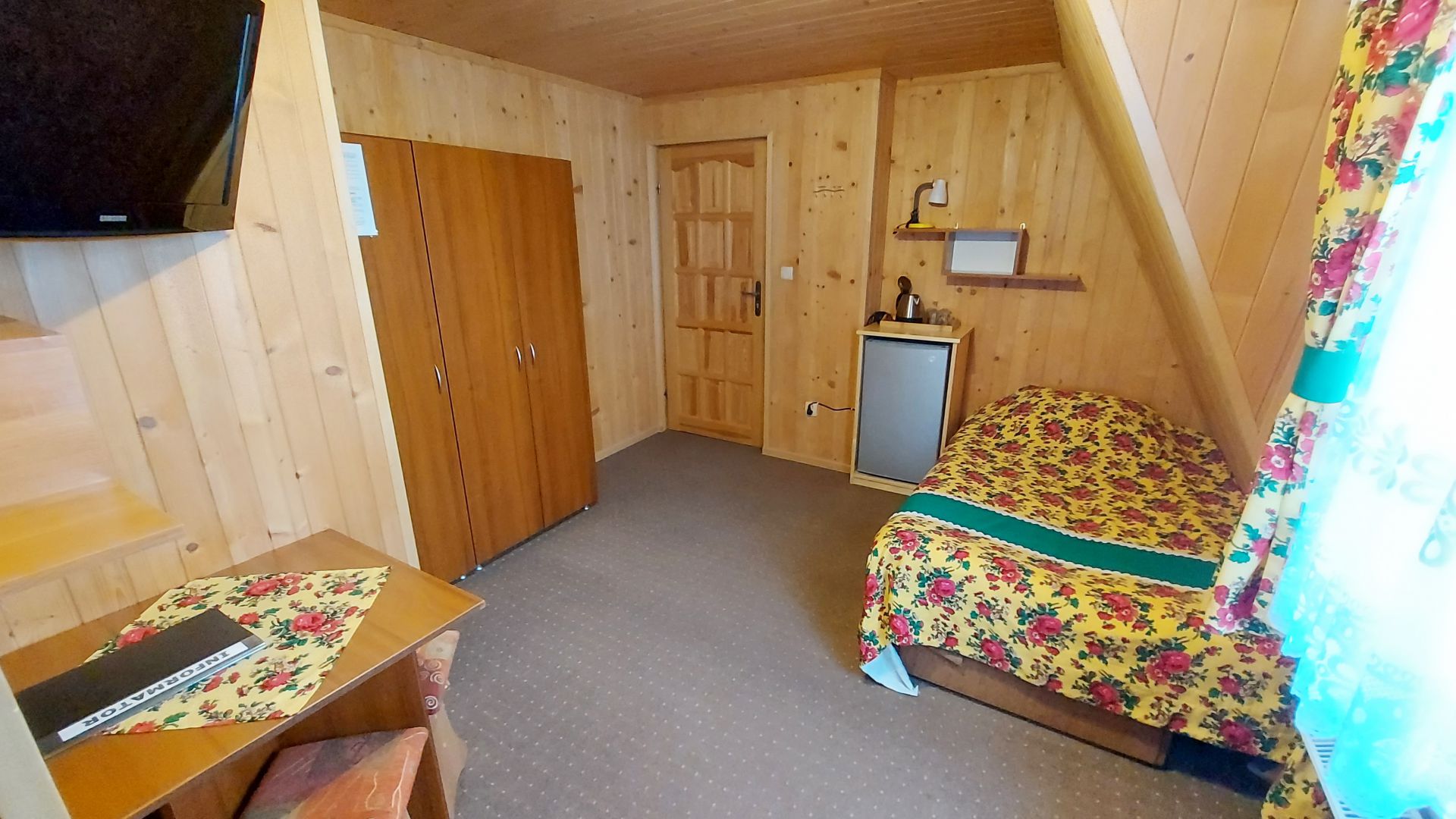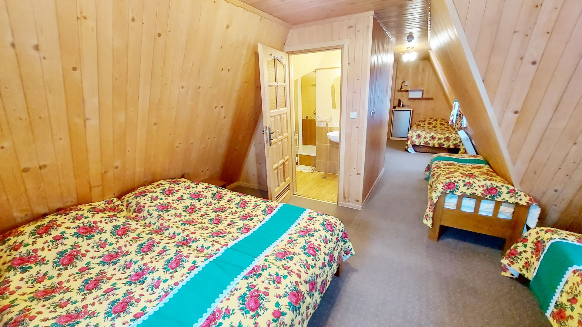 Willa Stachoniówka - pokój dla dużej rodziny (max 5 osób, chyba że dodatkową osobą jest dziecko w wieku do lat 3). W pokoju znajduje się własna łazienka (toaleta, kabina natryskowa, umywalka) i duży telewizor (led 32 cale). Pokój na poddaszu (2 piętro), posiada ściany z drewnianej boazerii.