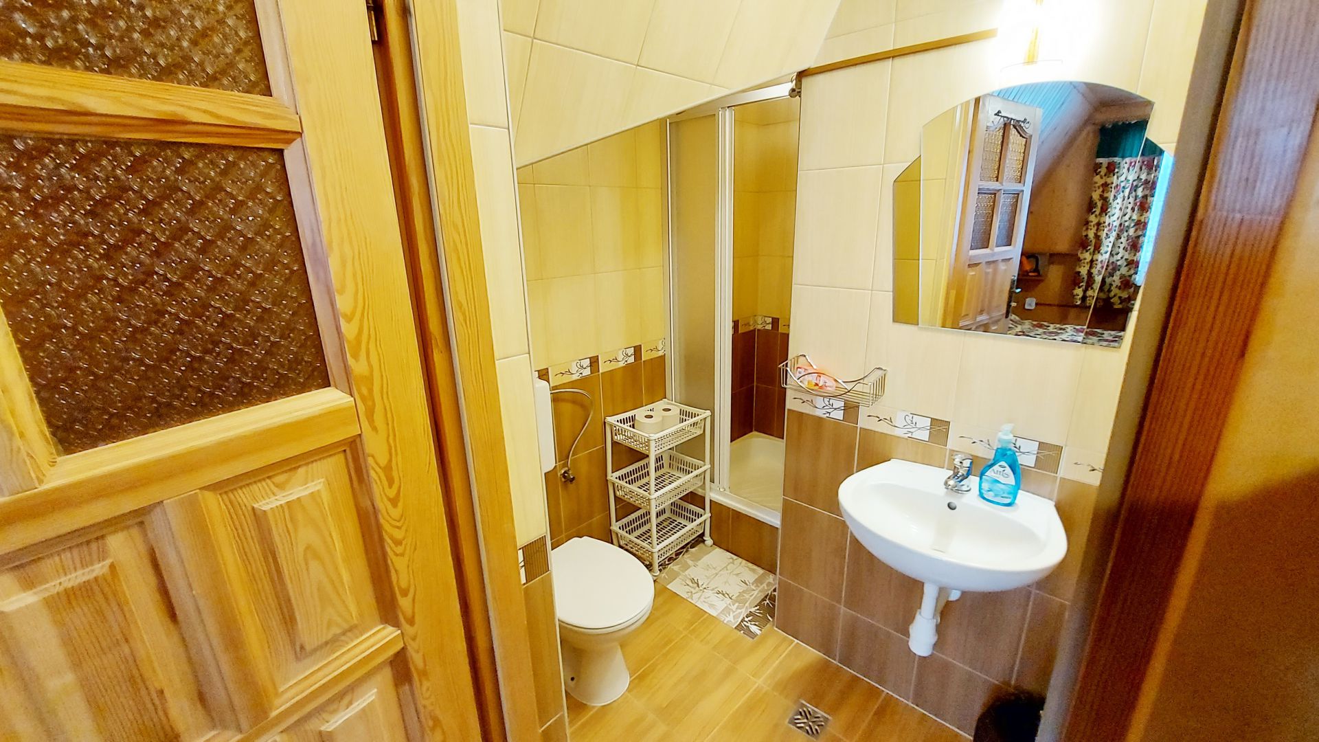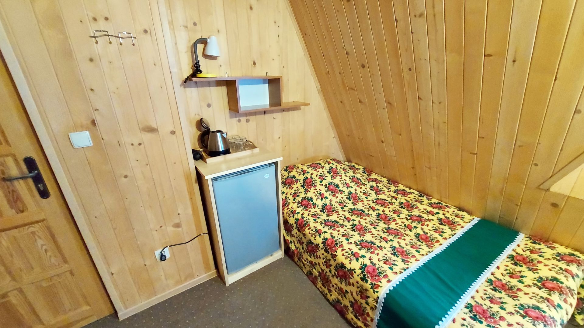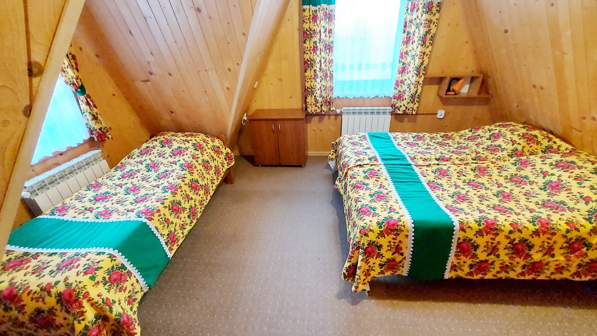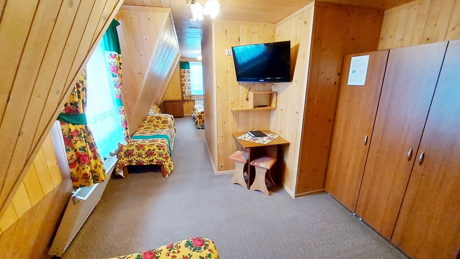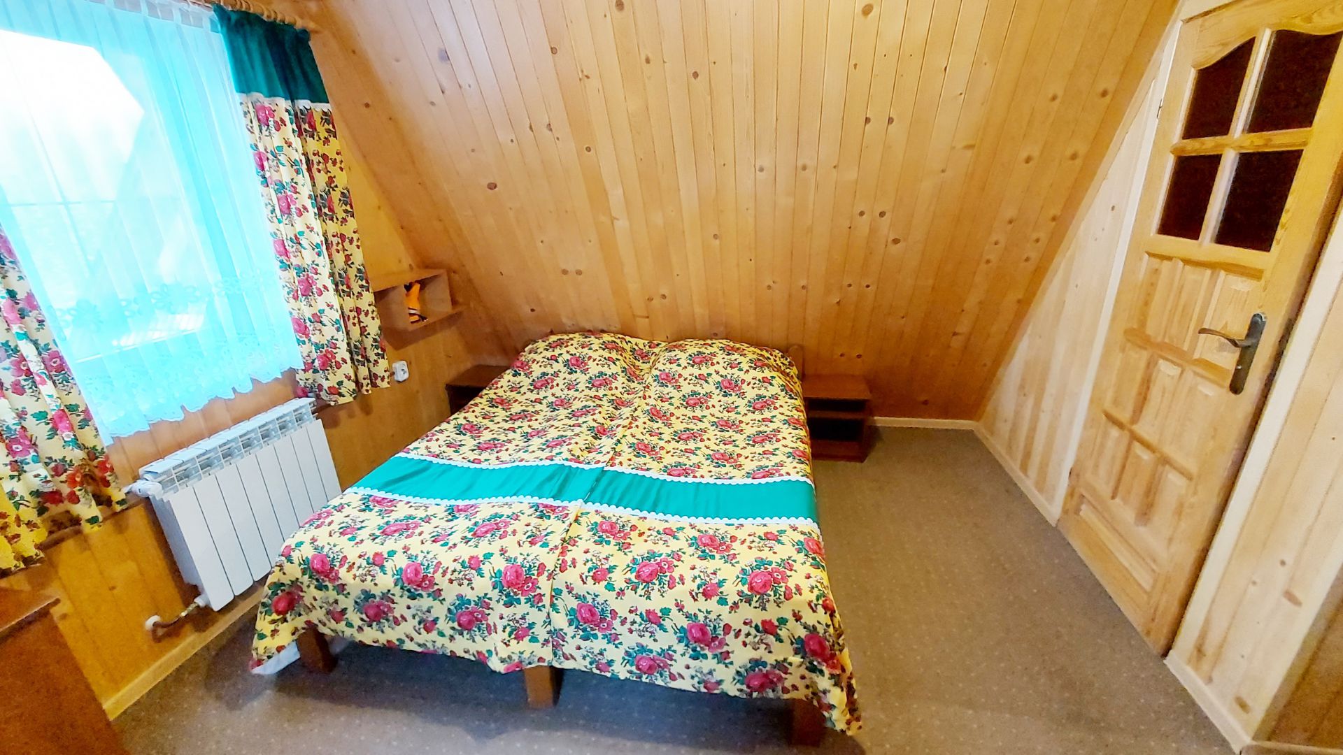 Willa Stachoniówka - pokój dla dużej rodziny (max 5 osób, chyba że dodatkową osobą jest dziecko w wieku do lat 3). W pokoju znajduje się własna łazienka (toaleta, kabina natryskowa, umywalka) i duży telewizor (led 32 cale). Pokój na poddaszu (2 piętro), posiada ściany z drewnianej boazerii.