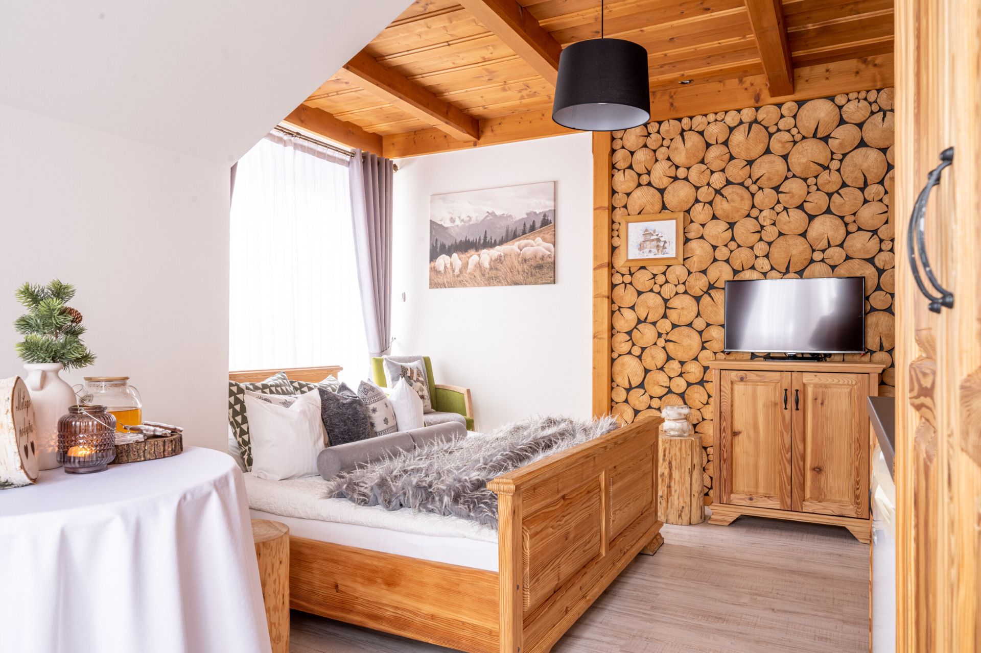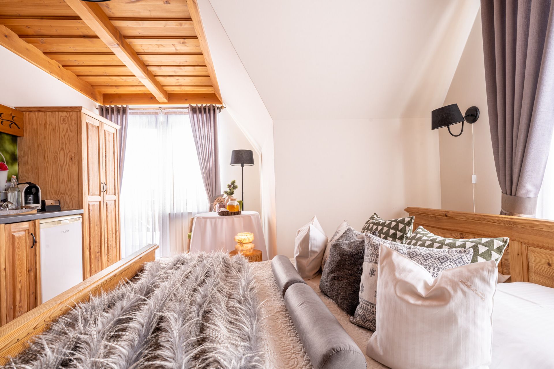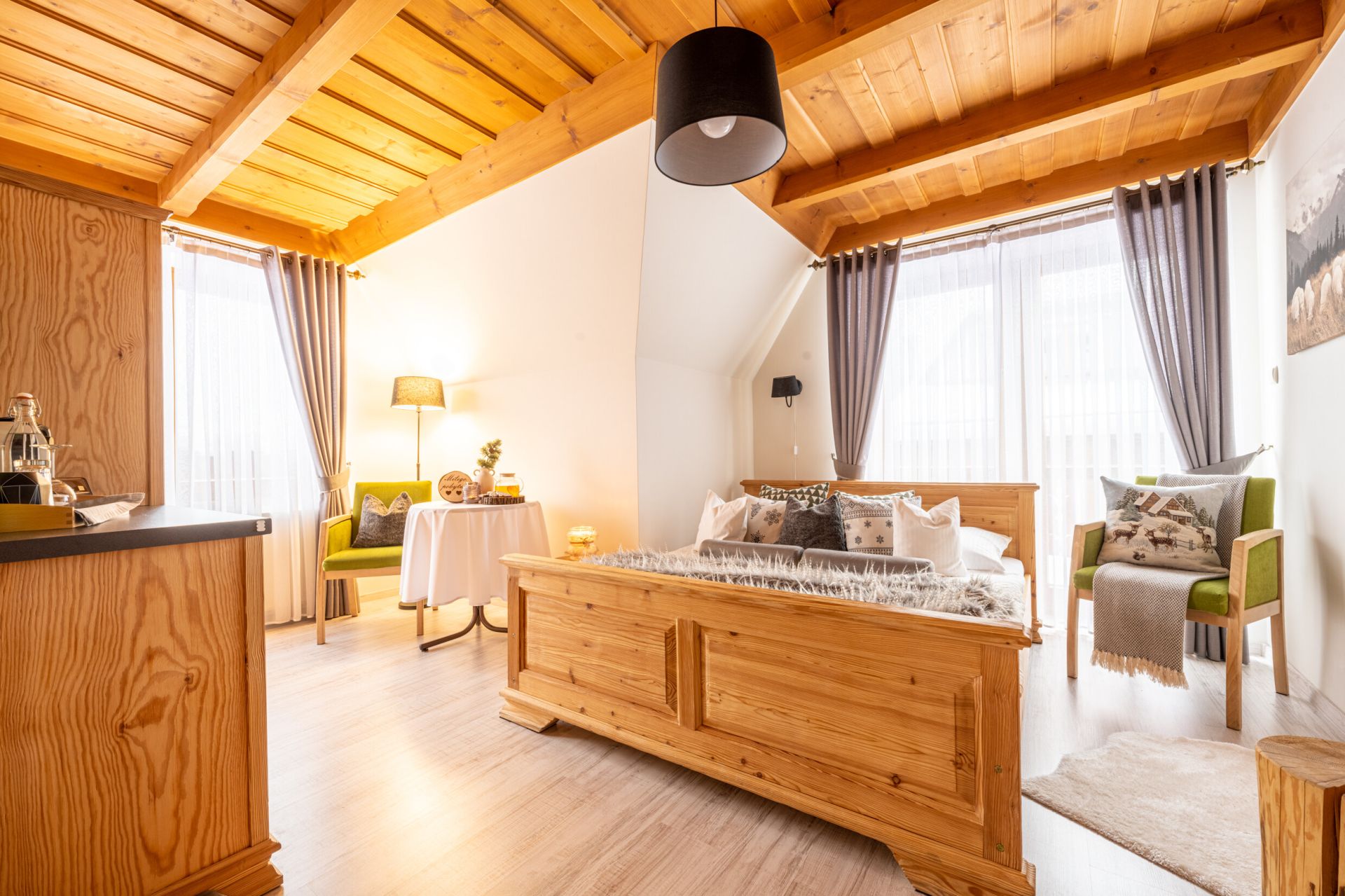 Komfortowy pokój z balkonem w którym dominuje drewno. Ciepłe elementy drewna oraz kolorystyka wnętrza zapewniają spokojną atmosferę do idealnego odpoczynku. W pokoju znajduje się w pełni wyposażony aneks kuchenny i łazienka z prysznicem.
