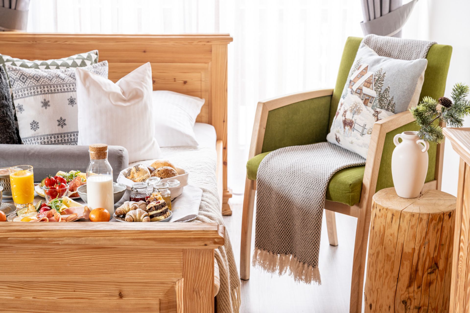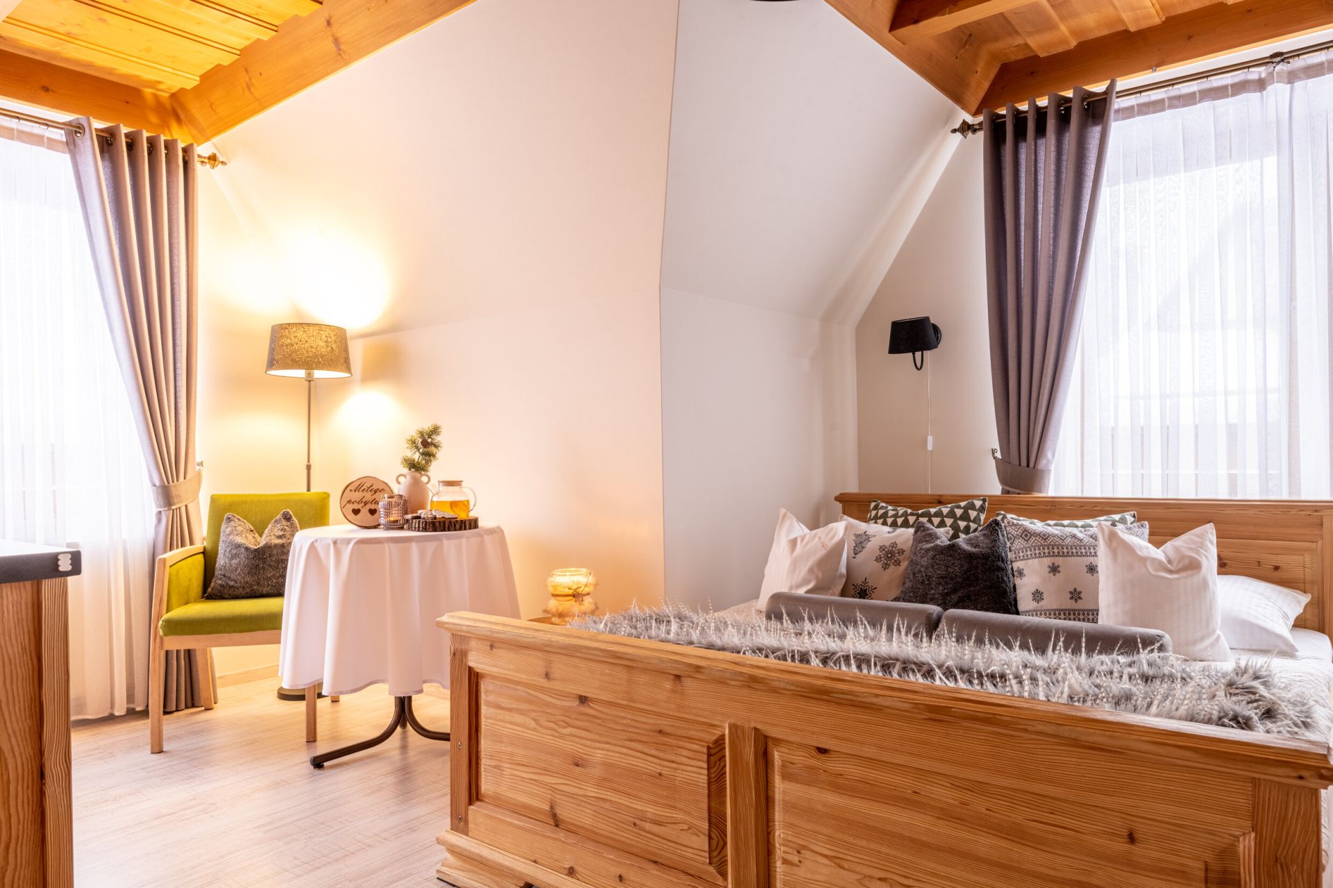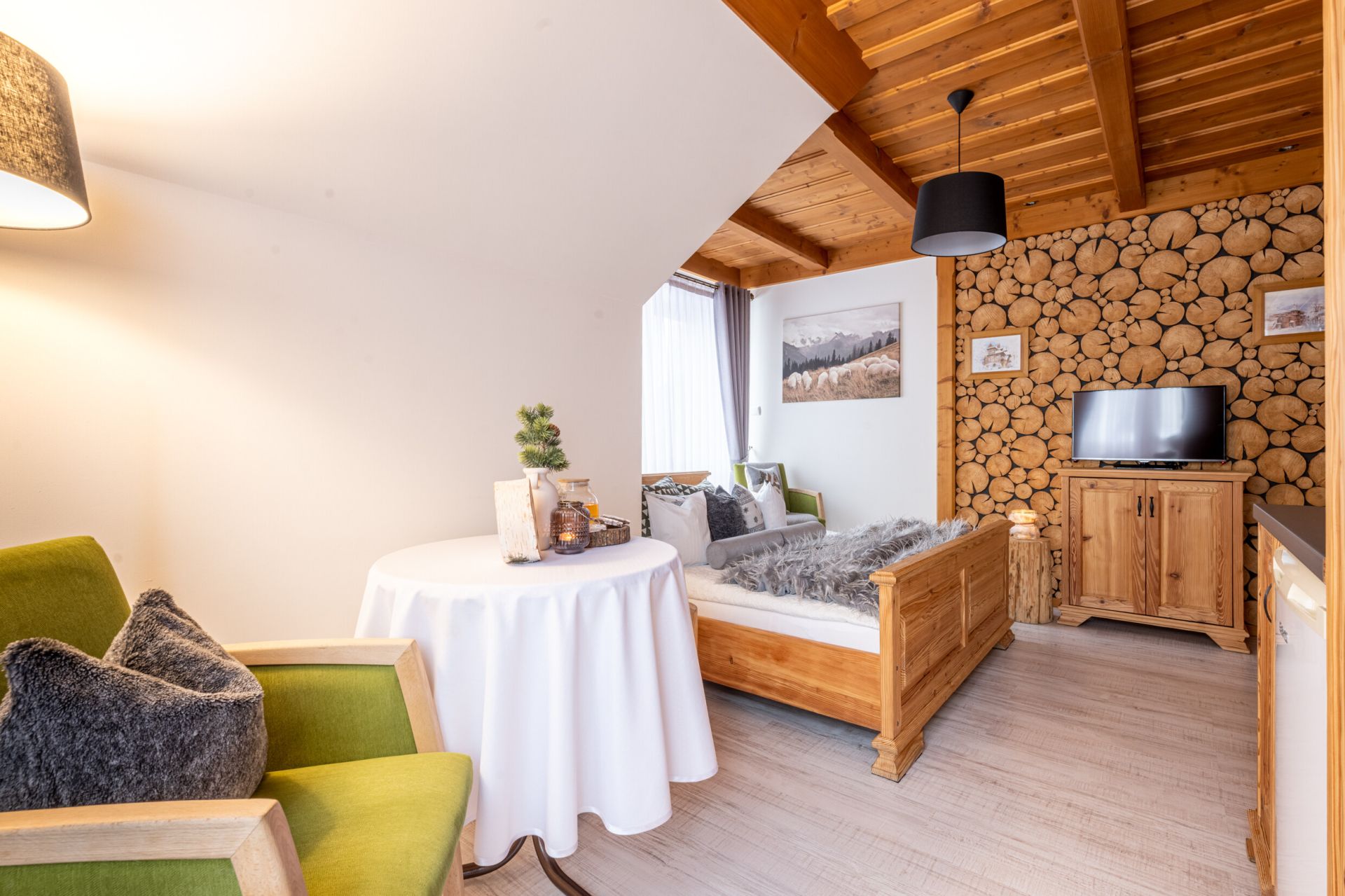Komfortowy pokój z balkonem w którym dominuje drewno. Ciepłe elementy drewna oraz kolorystyka wnętrza zapewniają spokojną atmosferę do idealnego odpoczynku. W pokoju znajduje się w pełni wyposażony aneks kuchenny i łazienka z prysznicem.