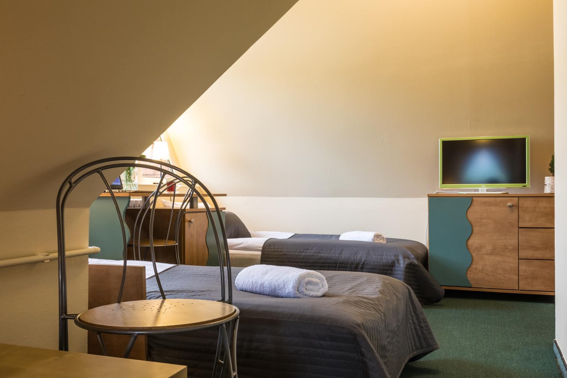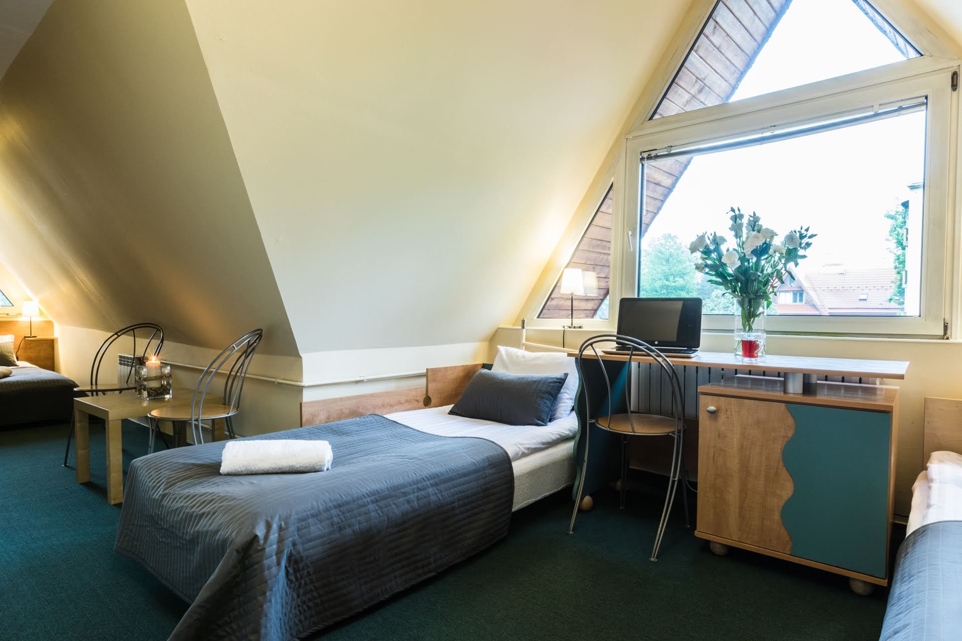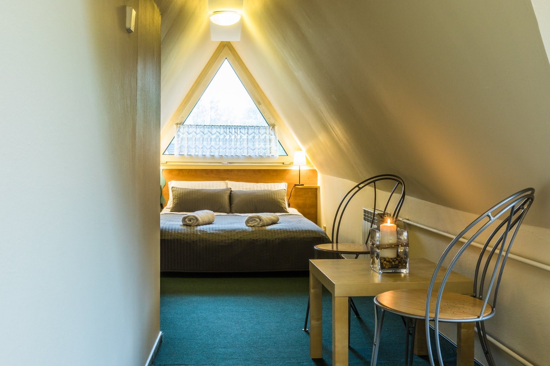 Pokój na poddaszu ze skosami o powierzchni pokoju 24 m² – czteroosobowy z łóżkiem małżeńskim i dwoma łóżkami pojedynczymi. Podłoga wyłożona wykładziną podłogową, Zlokalizowany od strony wschodniej. Posiada łazienkę z wanną, szampon, mydło i papier toaletowy. Na wyposażeniu znajdziecie Państwo: lodówkę, Smart TV, czajnik elektryczny, suszarkę do włosów oraz pościel i ręczniki.
