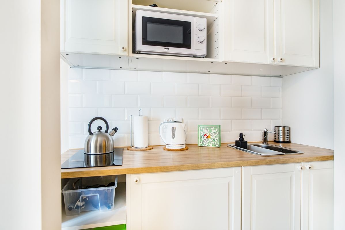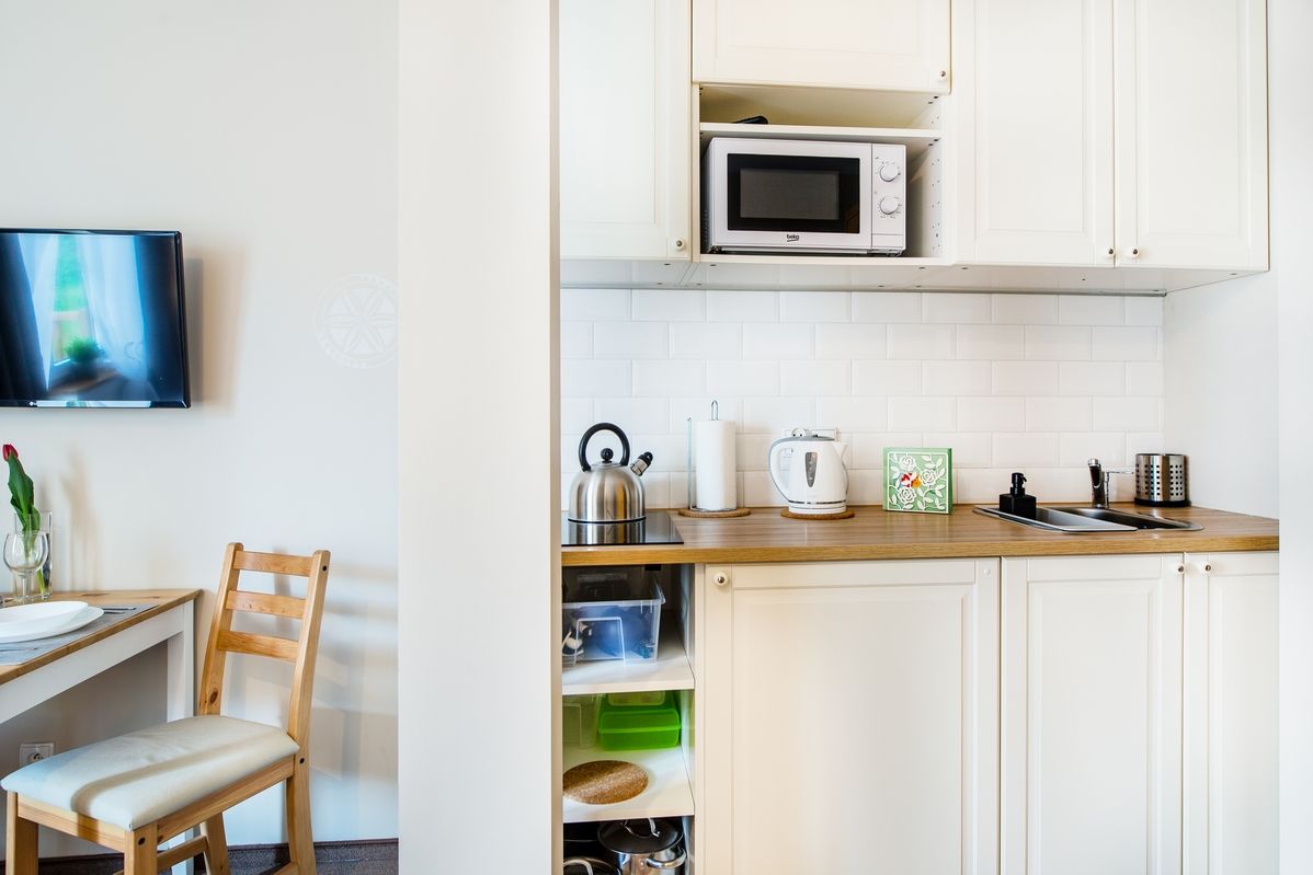 Kuchnia: aneks kuchenny - kuchenka, lodówka, czajnik, naczynia kuchenne