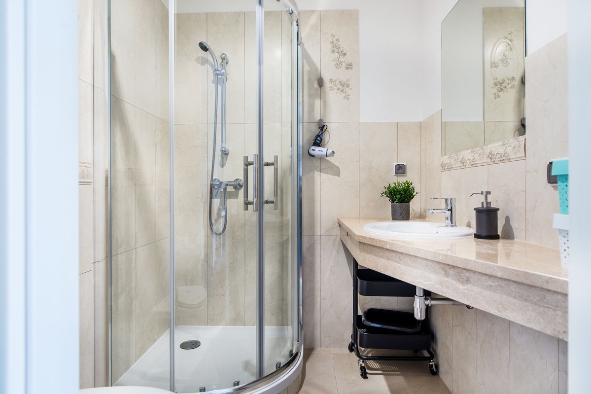 Łazienka: prysznic, suszarka do włosów, ręczniki, mydło