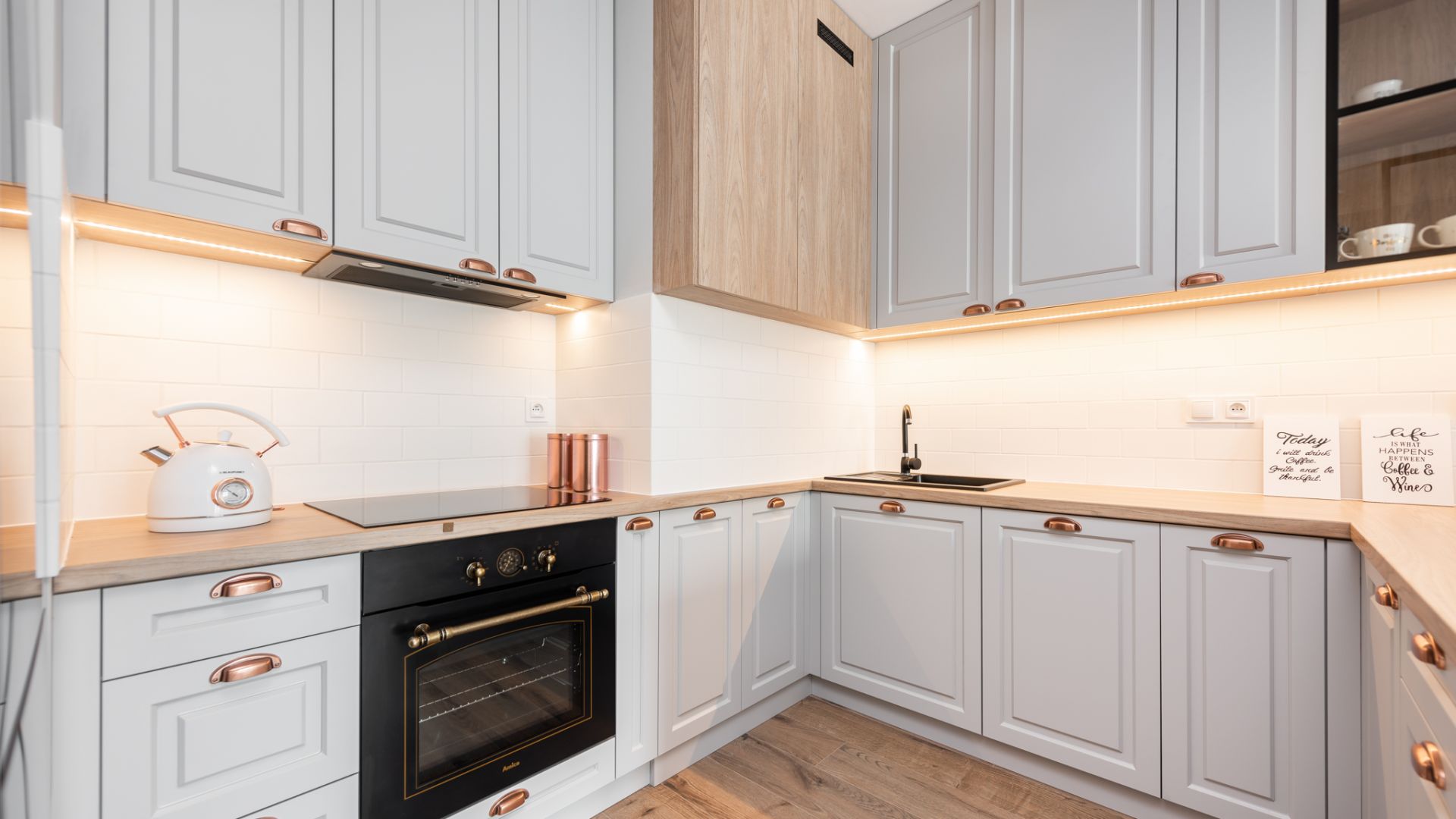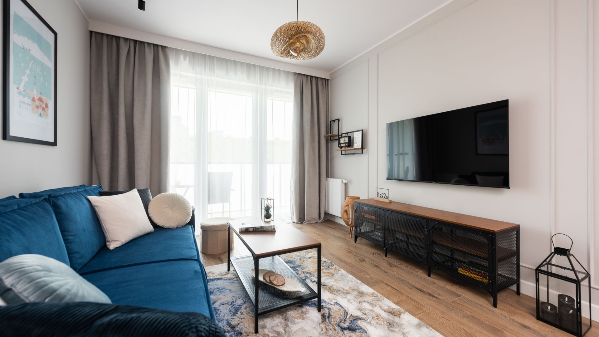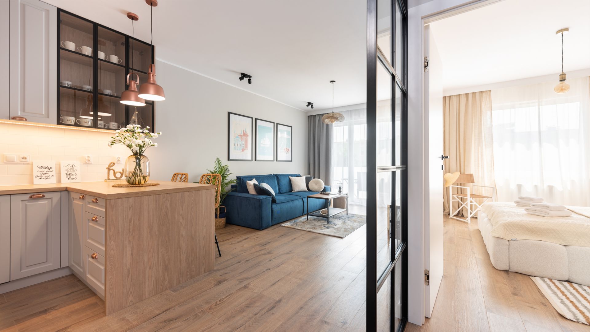 Apartament Brzeźno Seaside 6 to wyjątkowe miejsce na mapie Gdańska, zlokalizowane w nowoczesnej inwestycji Baltea przy ulicy Kaczyńskiego. Wnętrze urzeka współczesnym stylem z wyraźnymi morskimi akcentami, co idealnie koresponduje z bezpośrednim sąsiedztwem Parku Reagana i piaszczystej plaży w Brzeźnie. Sercem mieszkania jest jasny salon z wygodną, welurową sofą w kolorze głębokiego błękitu oraz kolekcją grafik przedstawiających charakterystyczne punkty Gdańska, Sopotu i Gdyni. Przestrzeń ta płynnie łączy się z funkcjonalnym aneksem kuchennym, gdzie miedziane lampy oświetlają stylową wyspę z hokerami.
