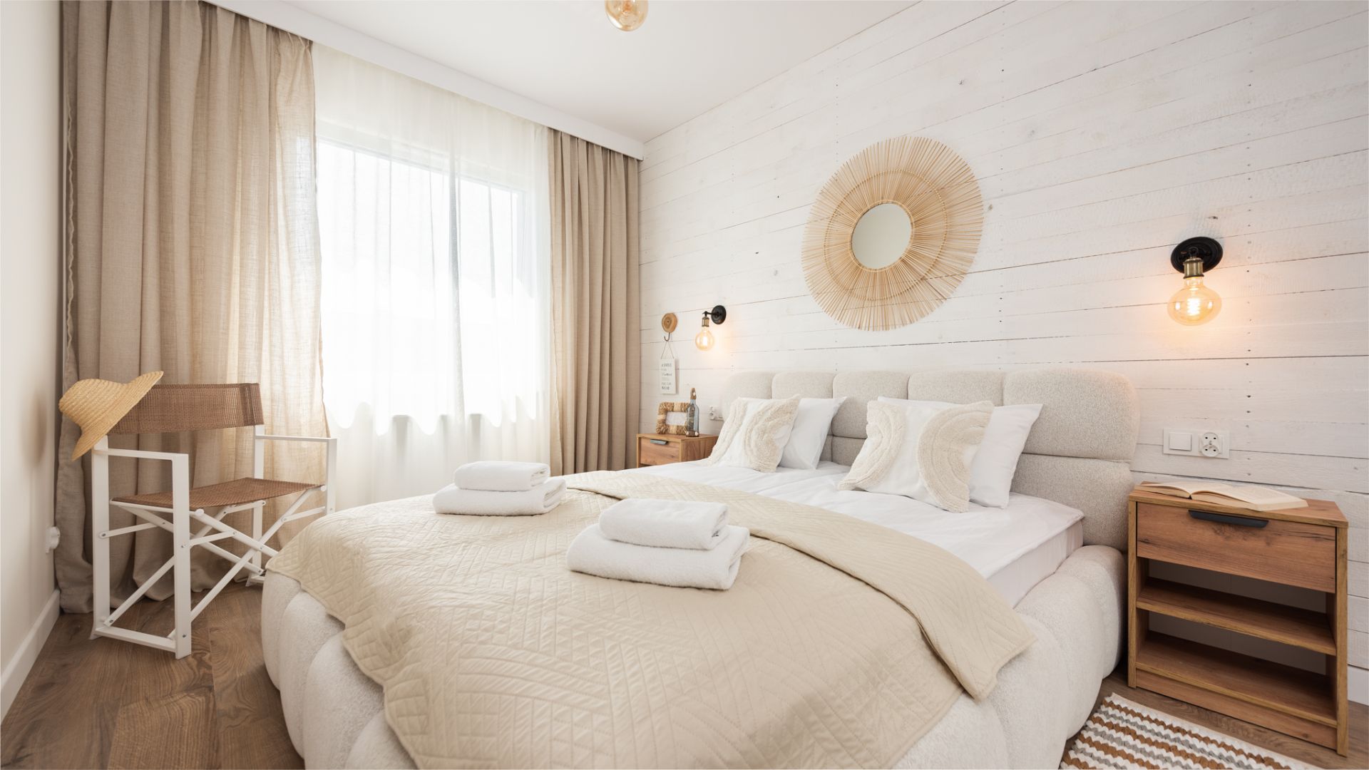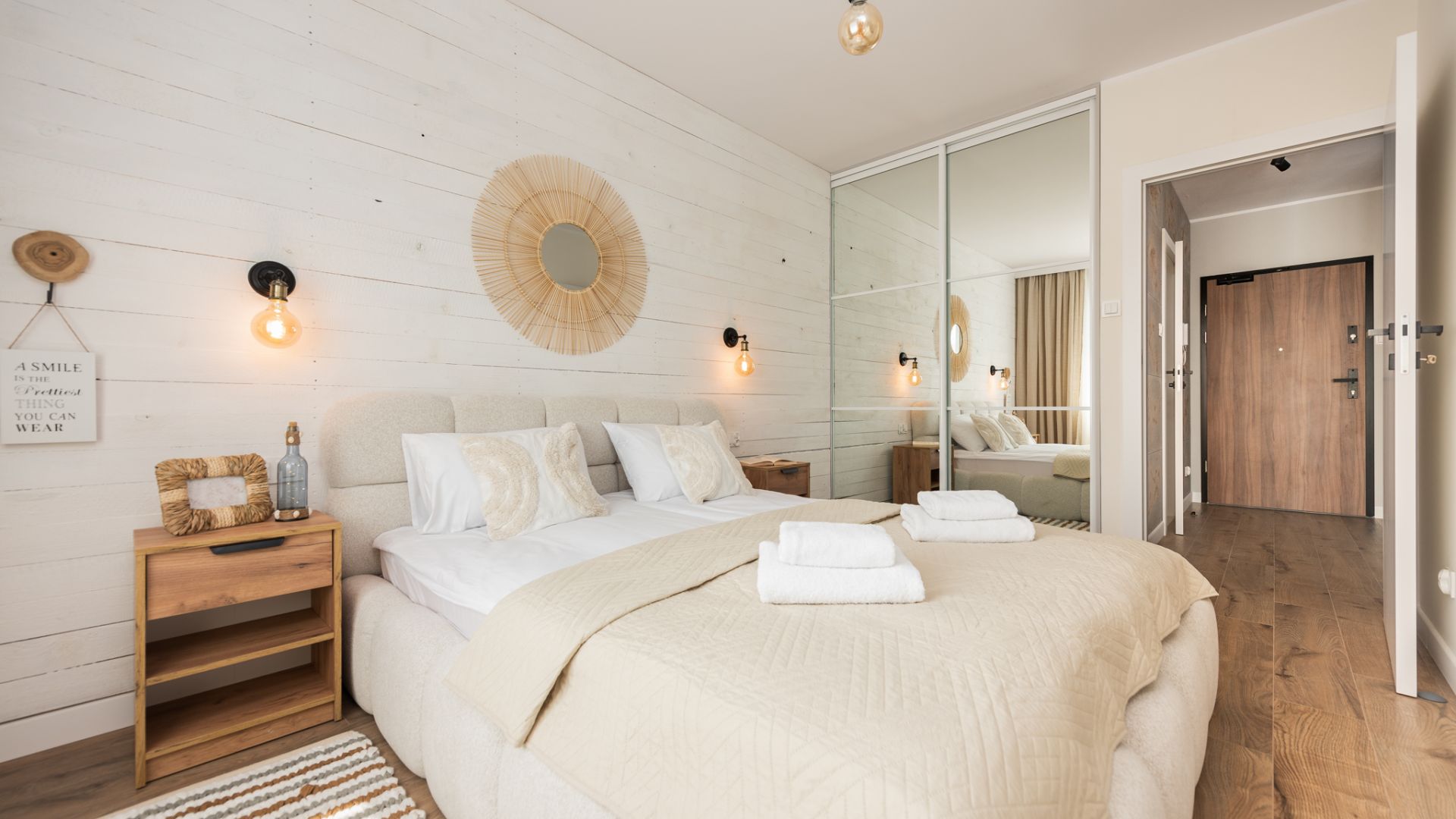 Z salonu mogą Państwo wyjść na słoneczny balkon, który jest doskonałym miejscem na odpoczynek z widokiem na okoliczną zieleń. Sypialnia została urządzona w kojących, jasnych barwach, oferując duże, komfortowe łóżko małżeńskie oraz pojemną szafę z lustrzanymi frontami, która dodaje wnętrzu przestrzeni. Nowoczesna łazienka z prysznicem typu walk-in, wykończona drewnianymi detalami, zapewnia pełną wygodę podczas pobytu. Budynek charakteryzuje się wysokim standardem wykończenia części wspólnych, oferując gościom dostęp do windy. To doskonały wybór dla osób ceniących jakość i chcących cieszyć się urokami nadmorskiego kurortu w nowoczesnym wydaniu.