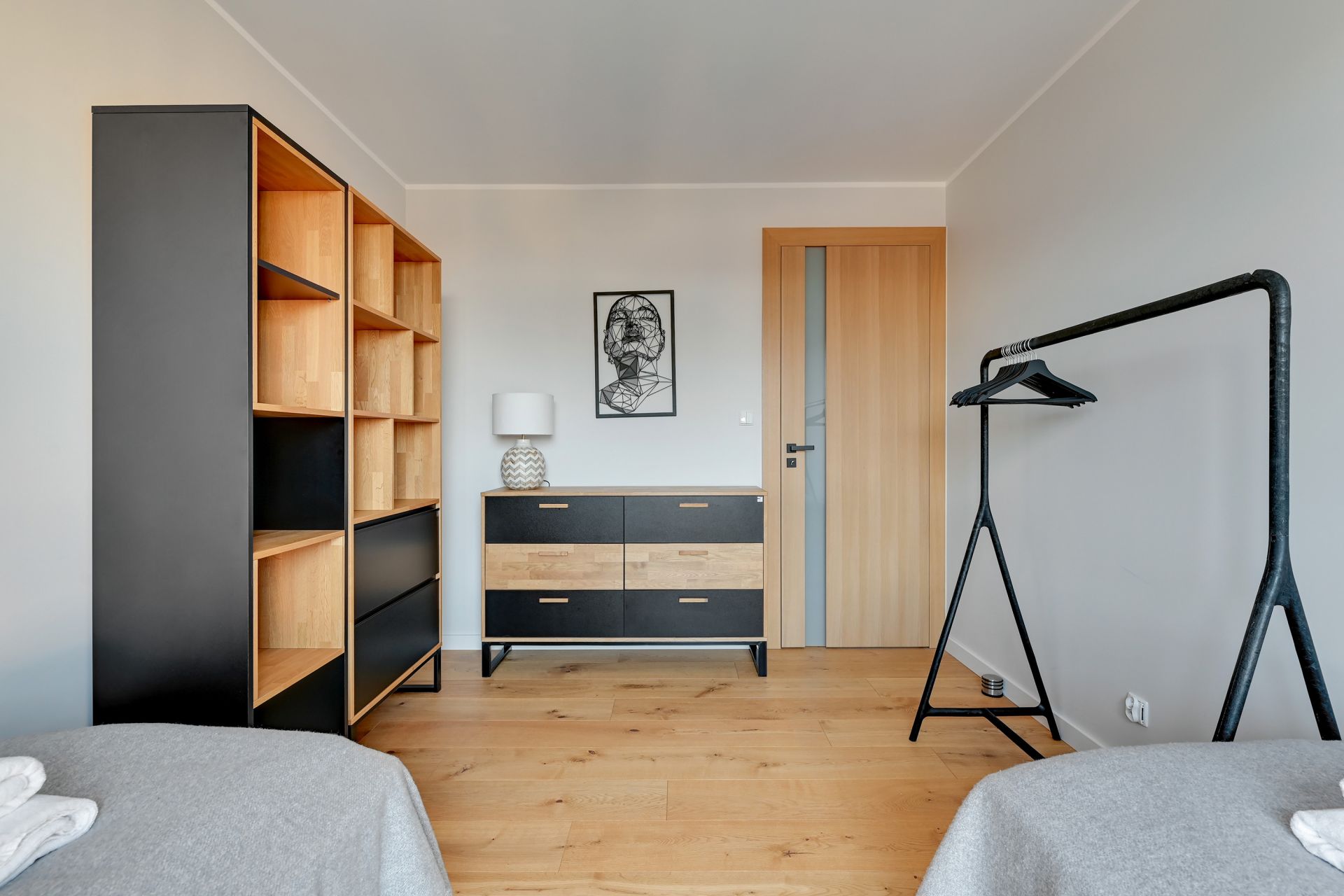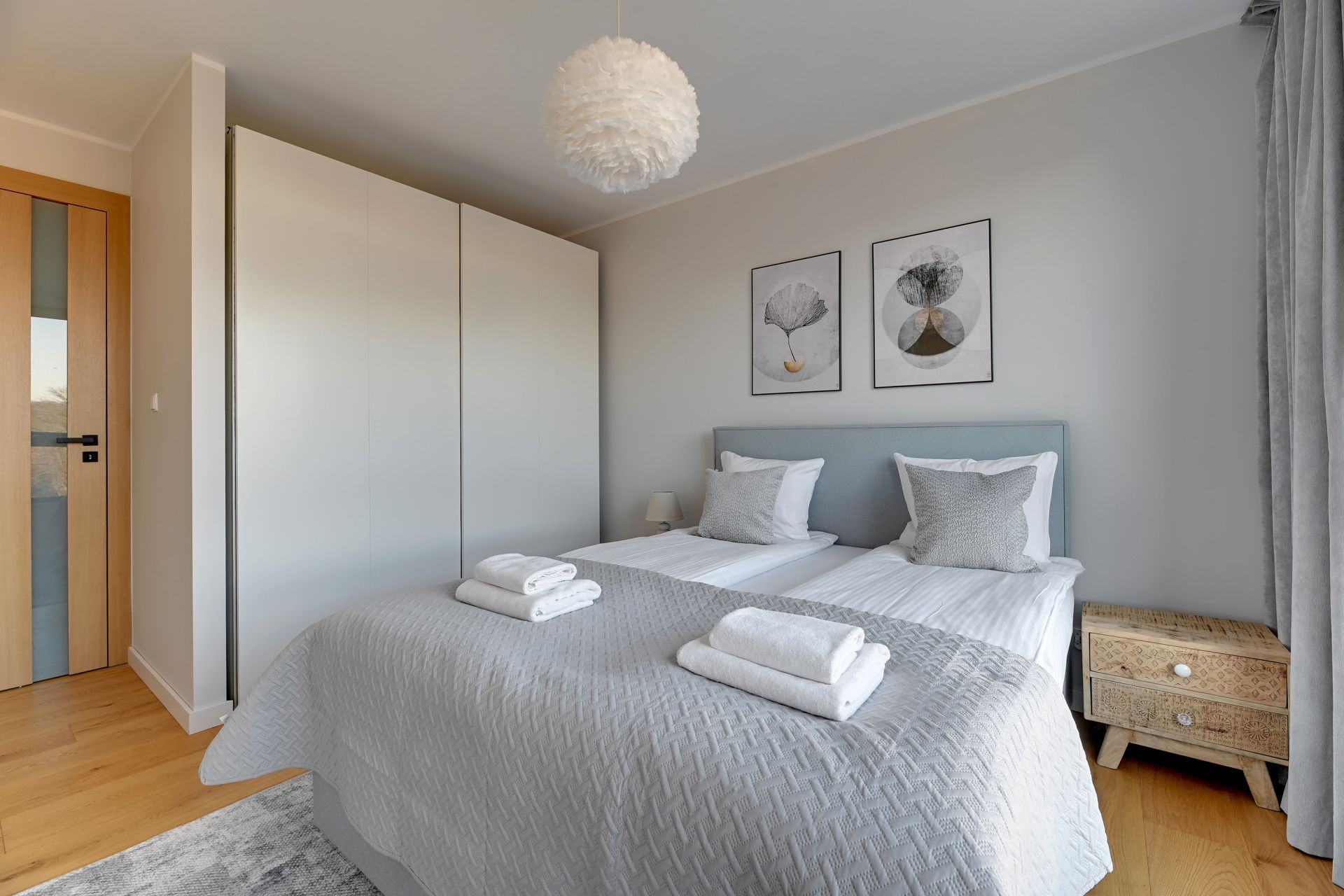 Sypialnie, urządzone w skandynawskim stylu, zapewniają komfortowy wypoczynek. Jedna sypialnia ma wygodne łóżko małżeńskie, druga dwa łóżka pojedyncze. Obie łazienki są nowoczesne i stylowe. Jedna wyposażona jest w wannę, idealną do relaksujących kąpieli, druga w prysznic typu walk-in.