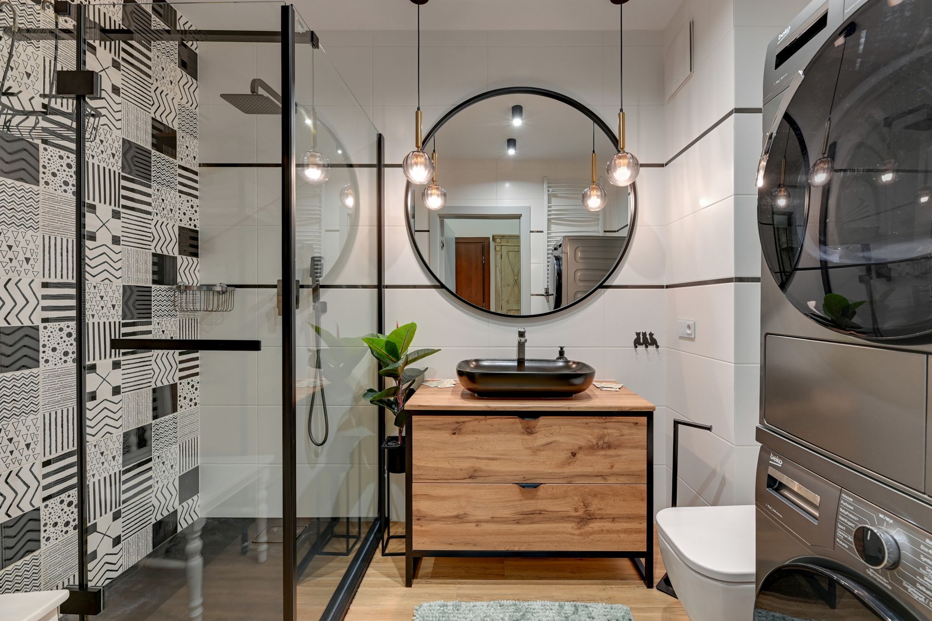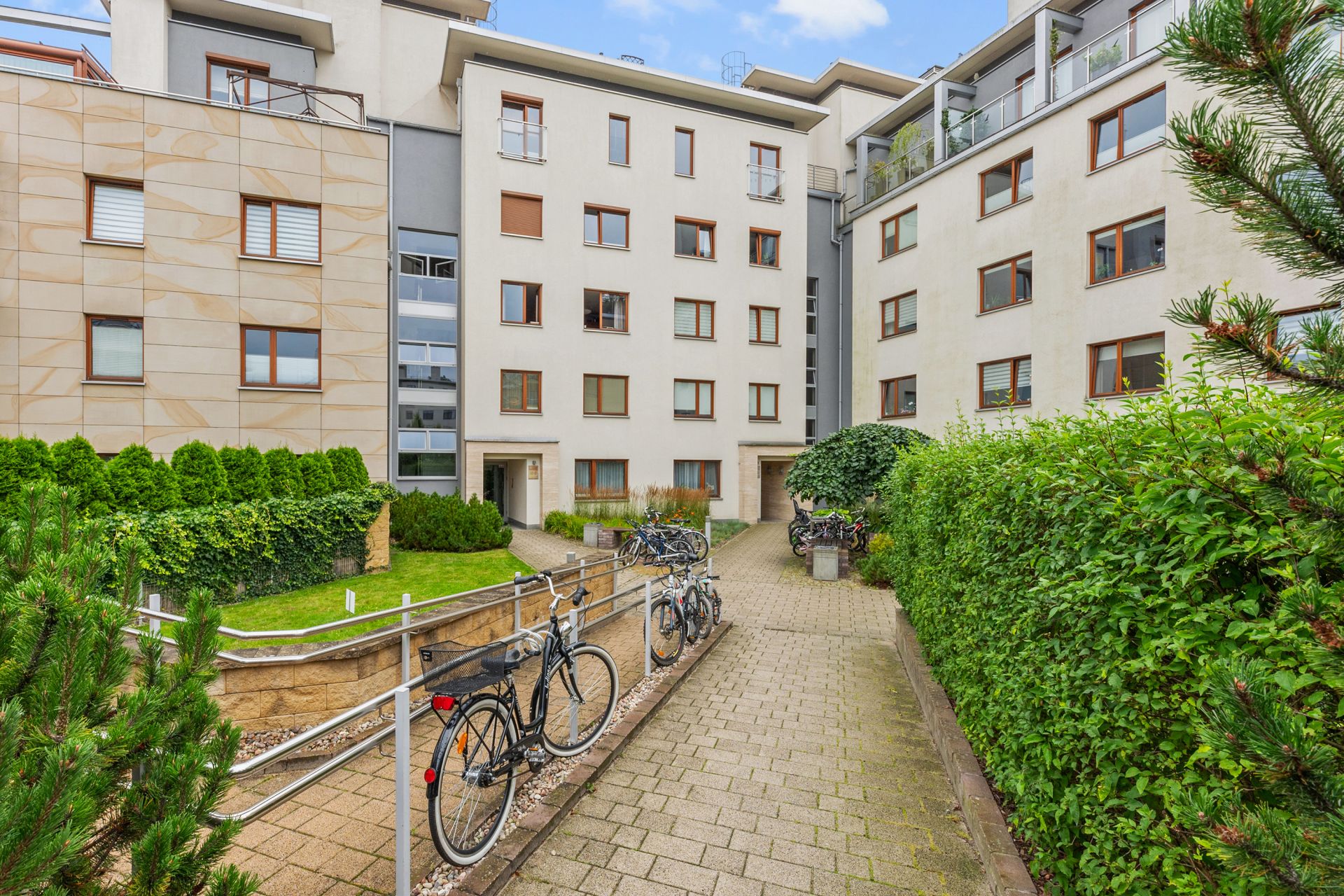 Dużym atutem apartamentu jest taras z drewnianą podłogą, otoczony zielenią. To idealne miejsce na poranną kawę, śniadanie lub wieczorny relaks. Bezpośrednie wyjście na taras zapewnia poczucie bliskości z naturą, nawet w środku miasta.