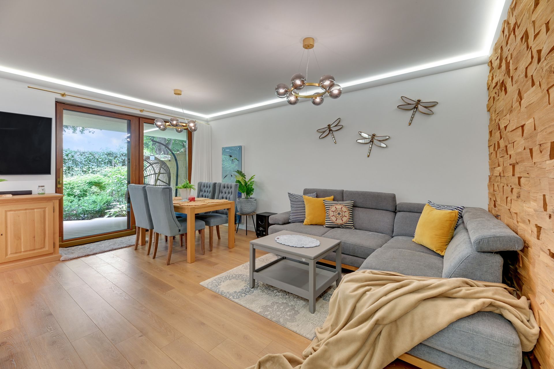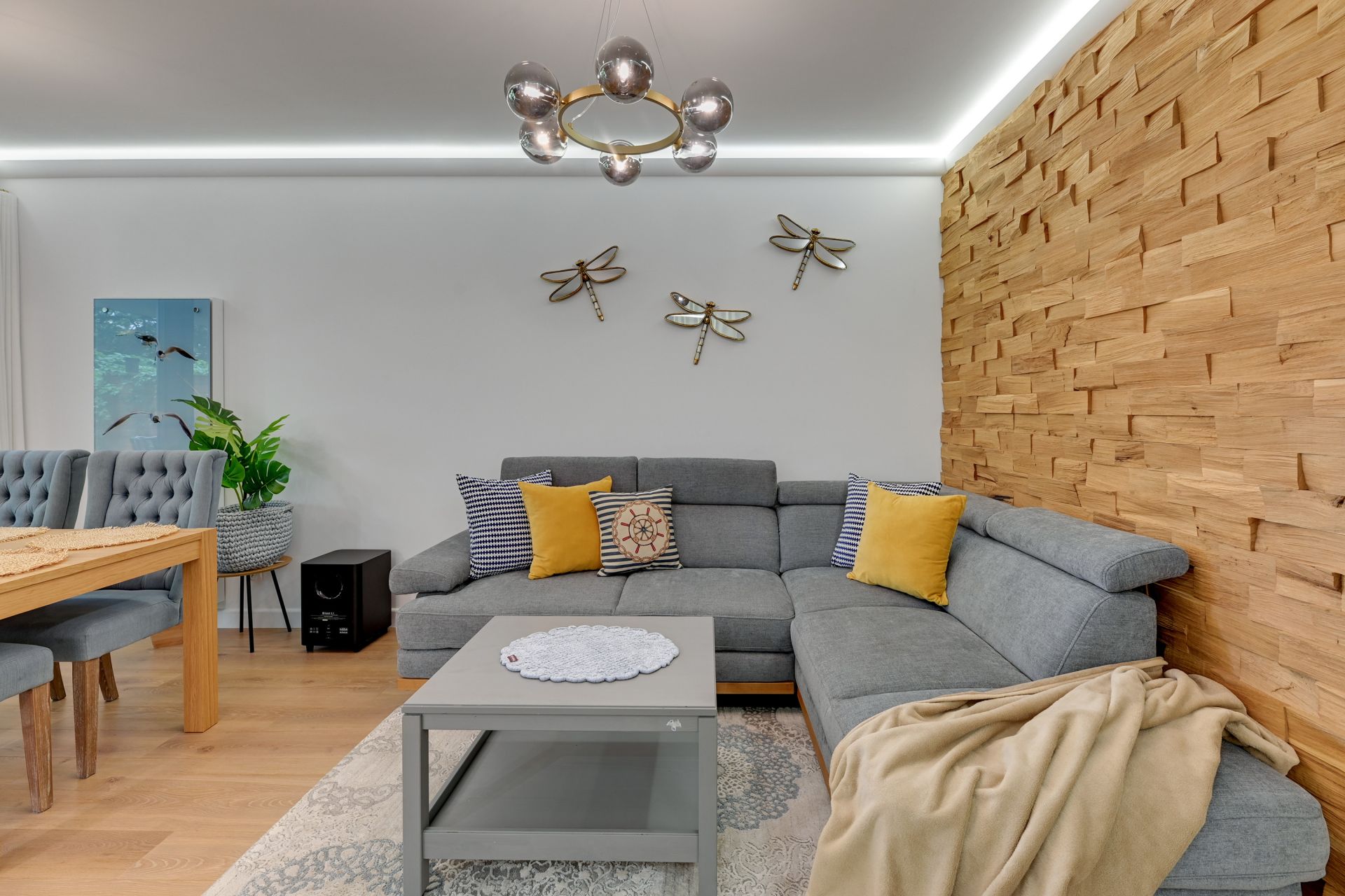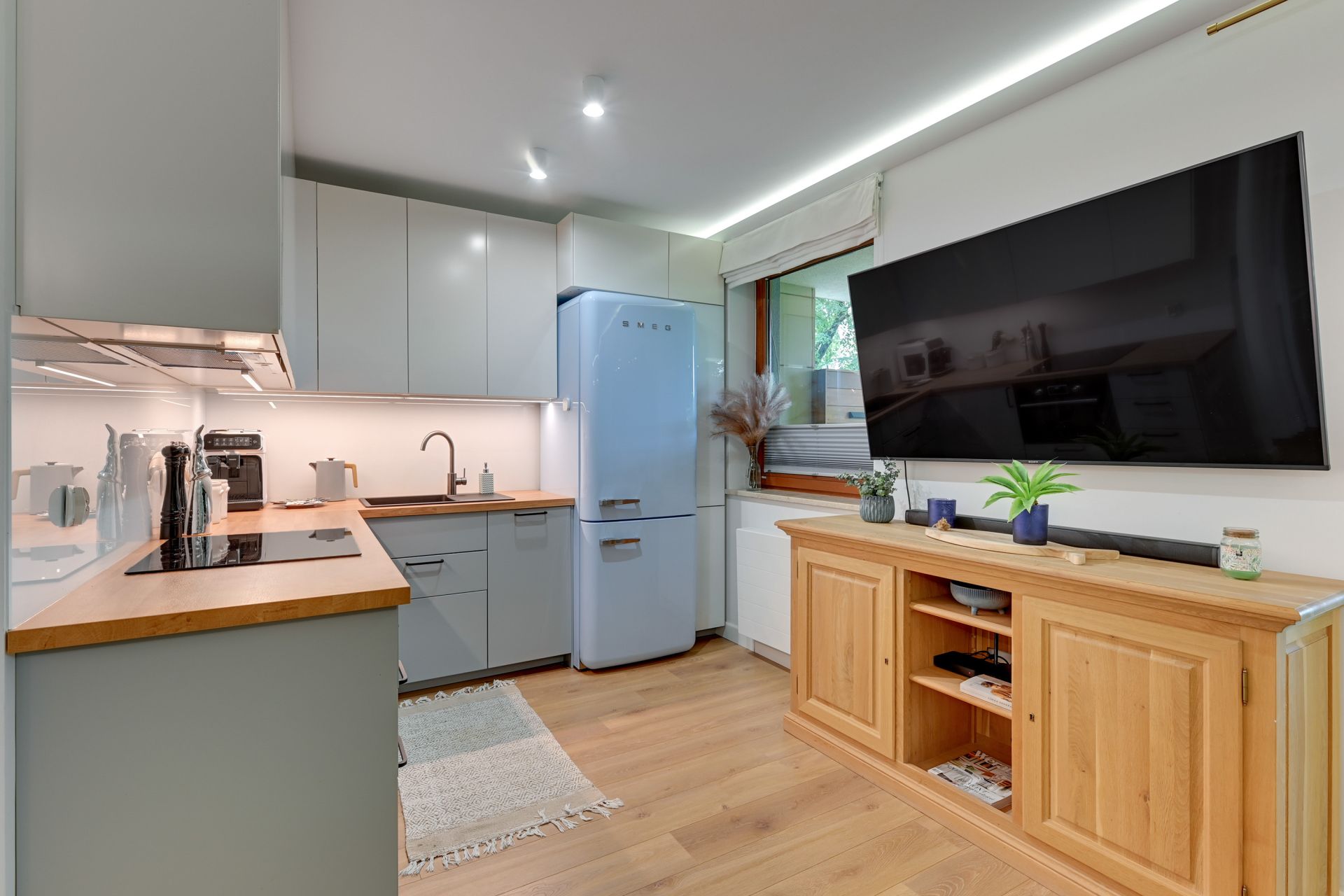 Apartament został zaprojektowany z myślą o przytulnym, ale nowoczesnym stylu. Sercem apartamentu jest przestronny salon, który łączy się z jadalnią i w pełni wyposażoną kuchnią. Zwraca uwagę designerska lodówka SMEG, która dodaje wnętrzu unikalnego charakteru. W salonie znajduje się duża, wygodna sofa narożna, która po rozłożeniu tworzy dodatkowe miejsce do spania dla dwóch osób.
