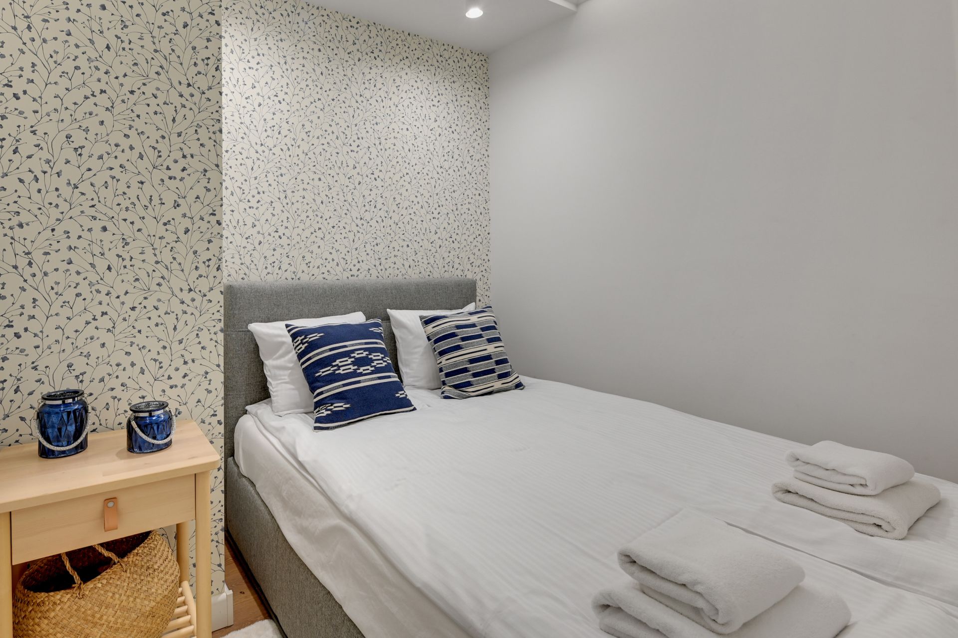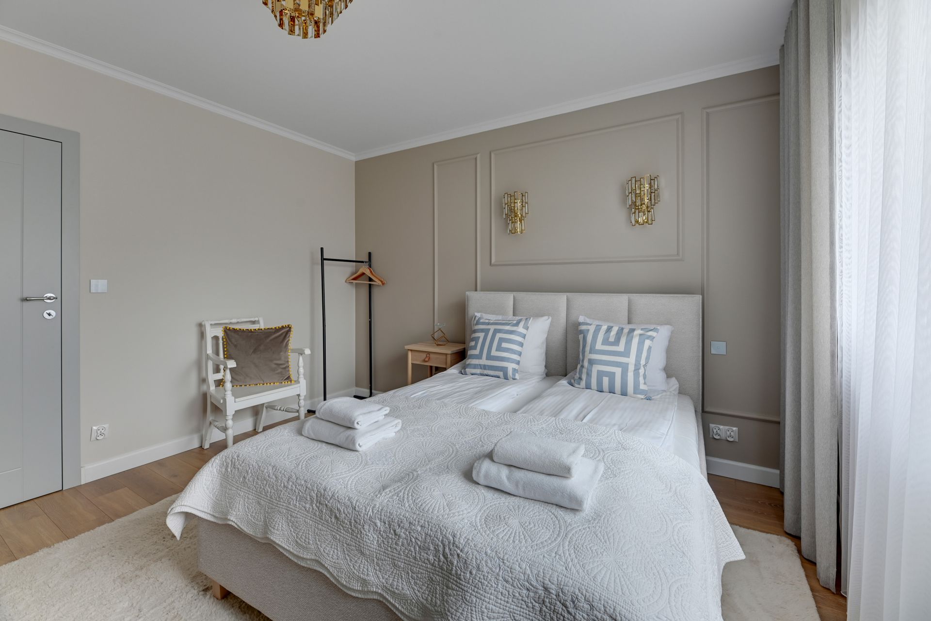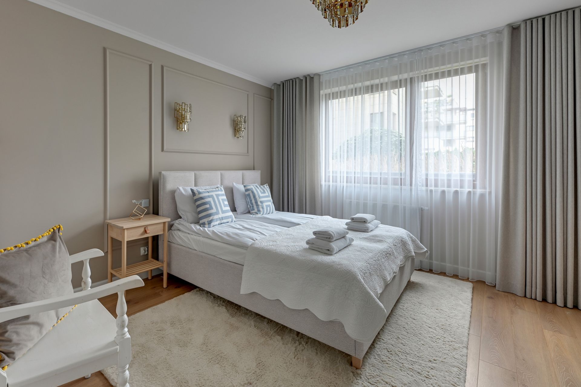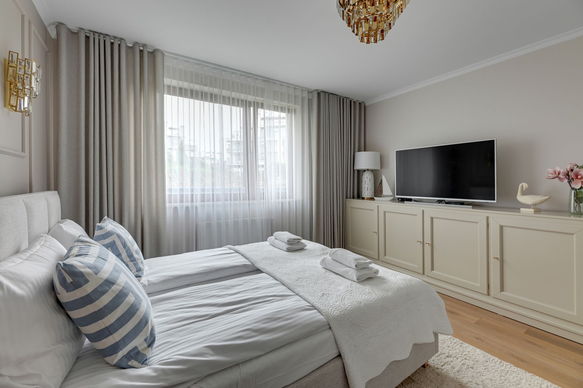 Do dyspozycji gości są dwie niezależne sypialnie, każda wyposażona w komfortowe łóżko podwójne. To idealne rozwiązanie dla dwóch par lub rodzin z dziećmi, które potrzebują dodatkowej przestrzeni i prywatności. W obu sypialniach zadbano o detale, które zapewniają relaksujący sen.