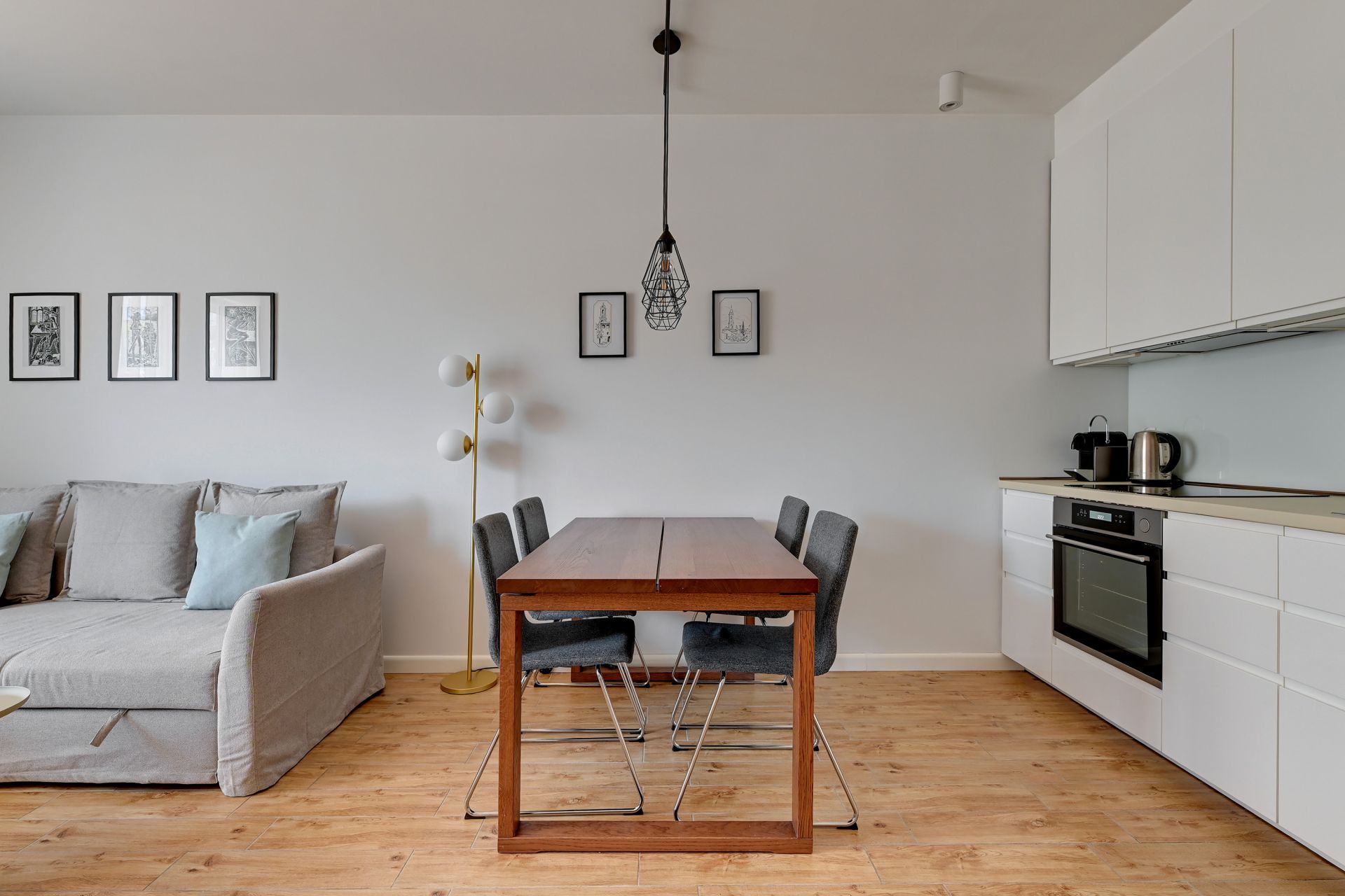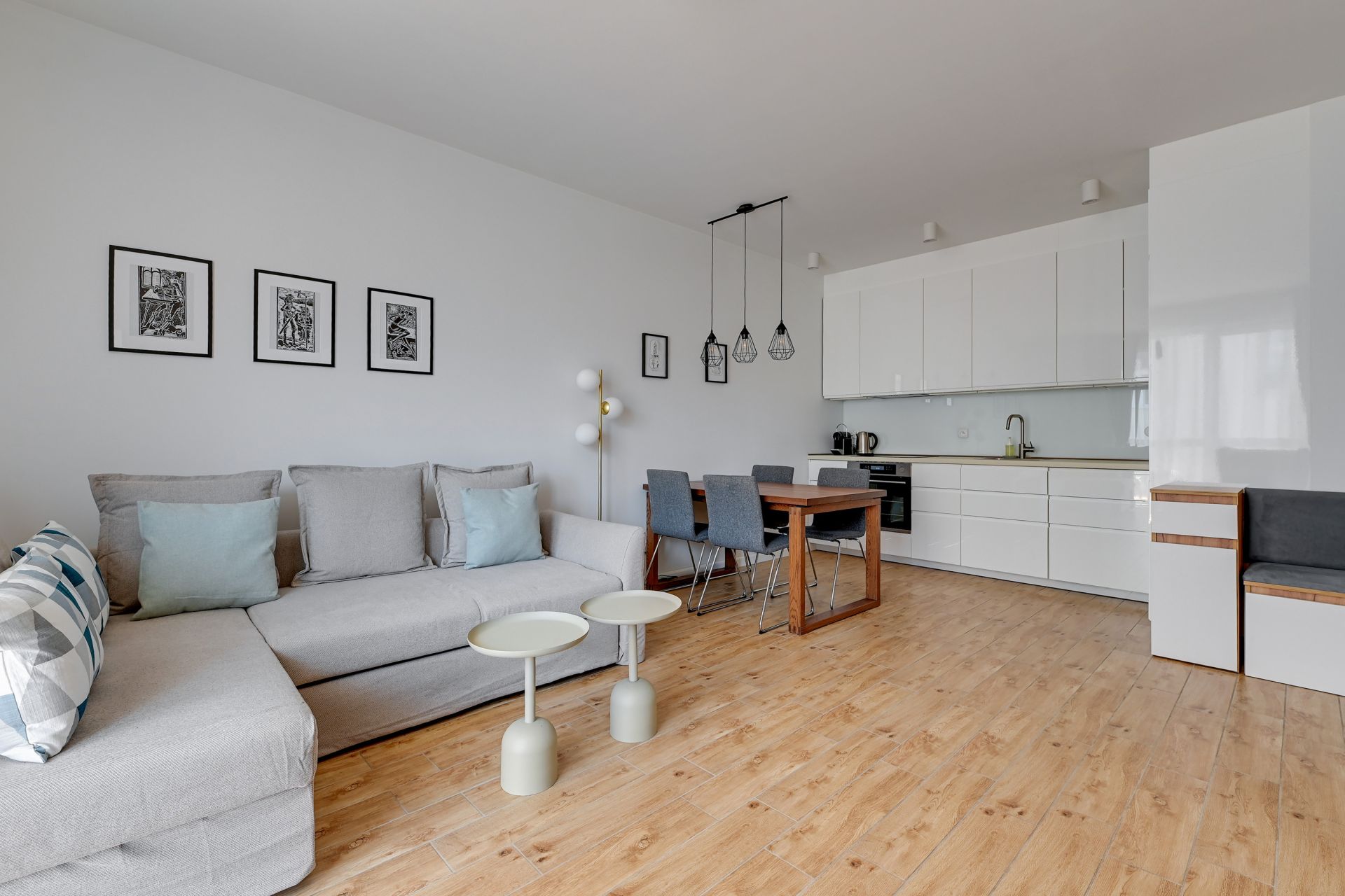 Apartament składa się z przytulnego salonu z wygodną sofą (z możliwością rozłożenia do spania dla dwóch osób), telewizorem oraz częścią jadalną. Nowoczesny aneks kuchenny jest w pełni wyposażony we wszystkie niezbędne sprzęty AGD (lodówka, płyta grzewcza, piekarnik, czajnik) oraz naczynia i sztućce, co umożliwia swobodne przygotowywanie posiłków.