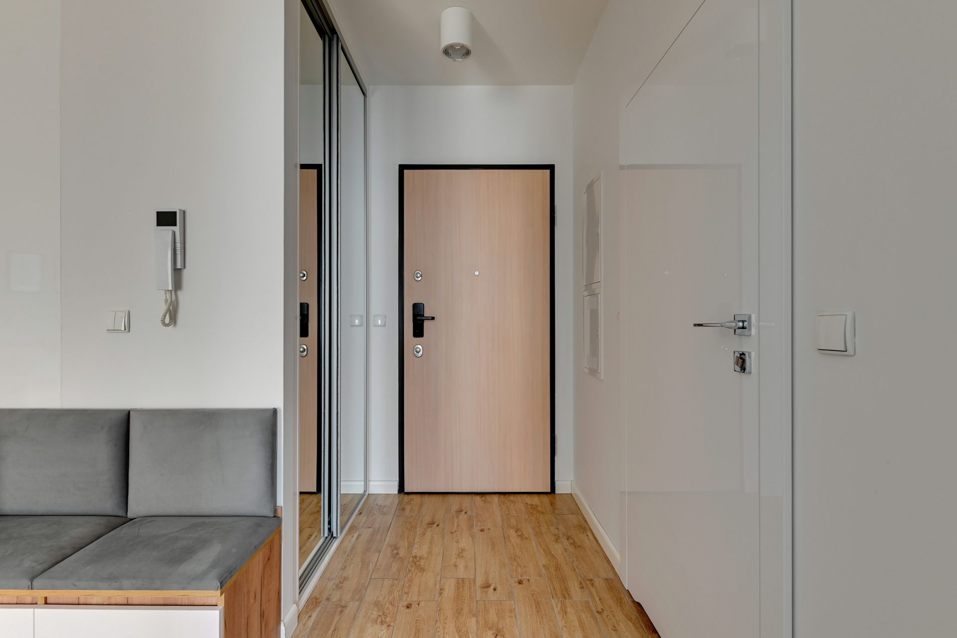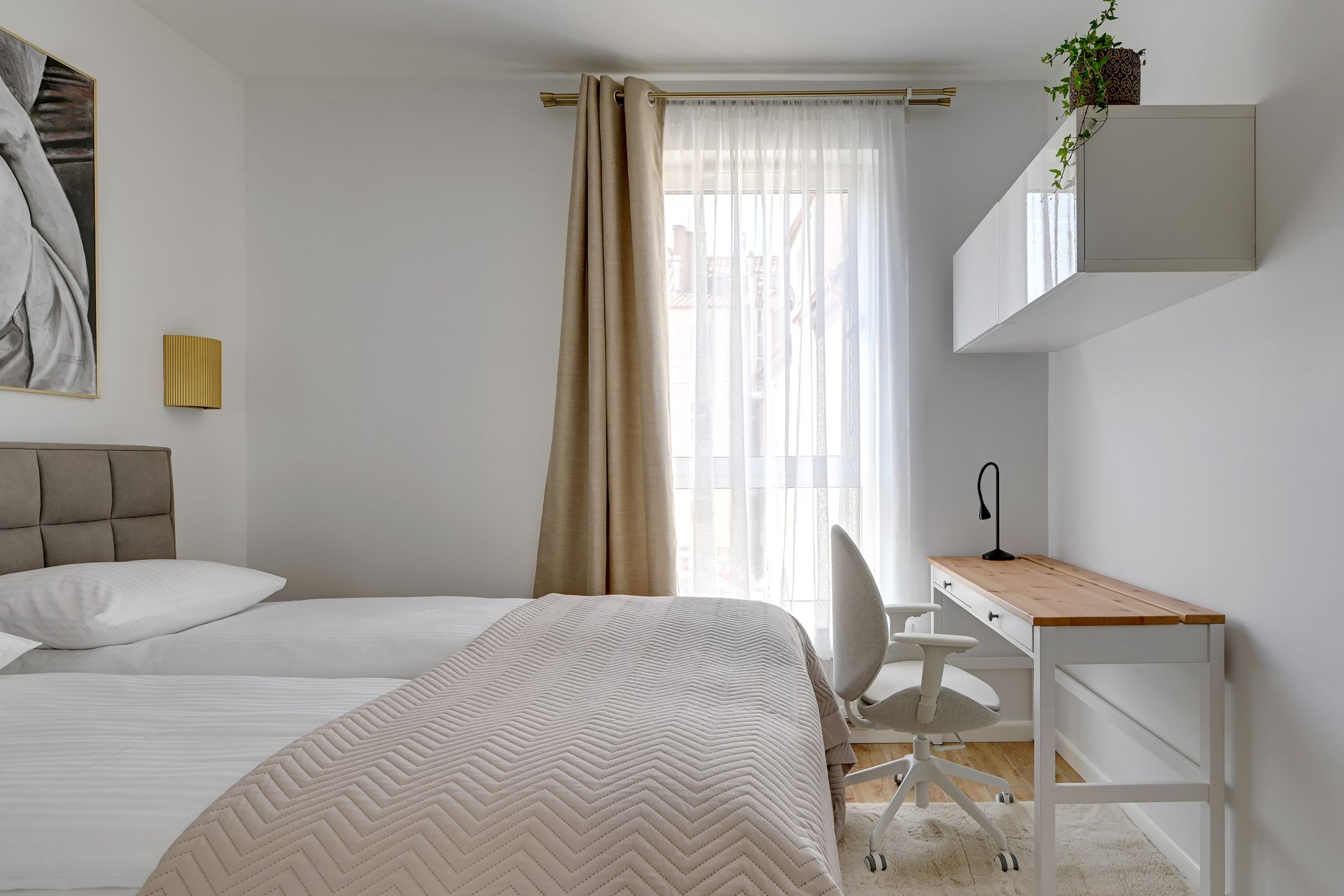 Oddzielna sypialnia wyposażona jest w wygodne łóżko podwójne, zapewniające spokojny sen. Dodatkowo, w sypialni znajduje się praktyczne biurko z krzesłem, idealne do pracy zdalnej lub planowania kolejnych dni zwiedzania.