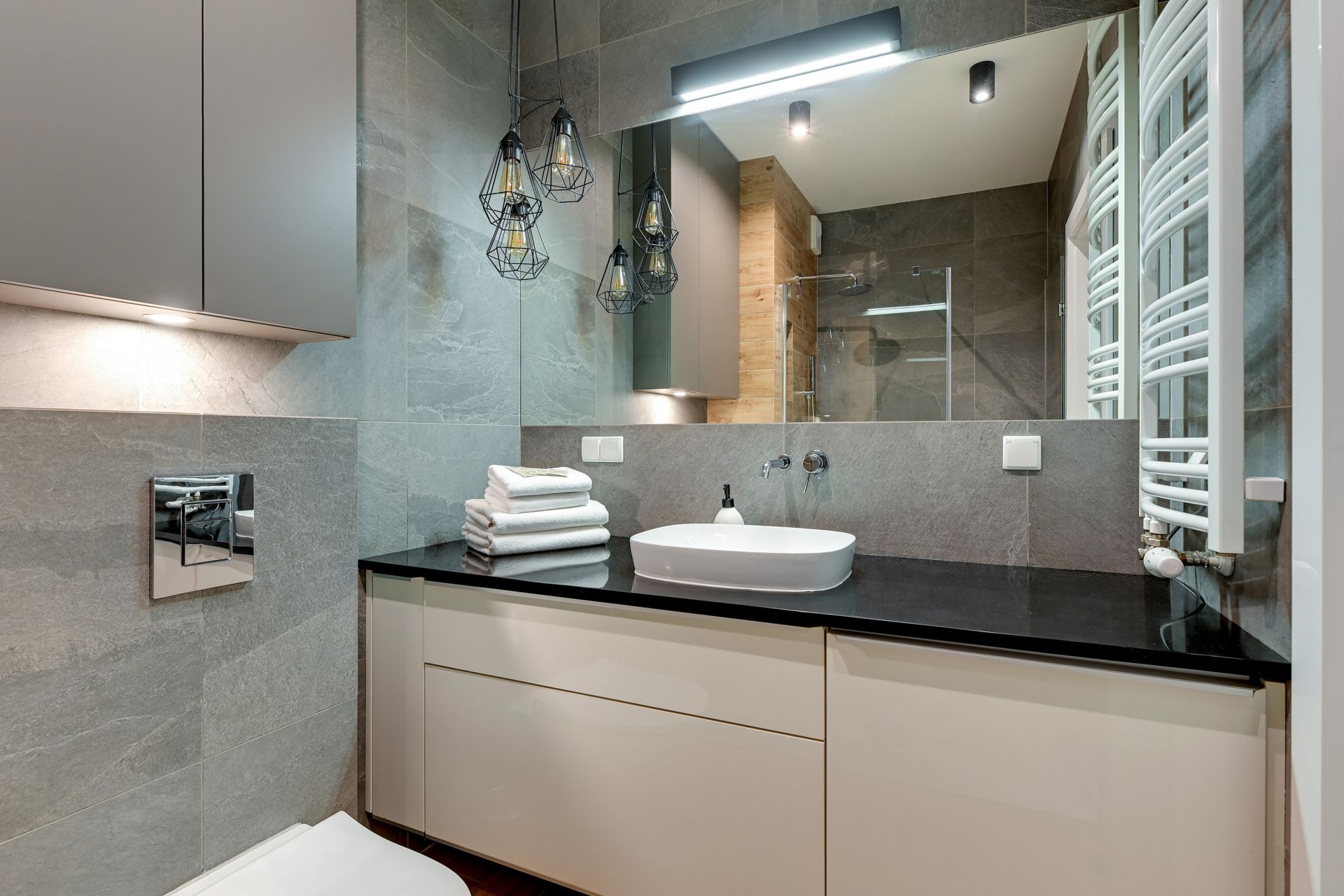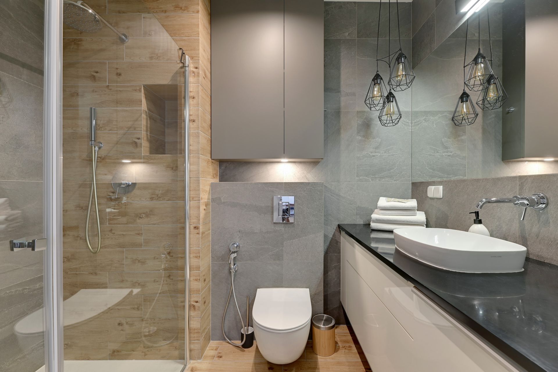 Nowoczesna łazienka z prysznicem i pralką podnosi komfort pobytu, szczególnie podczas dłuższych wyjazdów.