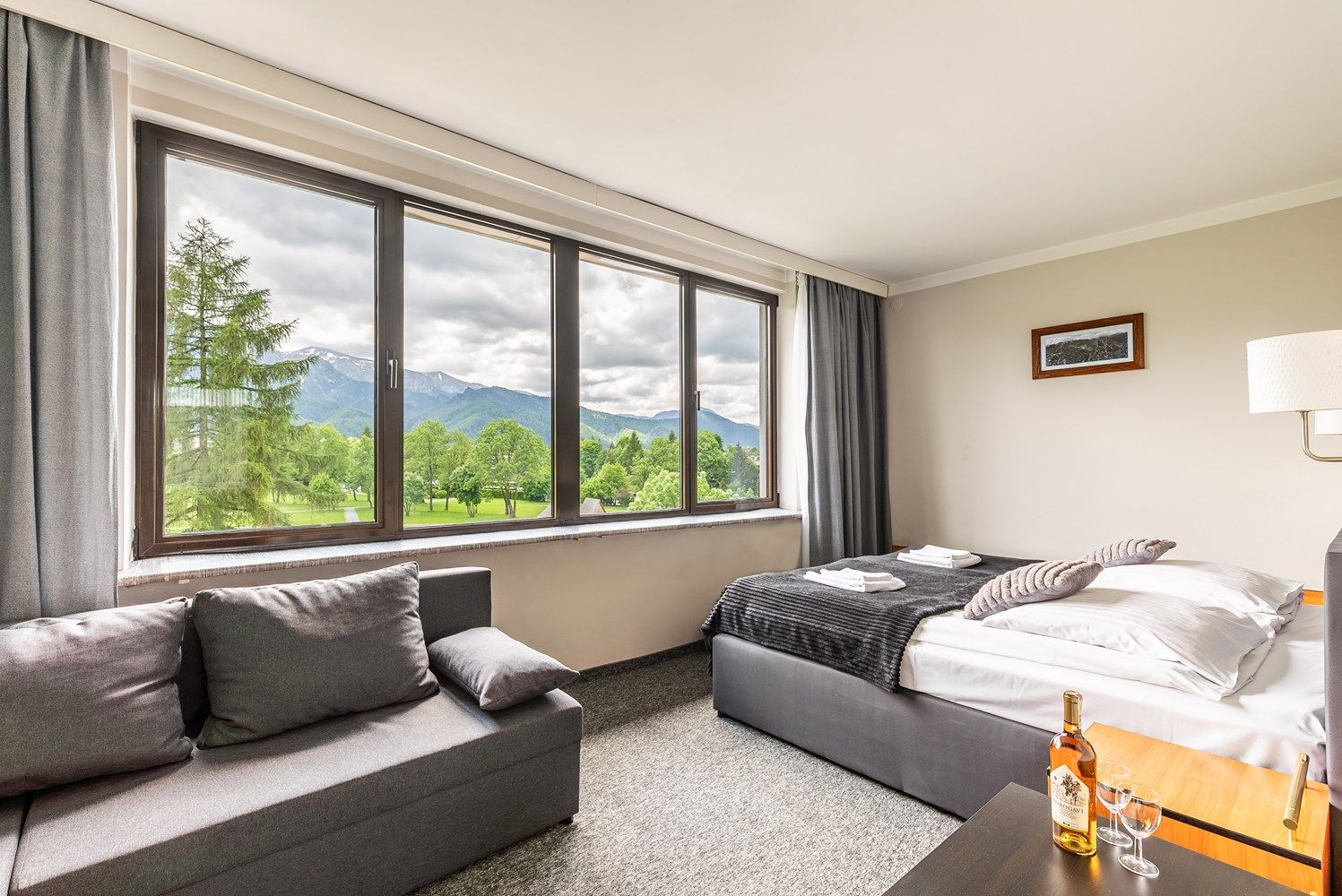 Wygodny, słoneczny pokój z łazienką. Idealny na weekend w Zakopanem. Sprawdzi się też w czasie tygodniowego lub dłuższego pobytu, a rozkładana sofa może posłużyć jako łóżko dla dwójki dzieci. Pokój 2-osobowy to klasycznie urządzony pokój hotelowy. Duże okna wychodzą wprost na Giewont i zieloną Rówień Krupową. Pokój wyposażony jest w dwa pojedyncze lub jedno podwójne łóżko. Dodatkowo dla dzieci 2 osobowa rozkładana sofa.